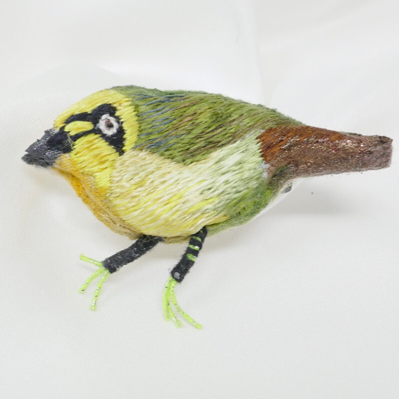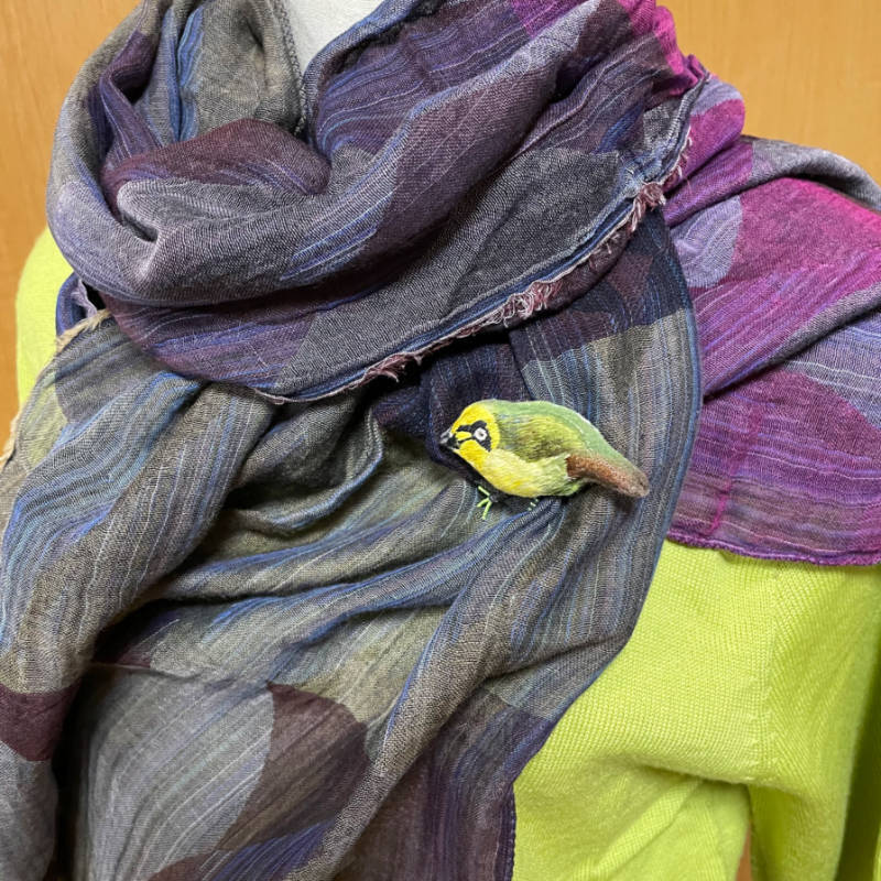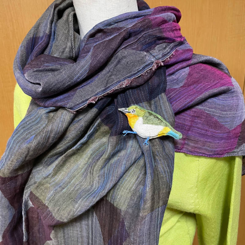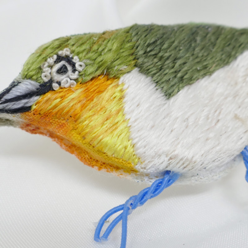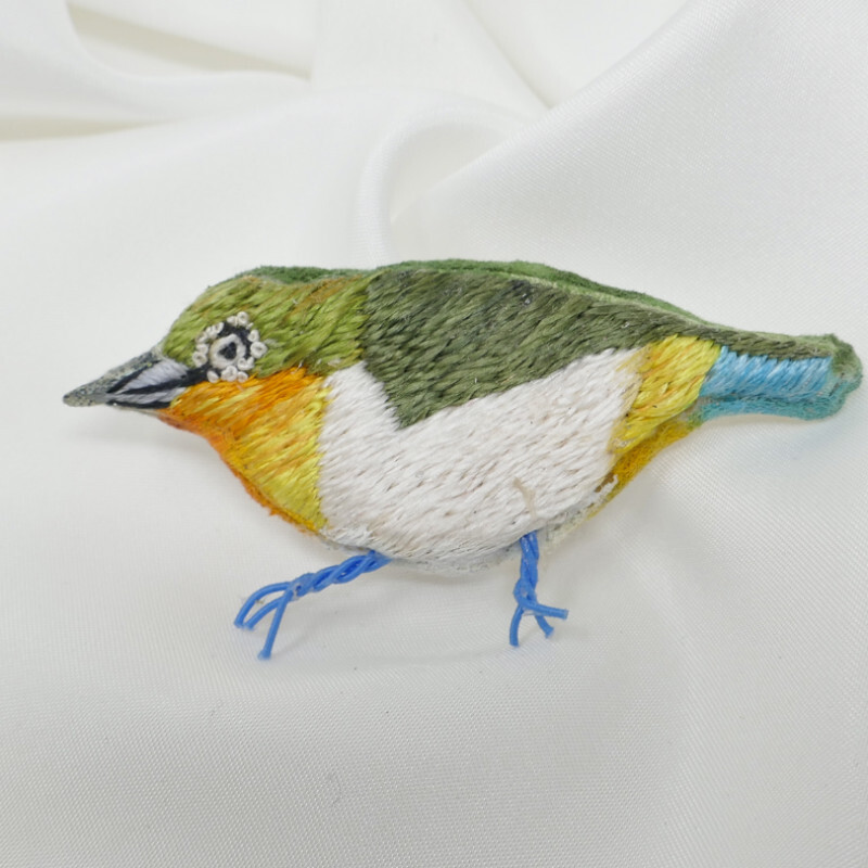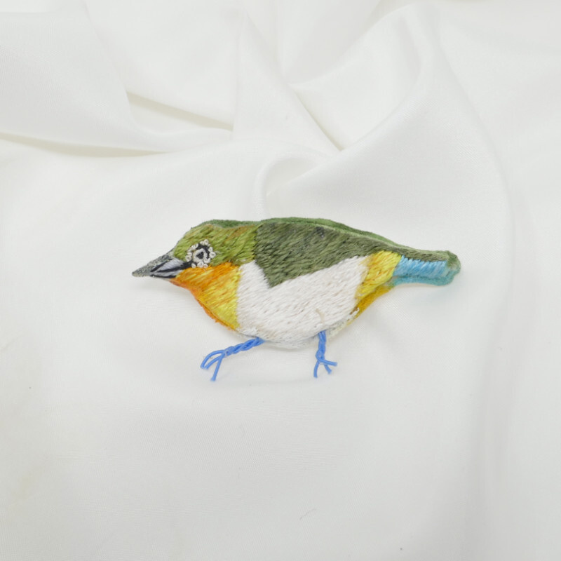 日本刺繍の技法で作り出されたメジロはとても可愛らしく、バッグや帽子、服の胸元にも可愛い作品です。