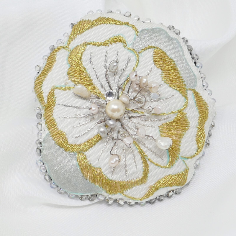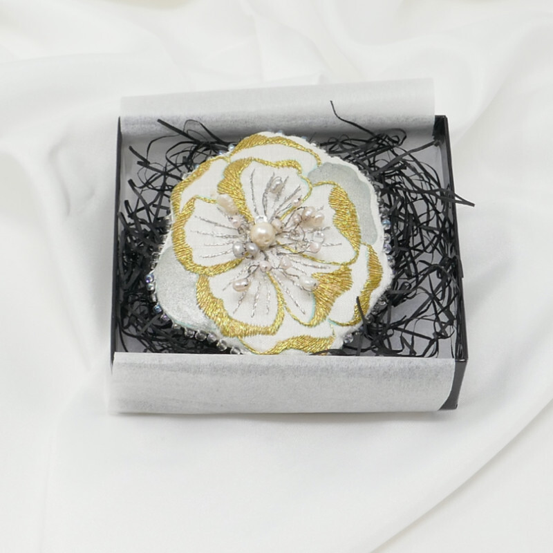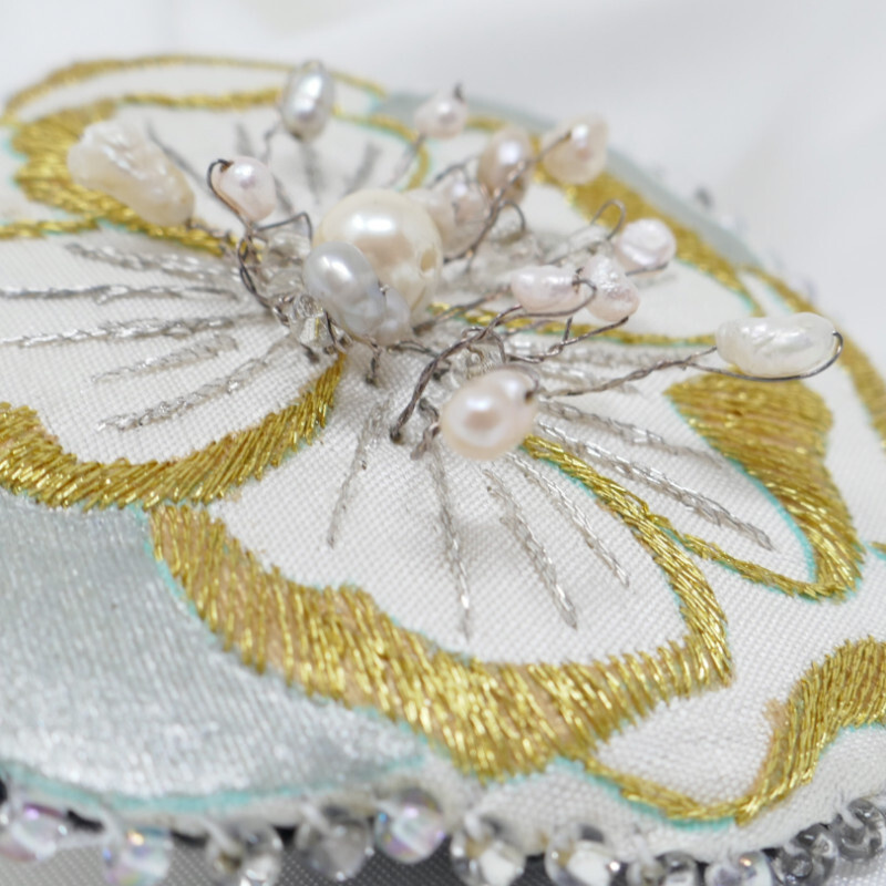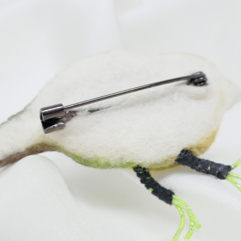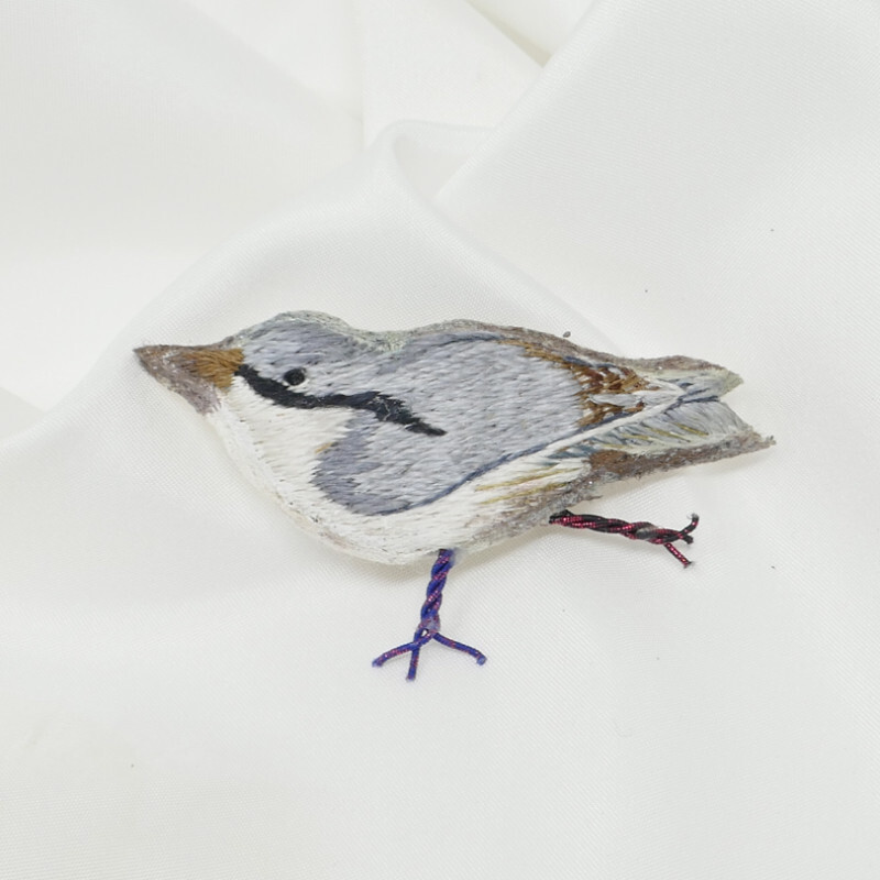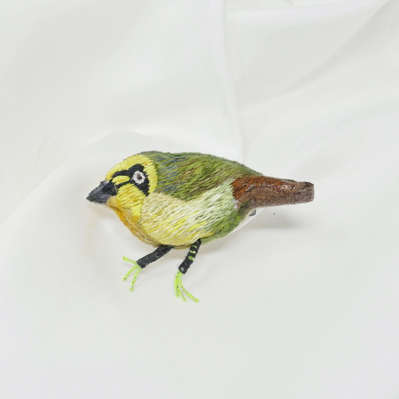 日本刺繍の技法で作り出されたメジロはとても可愛らしく、バッグや帽子、服の胸元にも可愛い作品です。