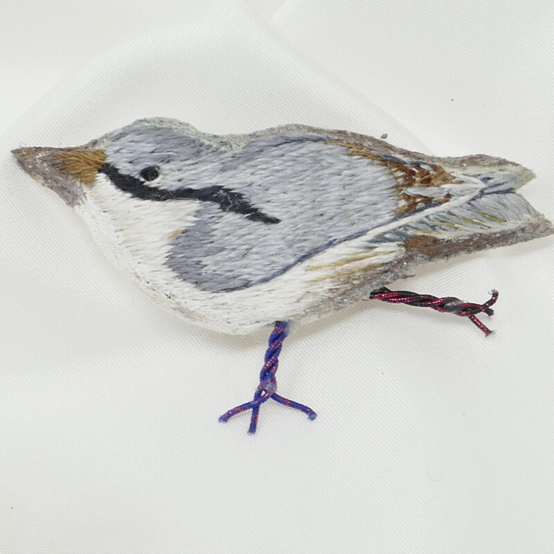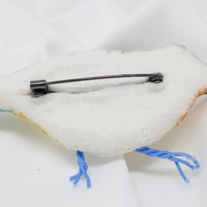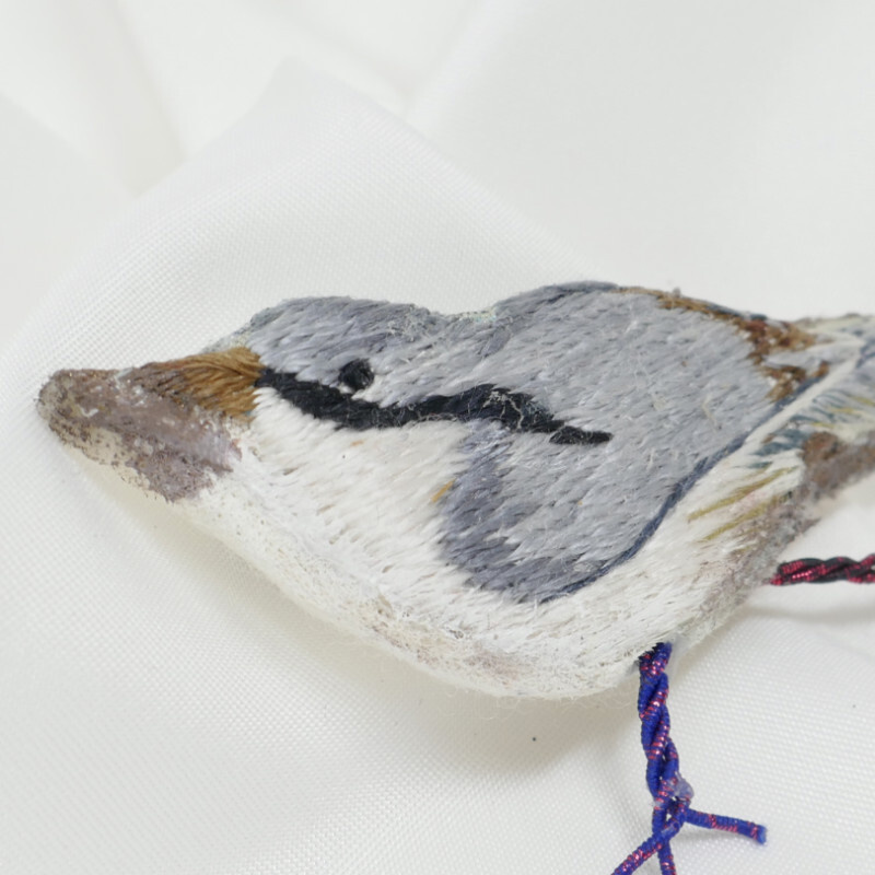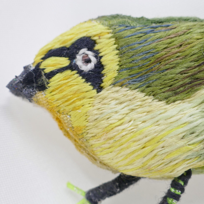 複雑なメジロのグリーンを加々美さんのオリジナルの染糸が見事に表現してくれています。足と尾のブルーもアクセントになって可愛いですね。