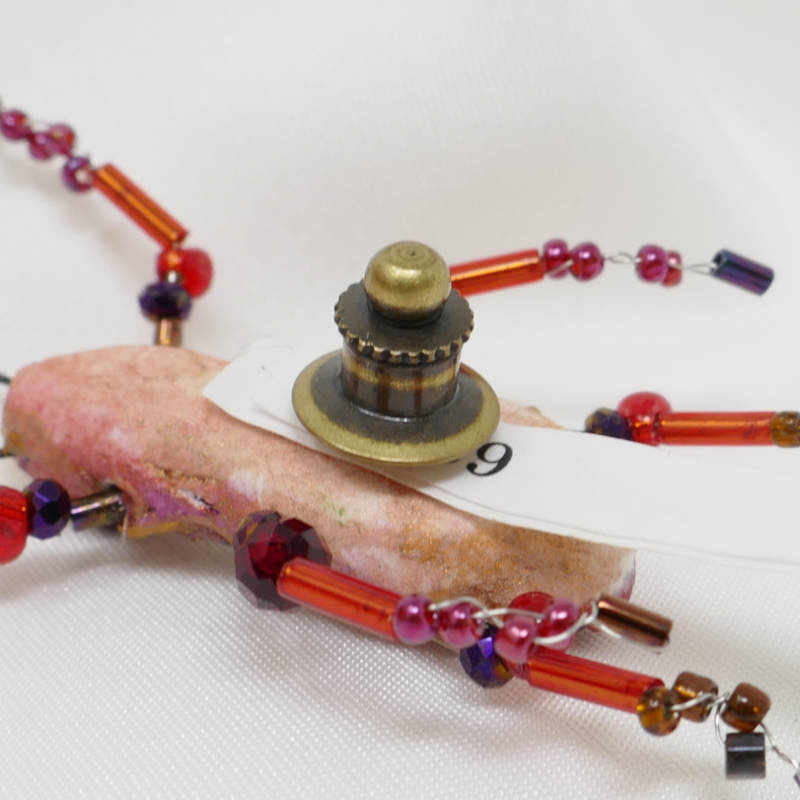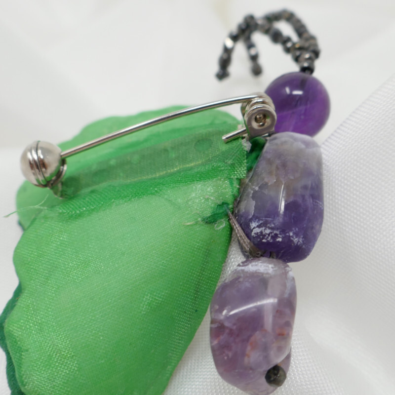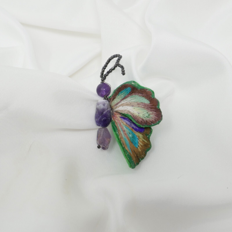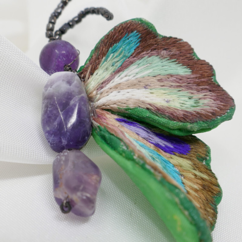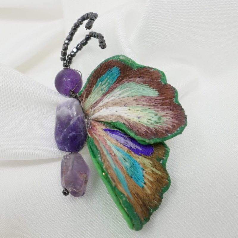 蝶の羽の美しさに惹かれ 多彩な色で日本刺繍の刺し縫いの技法で作りました。立体的に仕上げてあります。胴体は天然石を使いました。