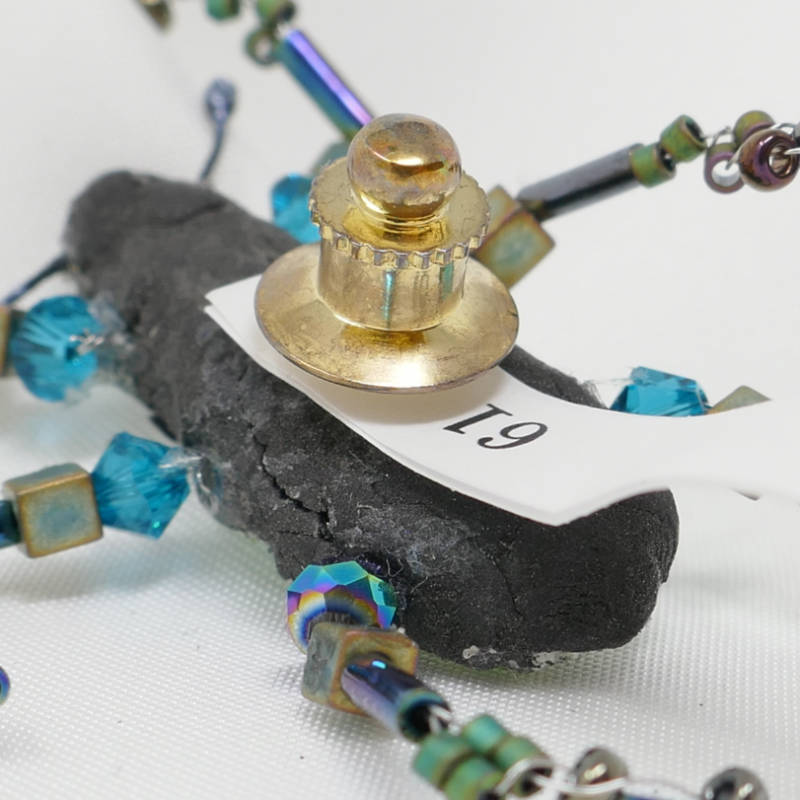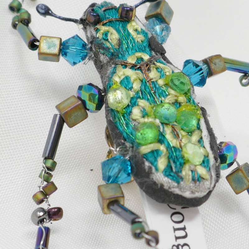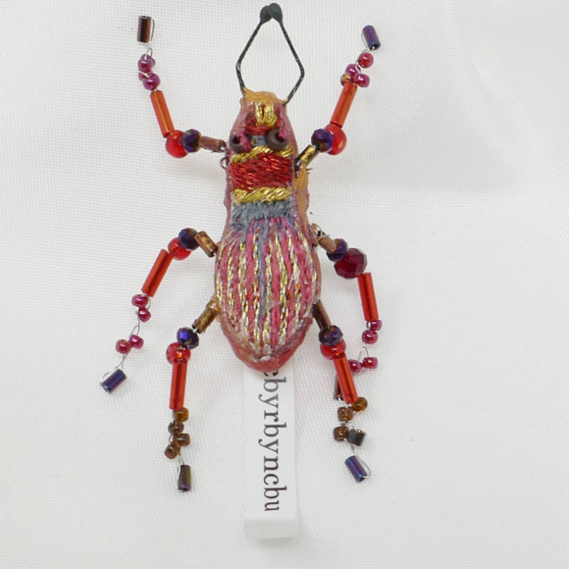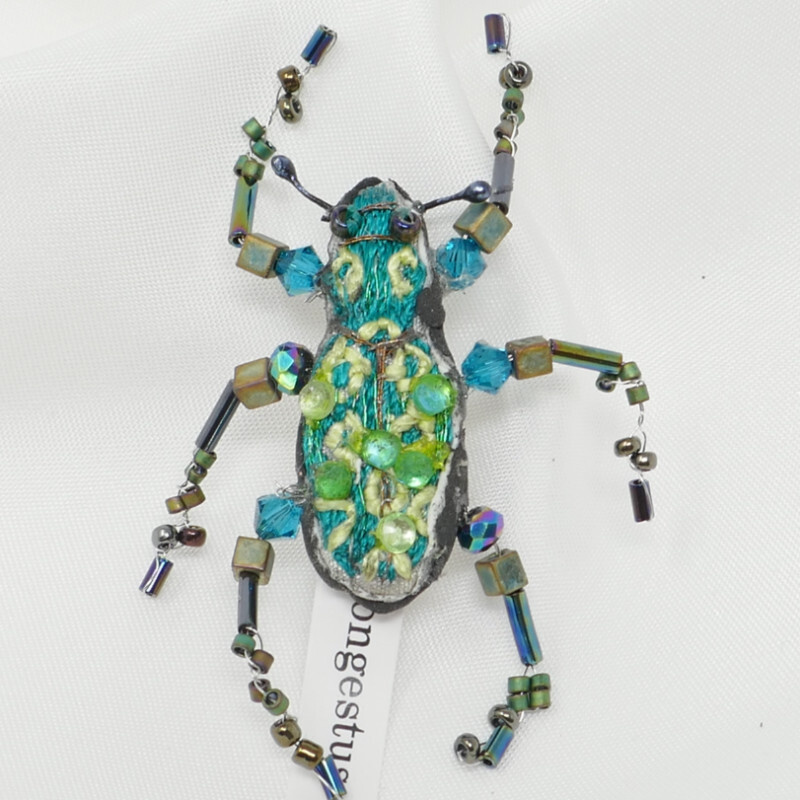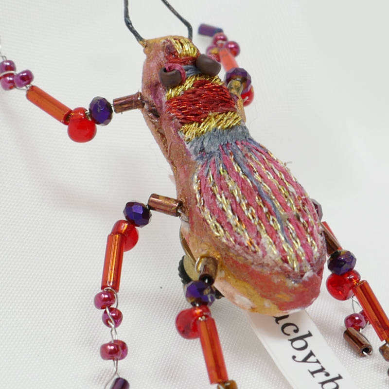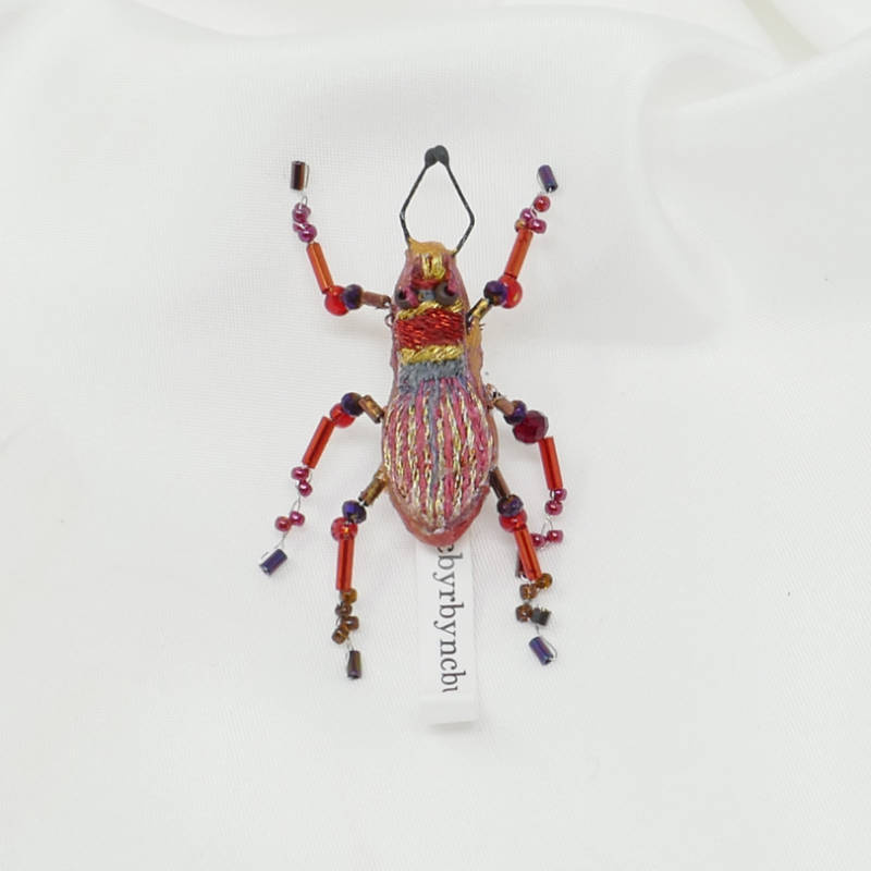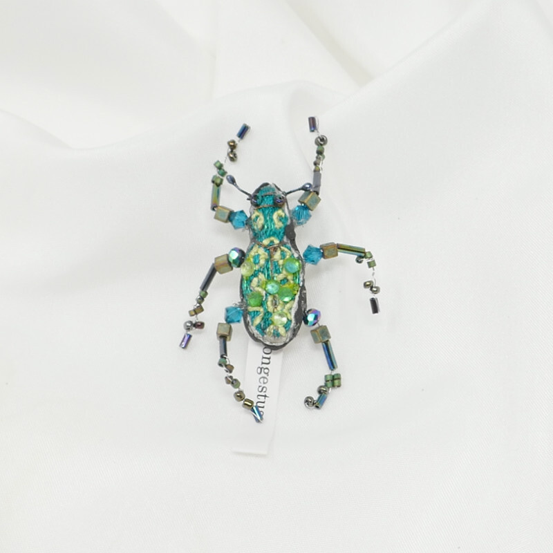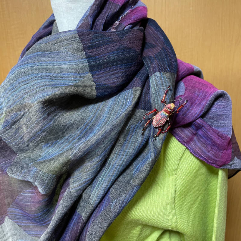 ゾウムシは飛べませんが硬さで身を守ってます。美しい模様が多く日本の美意識を象徴する伝統紋様を想起させる面白さがあります。粋な縦縞模様もその一つです。グロテスクにせず脚はビーズを使い軽やかに見えるように工夫しました。