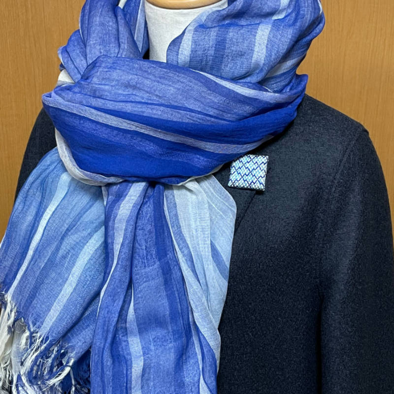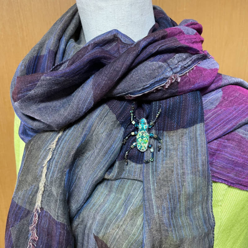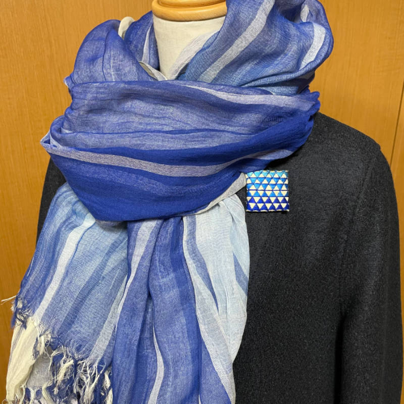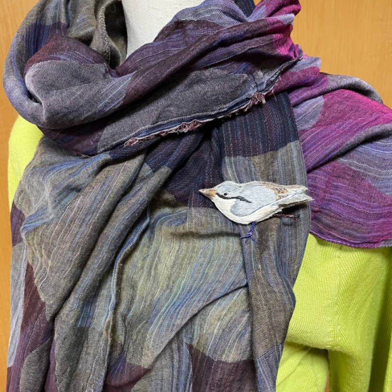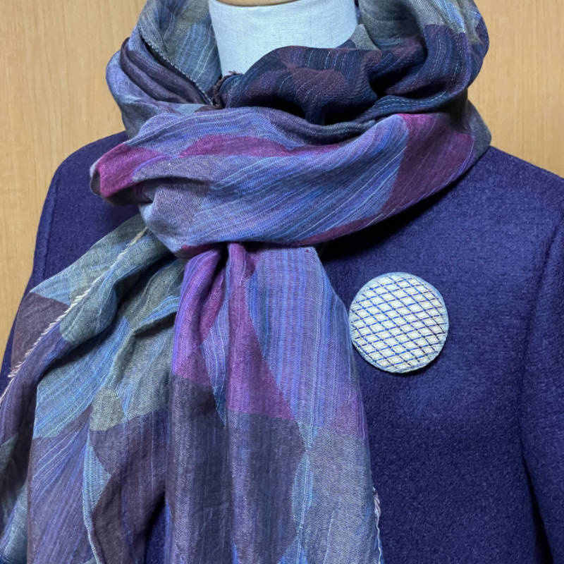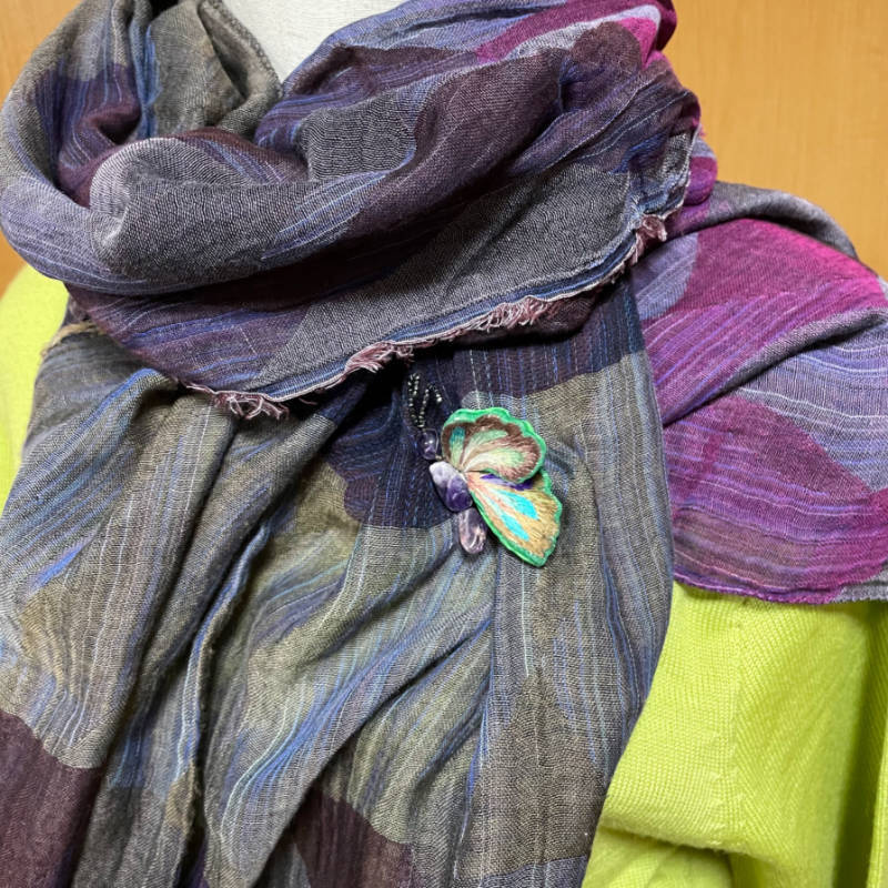 加々美さんの手により繍されたこの作品は、洋装とも意外なほどマッチし、無地のコートやジャケットなどをひと味違う着こなしにしてくれます。