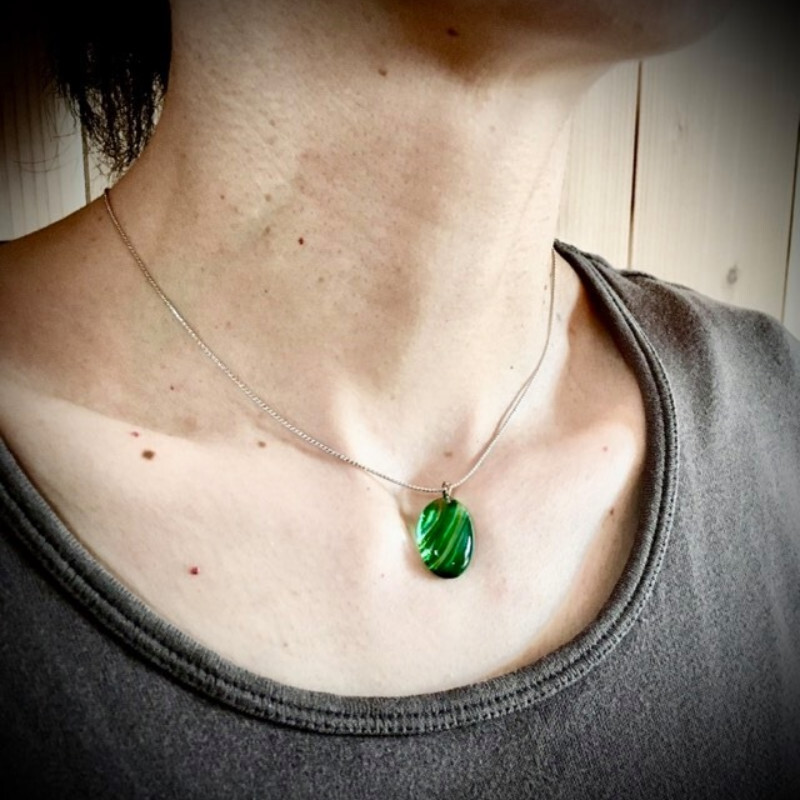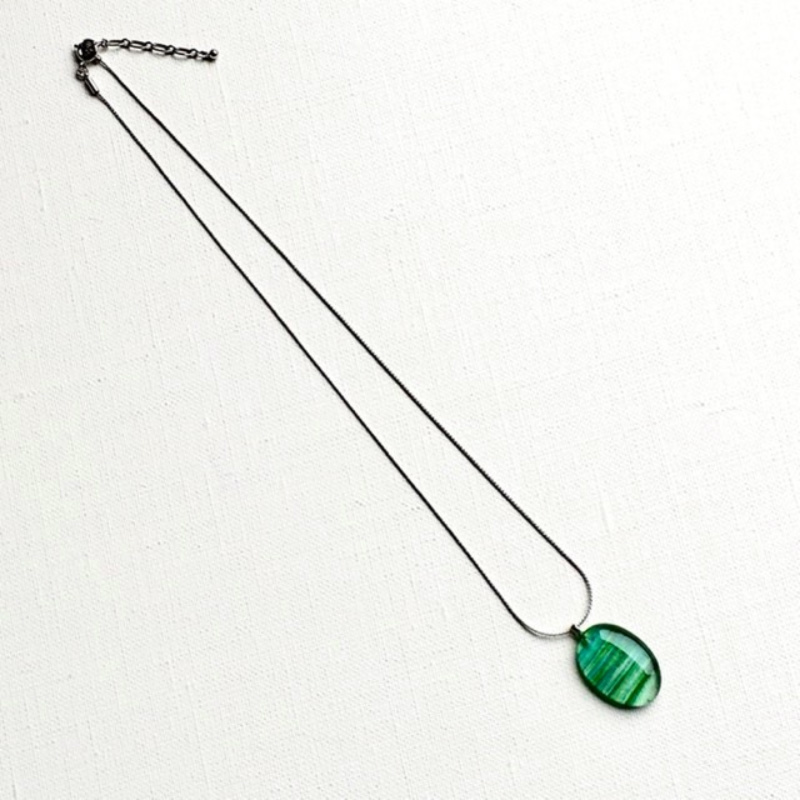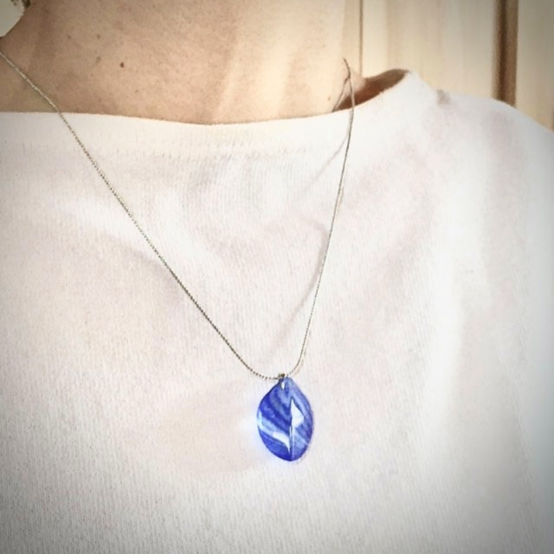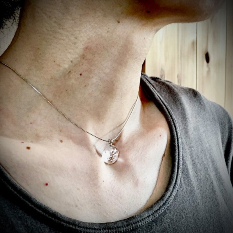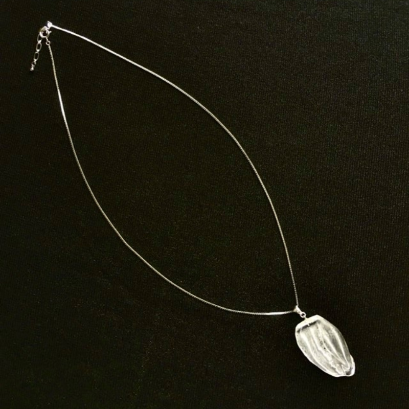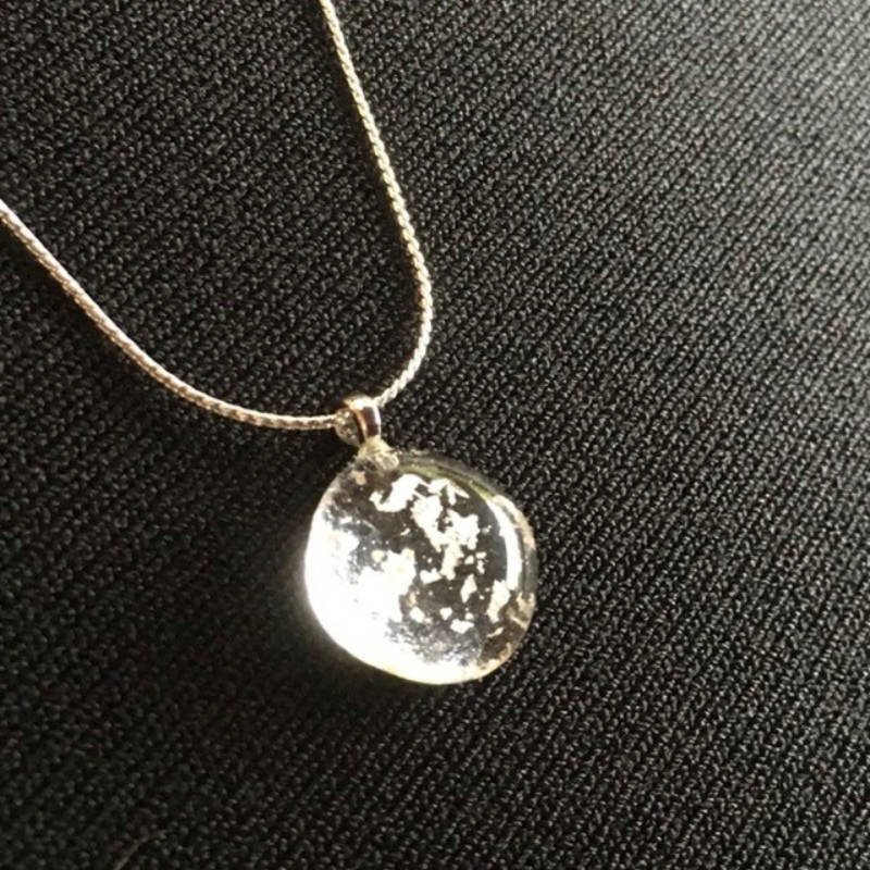 ガラスの制作過程において、意図するものとは違うある偶然から見つけた一粒。一粒の形を胸元に宿る光として、アクセサリーにしました。