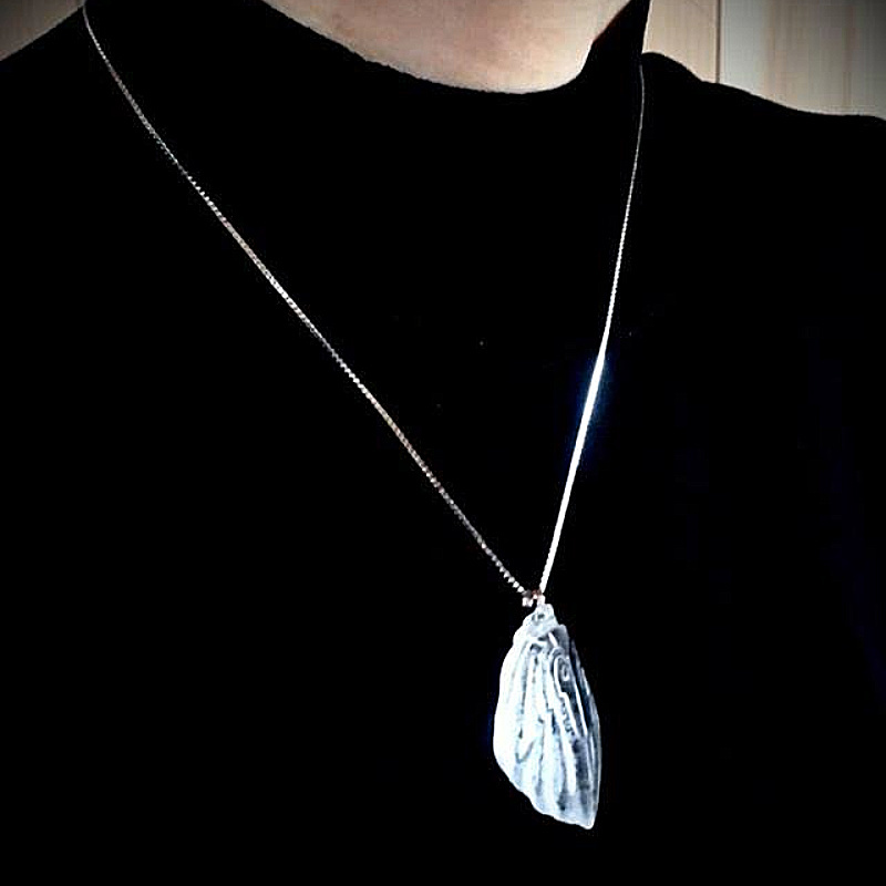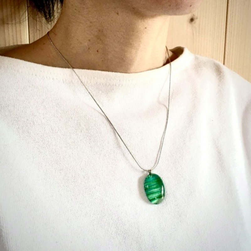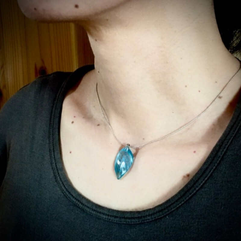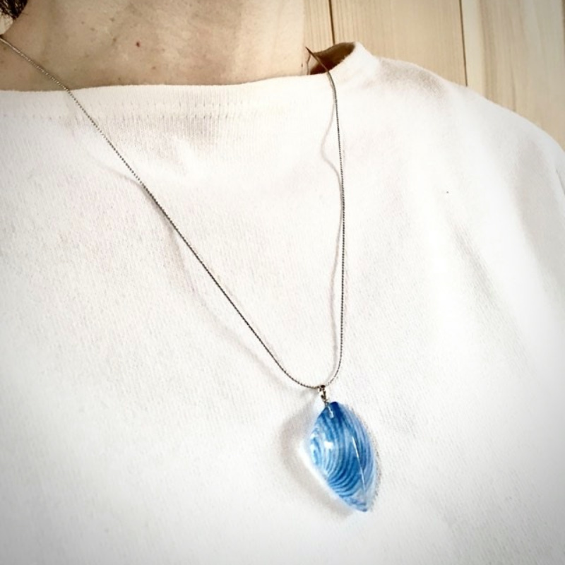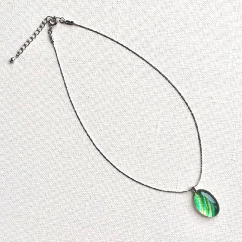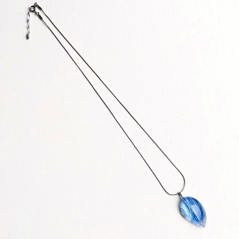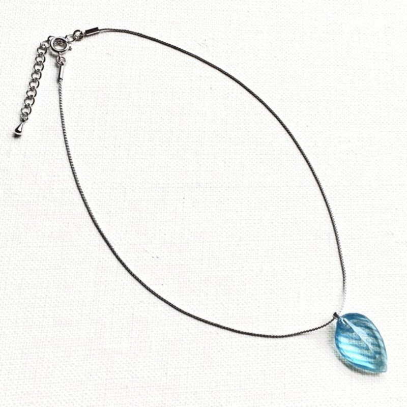 ガラスの制作過程において、意図するものとは違うある偶然から見つけた一粒。一粒の形を胸元に宿る光として、アクセサリーにしました。
