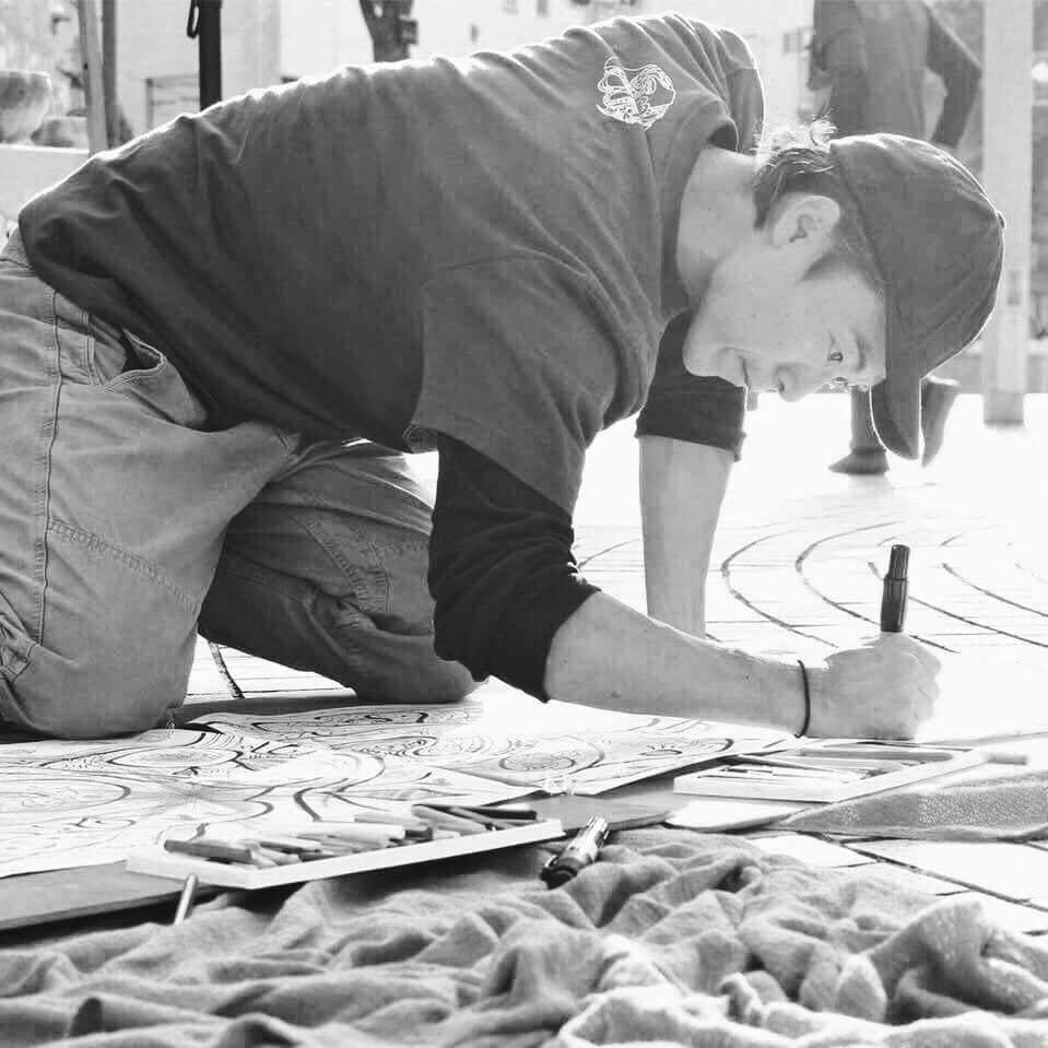 迷うことのない線。描き始めたら止まらない彼のペンで描かれる世界は、
