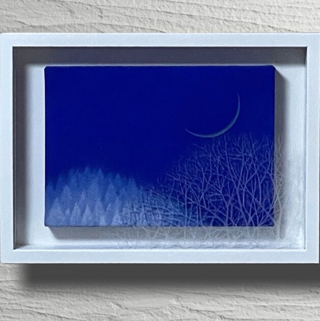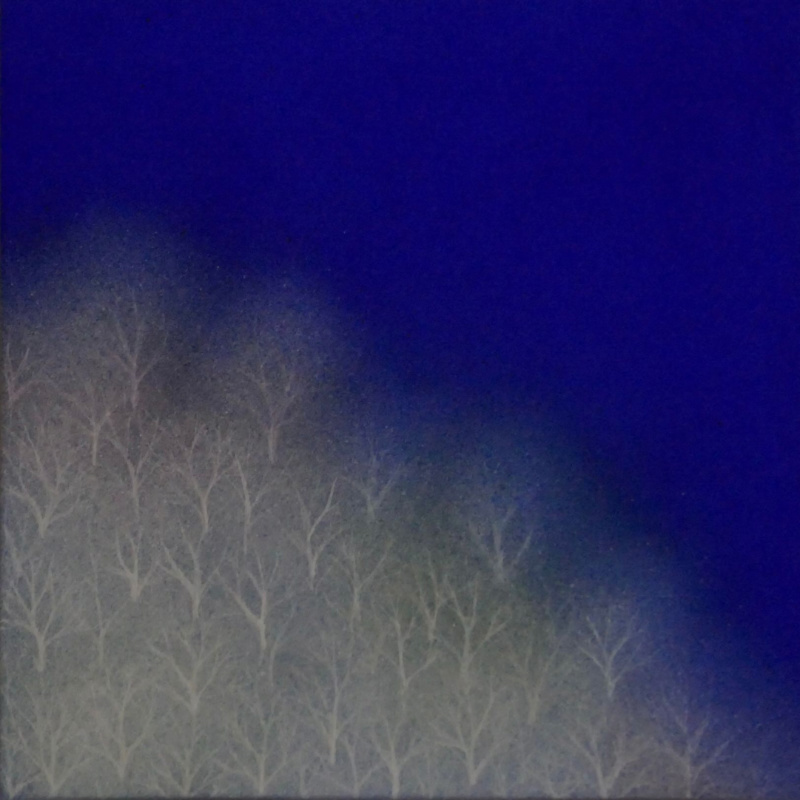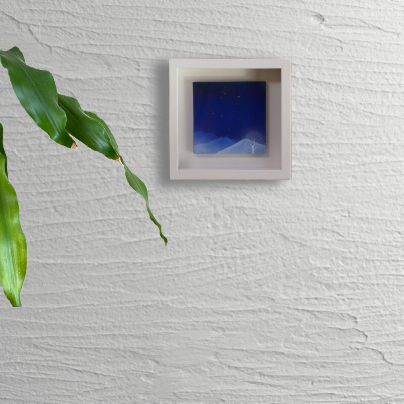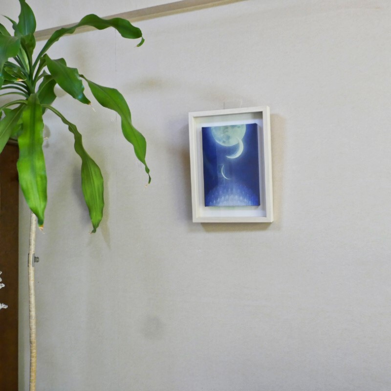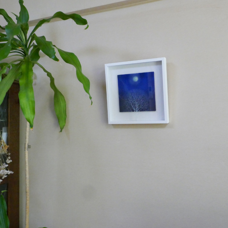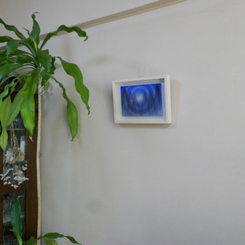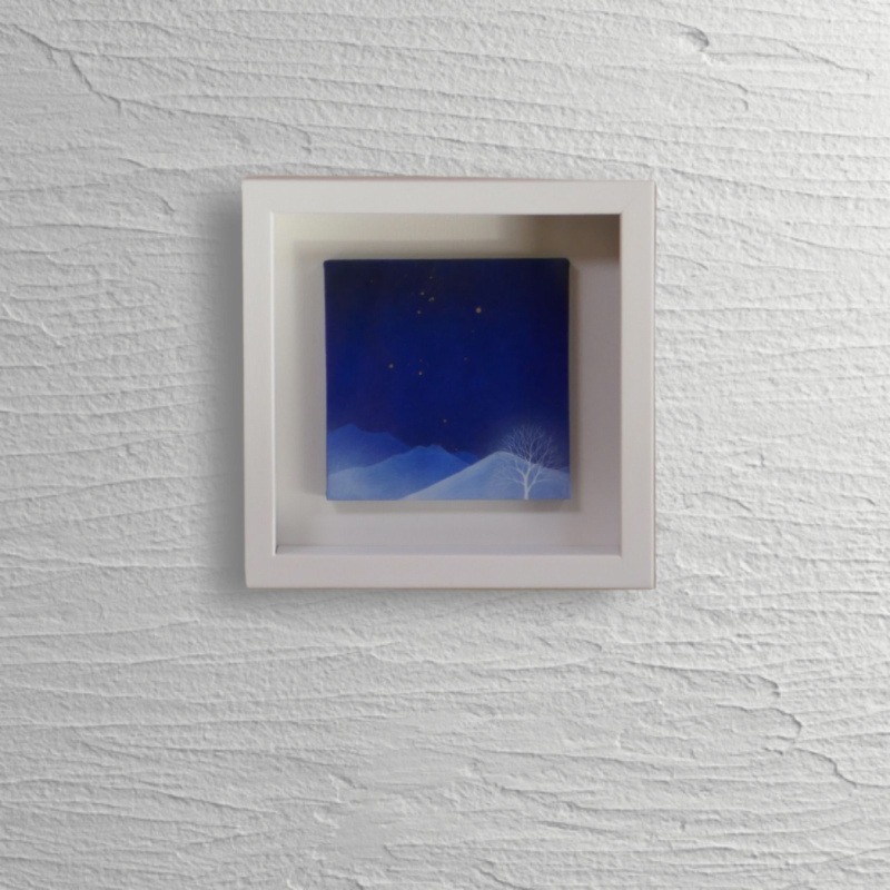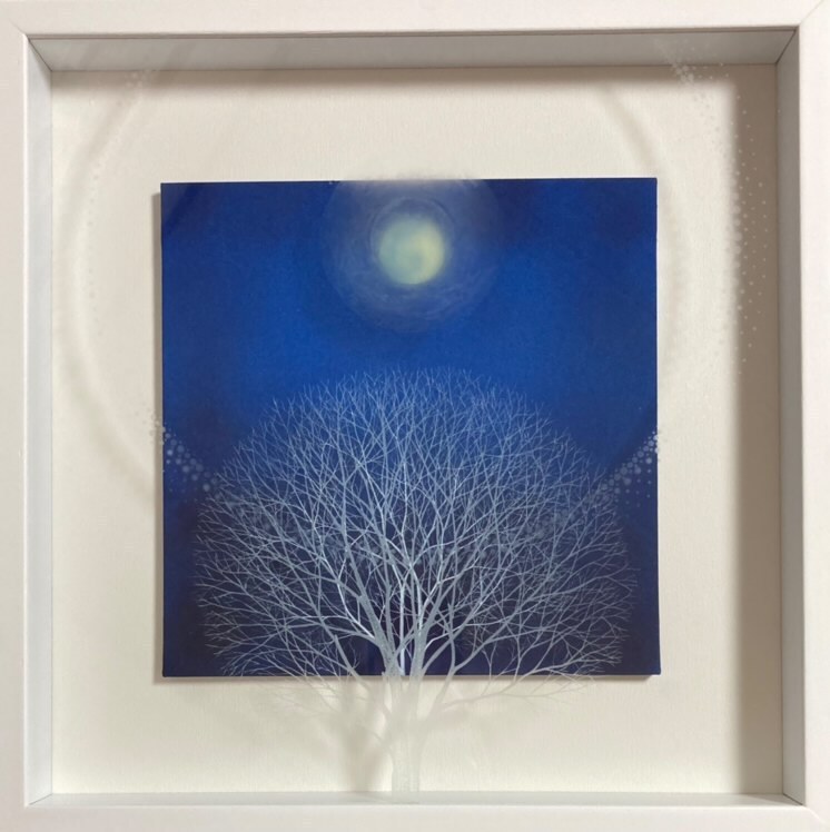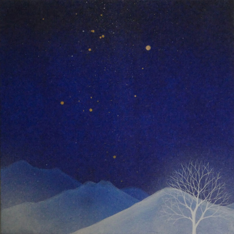 10㎝四方の小さな作品ですが、じっと見つめていると、その夜空は作品の大きさとは関係なく、吸い込まれるように深くそして澄んで広がっています。