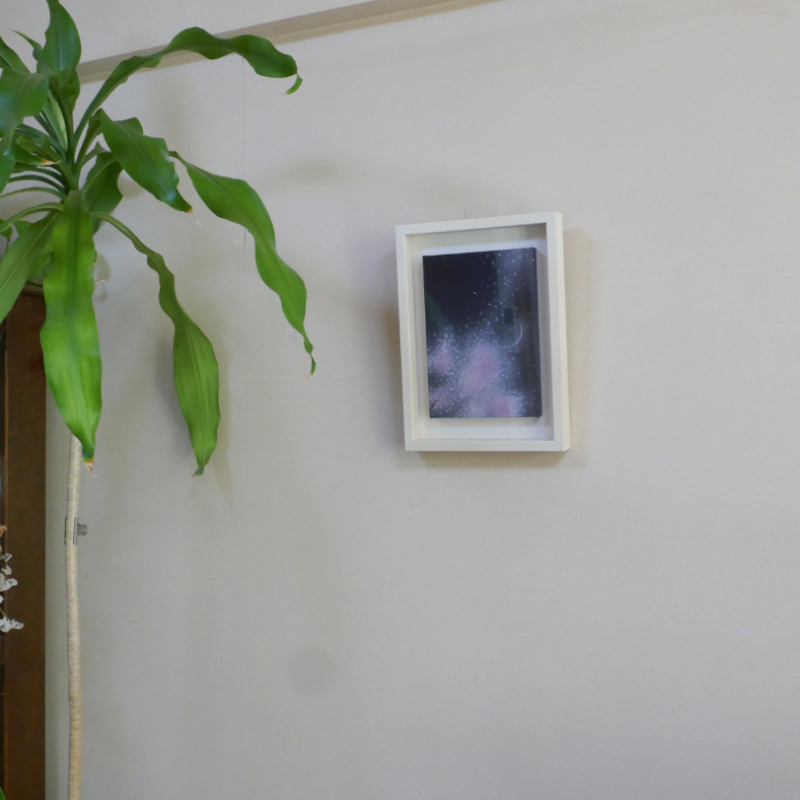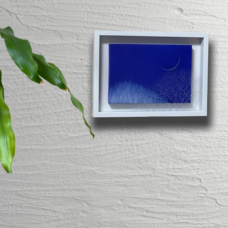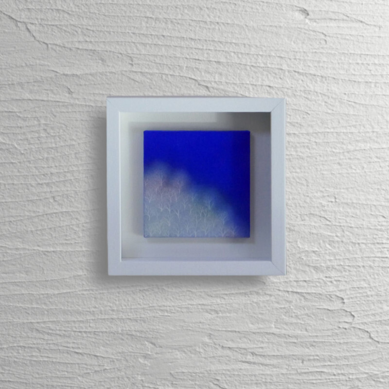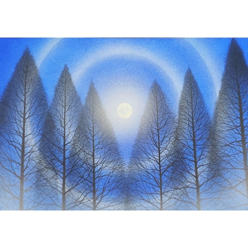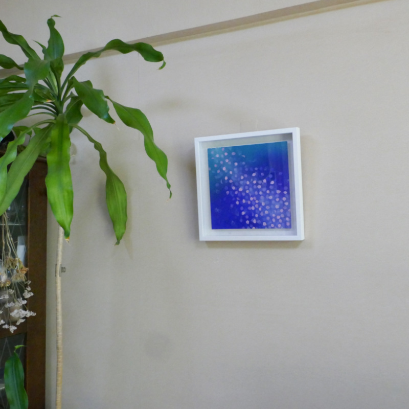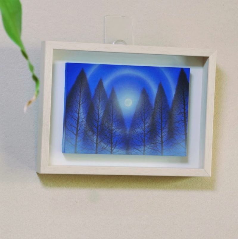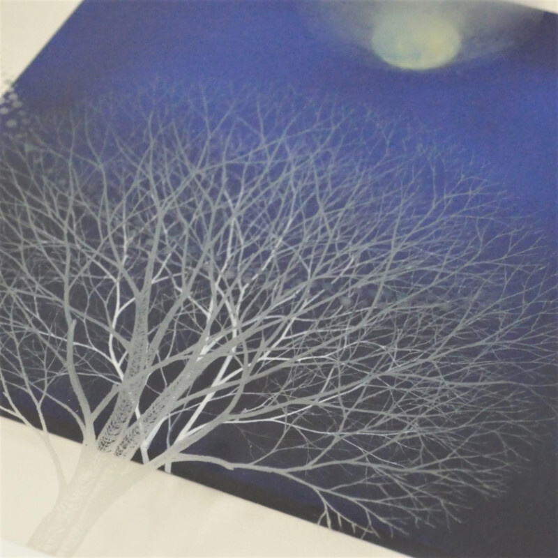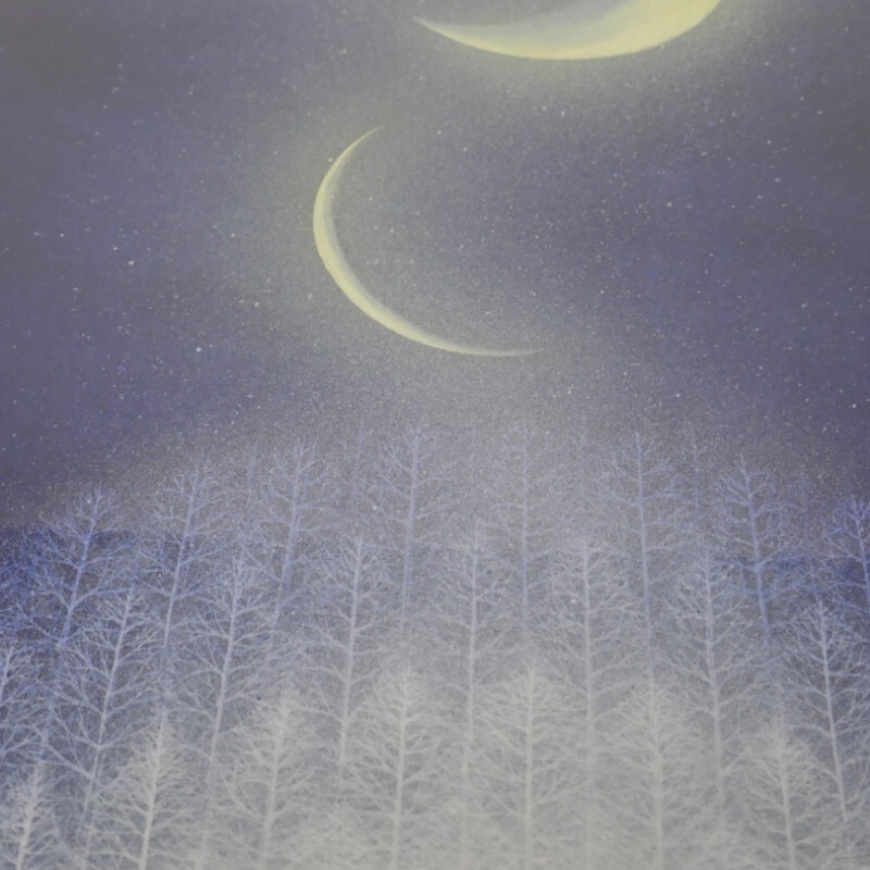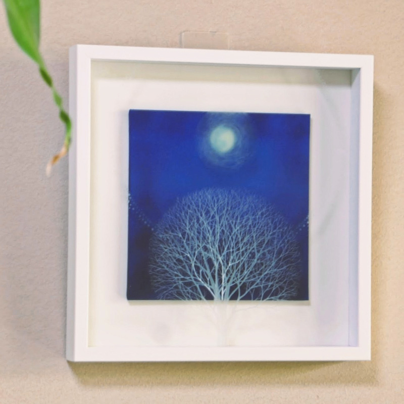 10㎝四方の小さな作品ですが、じっと見つめていると、その夜空は作品の大きさとは関係なく、吸い込まれるように深くそして澄んで広がっています。