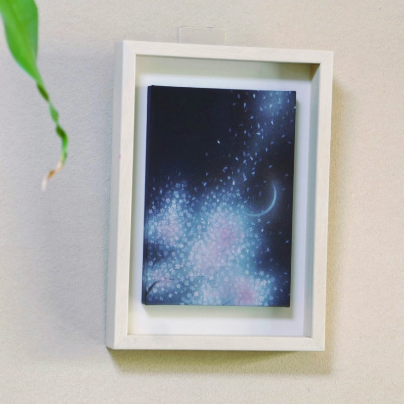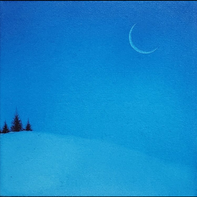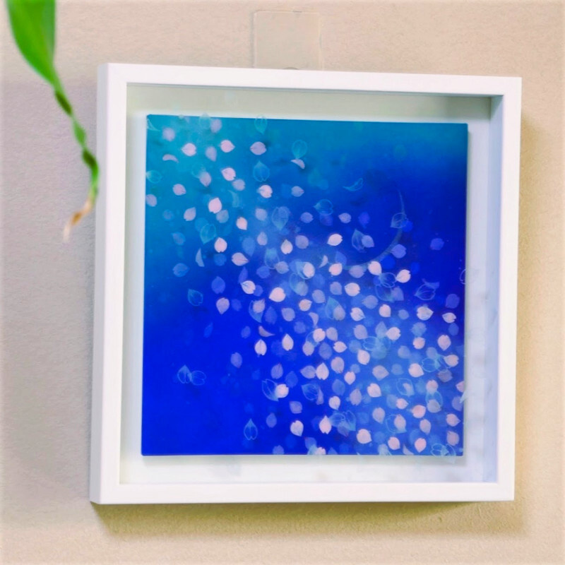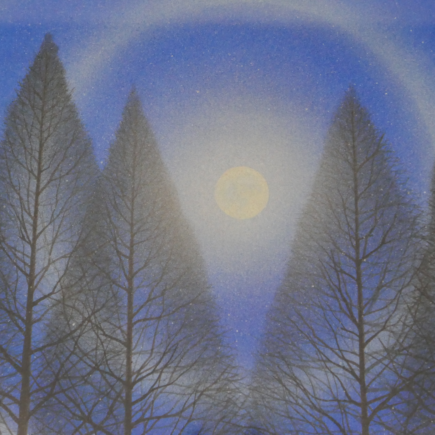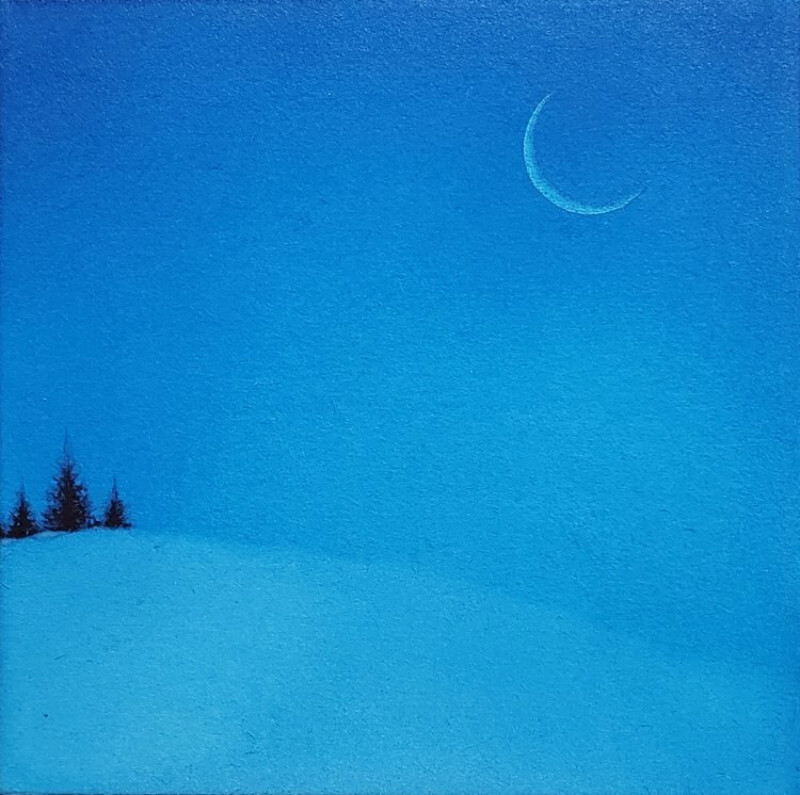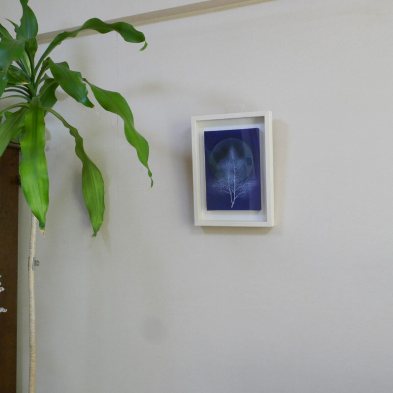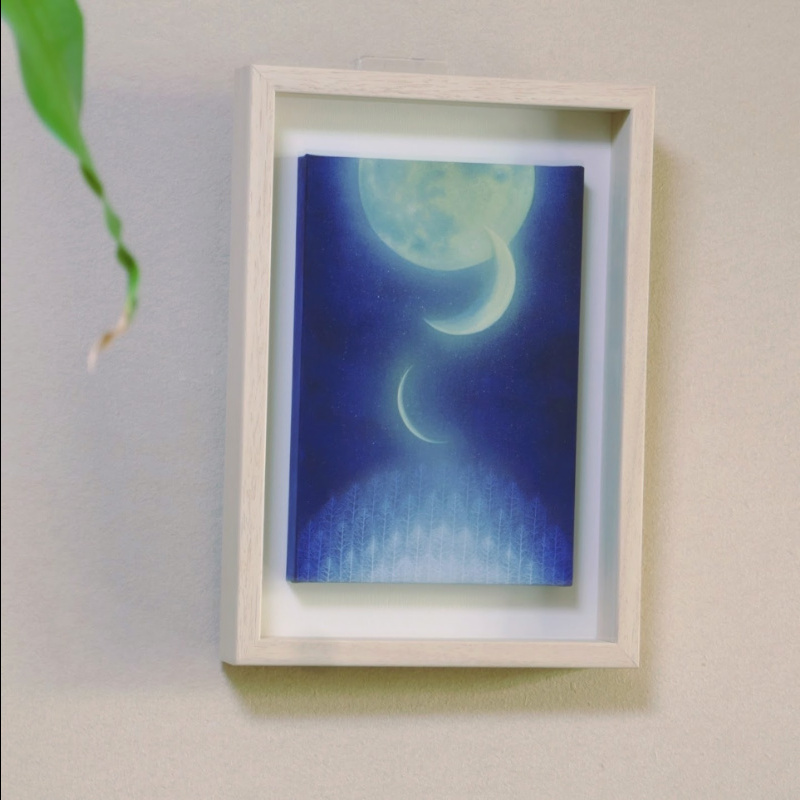 10㎝四方の小さな作品ですが、じっと見つめていると、その夜空は作品の大きさとは関係なく、吸い込まれるように深くそして澄んで広がっています。