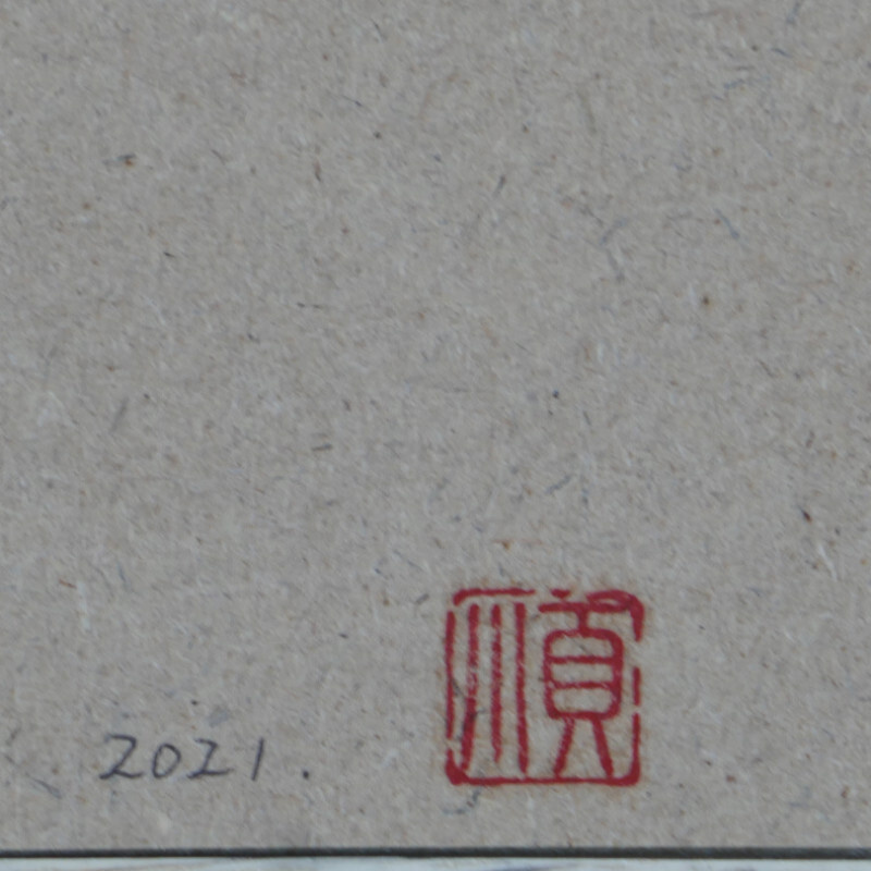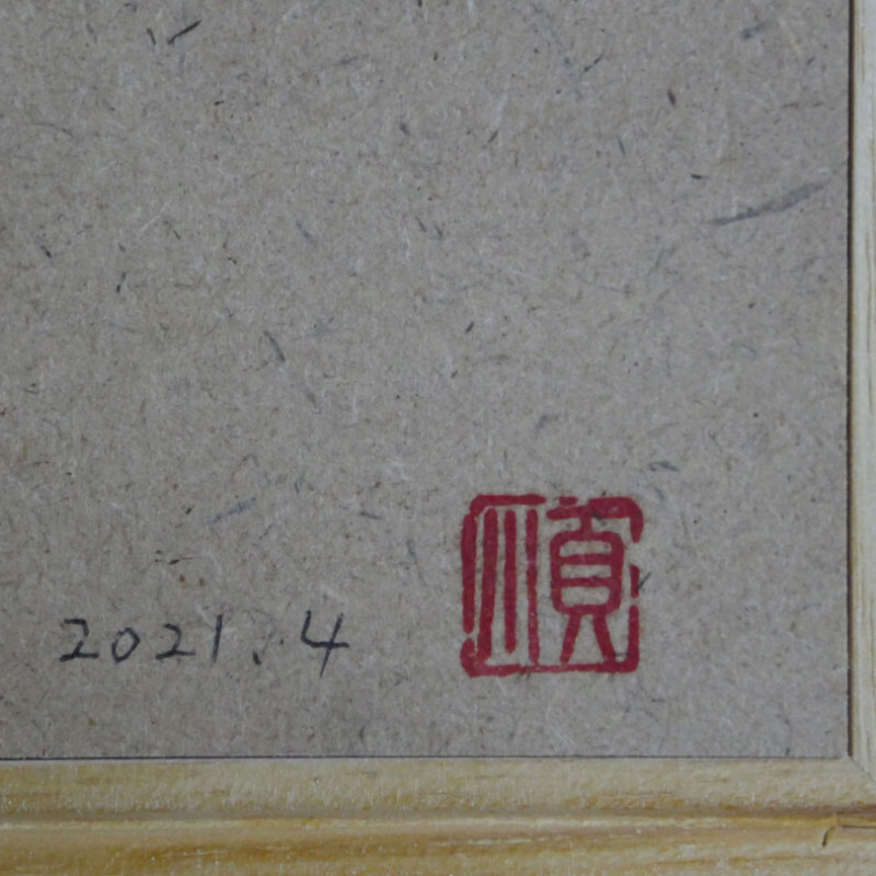木パネルに、楮紙や雲肌麻紙を水張りし、絵筆で顔彩という日本画絵の具を使用して描いています。