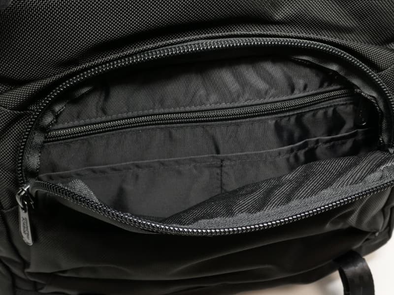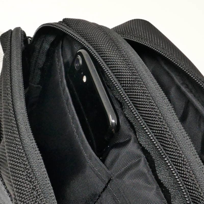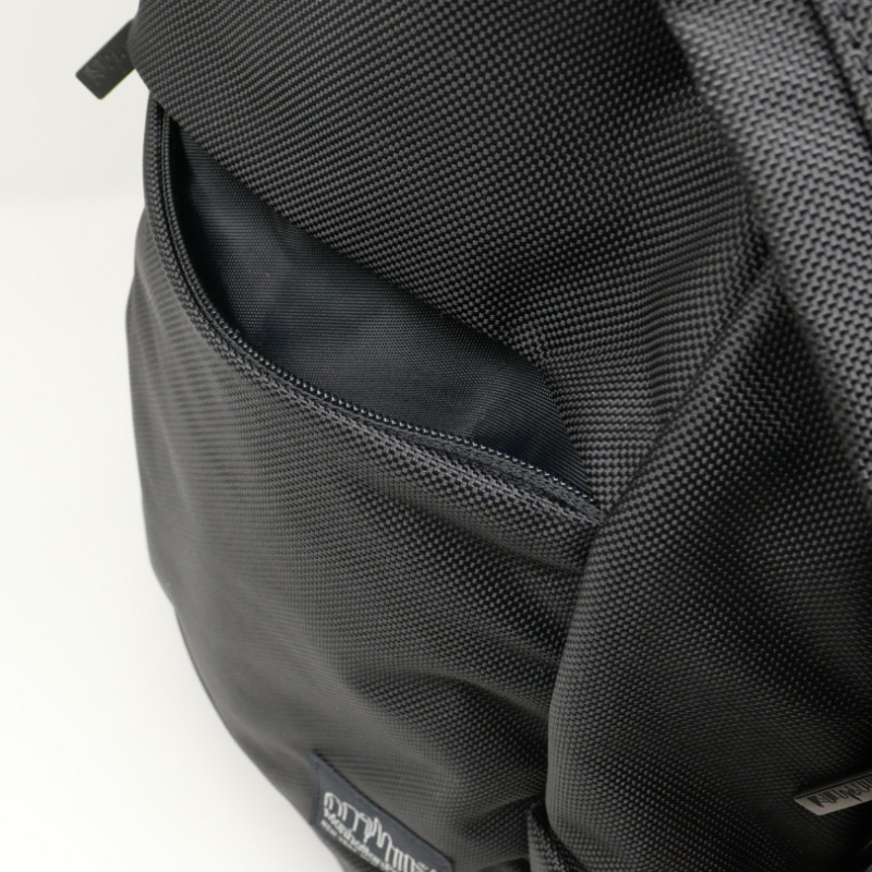 フロント部分には2つに分かれたメッシュポケットを搭載。USBや充電器、ペンといった小物を収納できる作りになっています。
