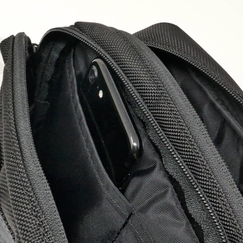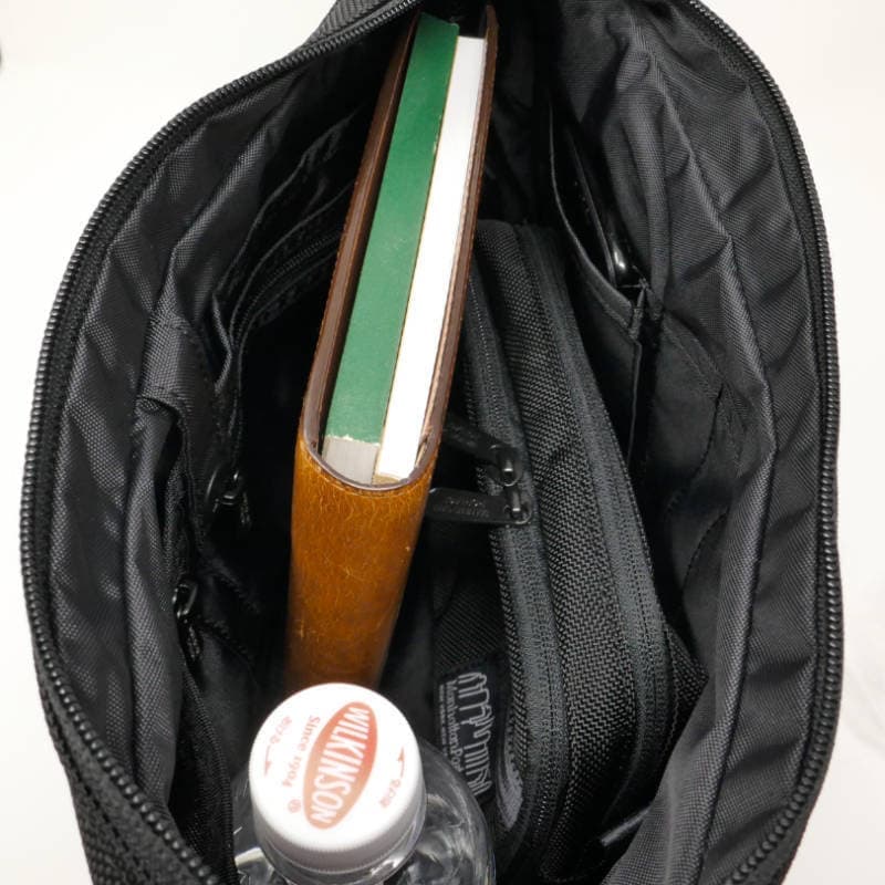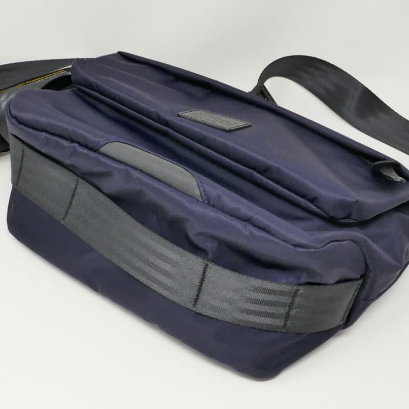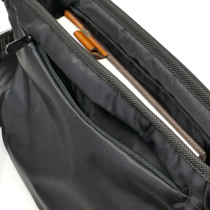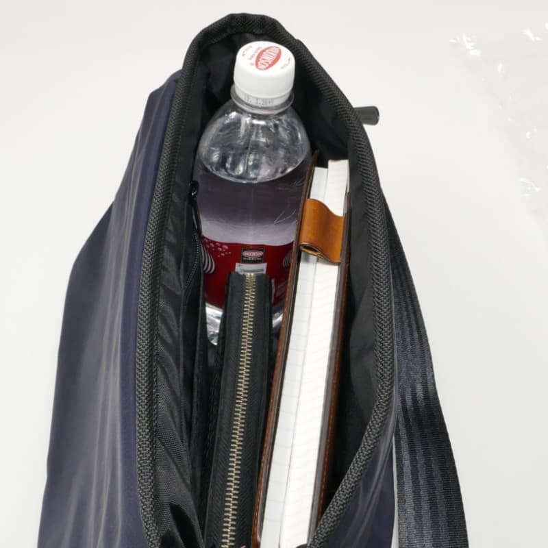 メッセンジャーバッグのシンプルな仕様は引き継いだままサイズダウンしたメッセンジャーバッグは、大きさに反してマチを広めにとっているため、i Padや、財布・携帯電話・カメラ・ペットボトルといった日常のギアであれば十分に収納できるサイズになっています。