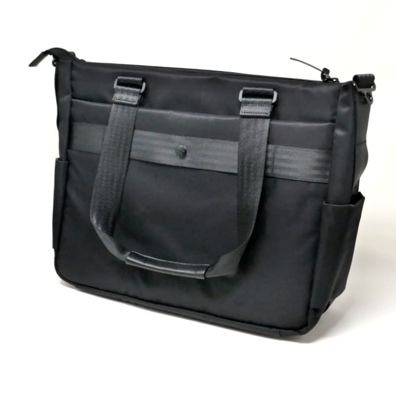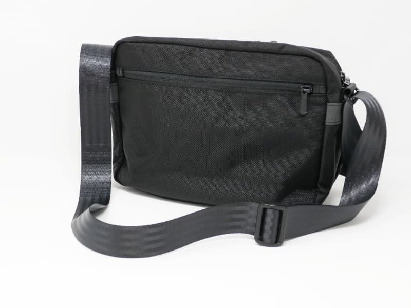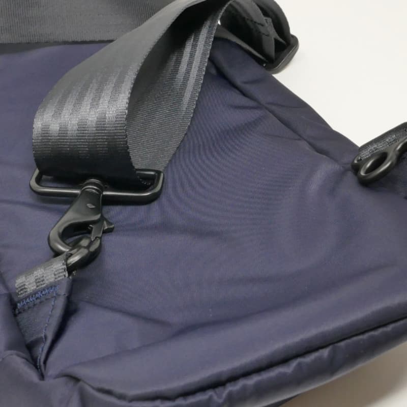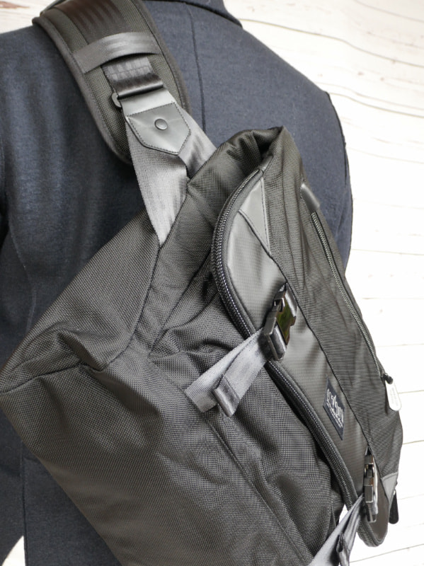 ・細めのショルダーストラップはシートベルト素材で混雑時には鞄をスムーズに前後に移動可能