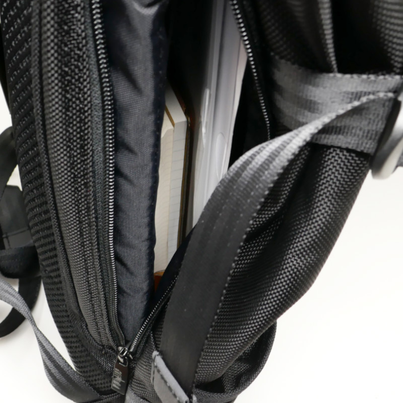 内側にはネオプレン素材を用いることでPCや荷物への衝撃を和らげる構造になっています。