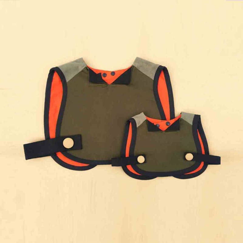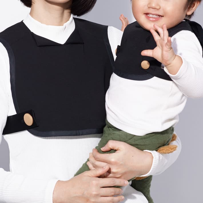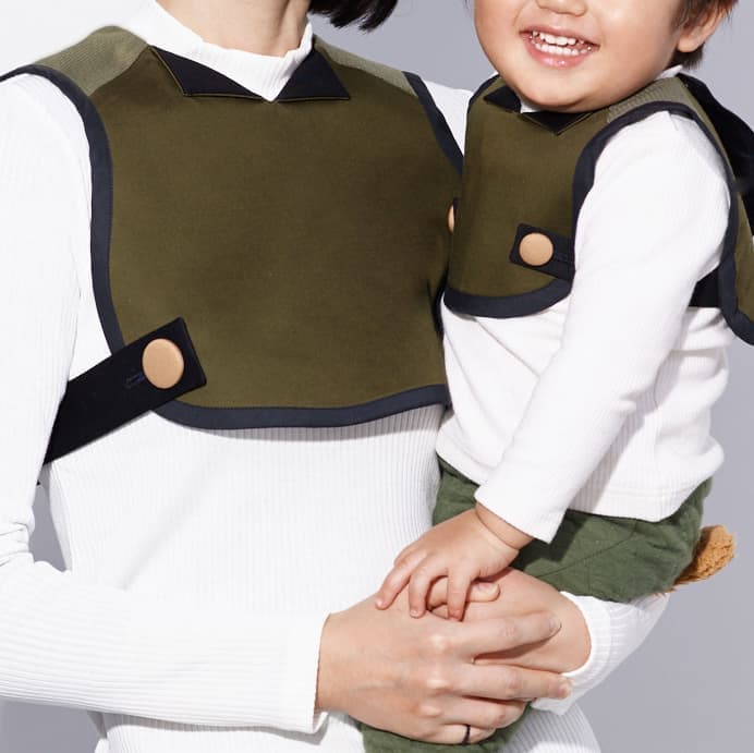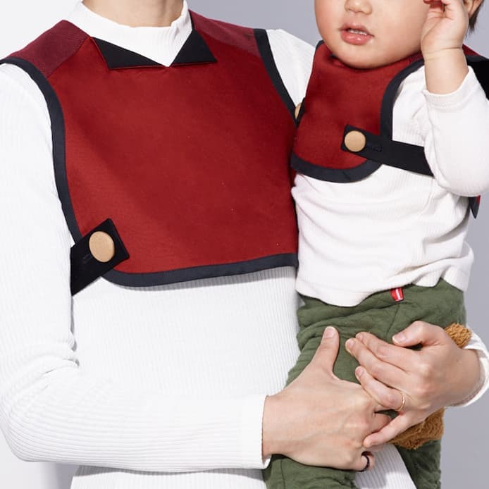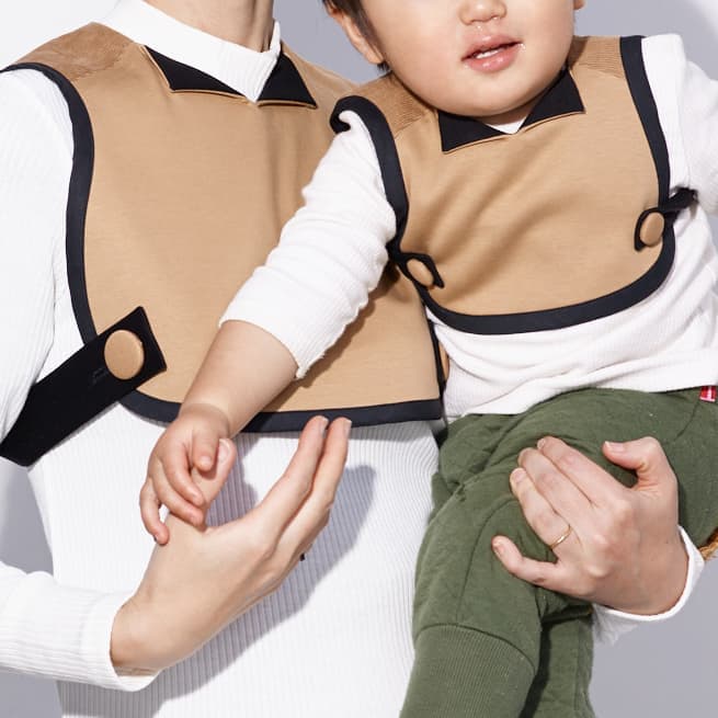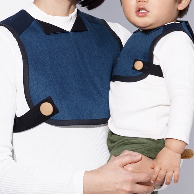 「ママのスタイもあったらいいのに。」そんな思いから生まれた、シックな見た目で、お揃いで着けられるベスト型ヨダレかけです。