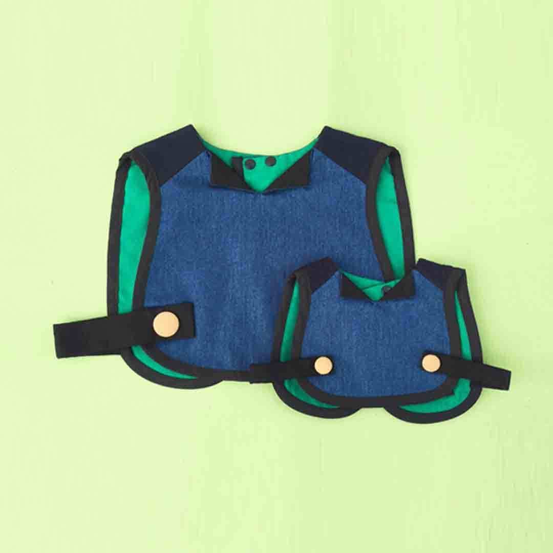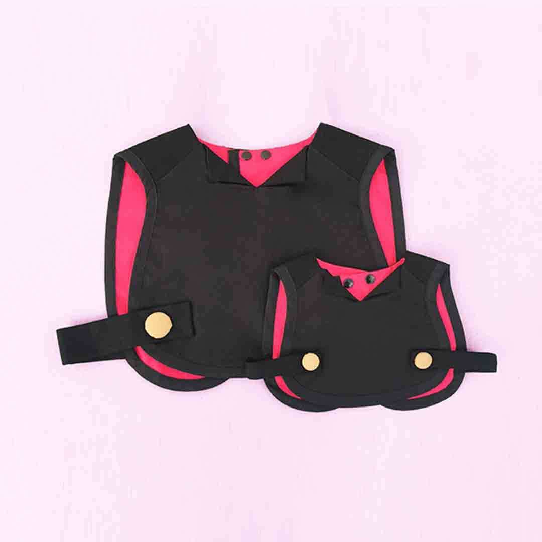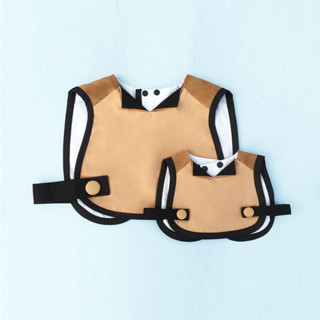 「ママのスタイもあったらいいのに。」そんな思いから生まれた、シックな見た目で、お揃いで着けられるベスト型ヨダレかけです。
