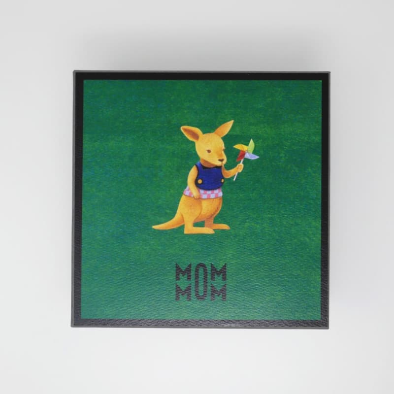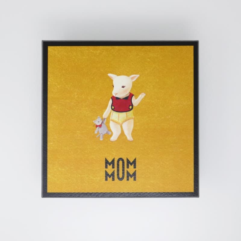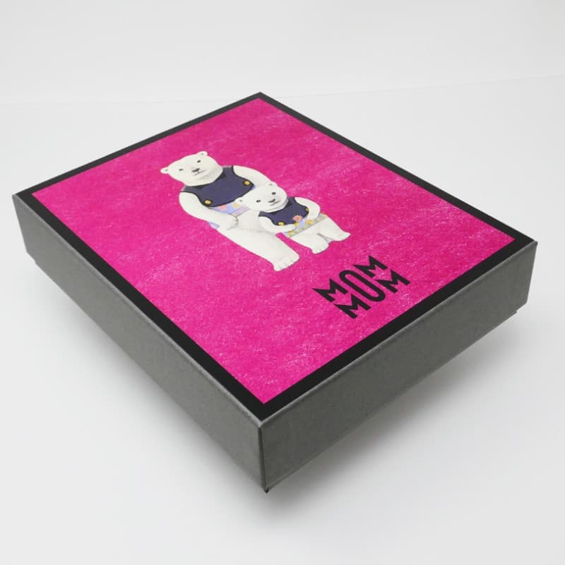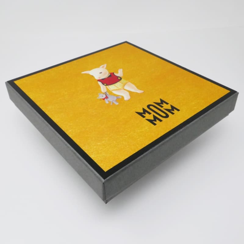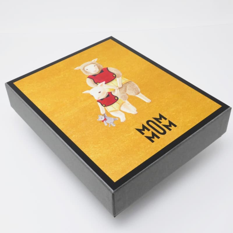 商品箱は、子供の思い出の品を入れてアフターユース。しっかりした化粧箱で、スタイを着けた仲睦まじい動物の親子が描かれています。自分用にはもちろん、出産祝いとしても喜ばれる一品です。