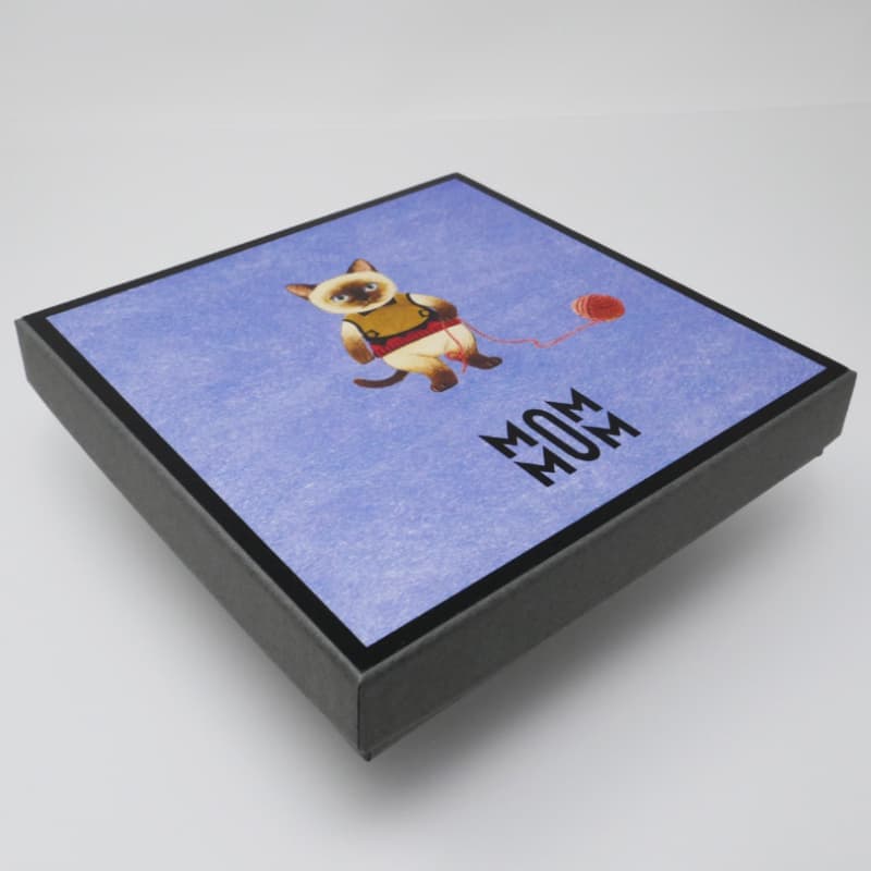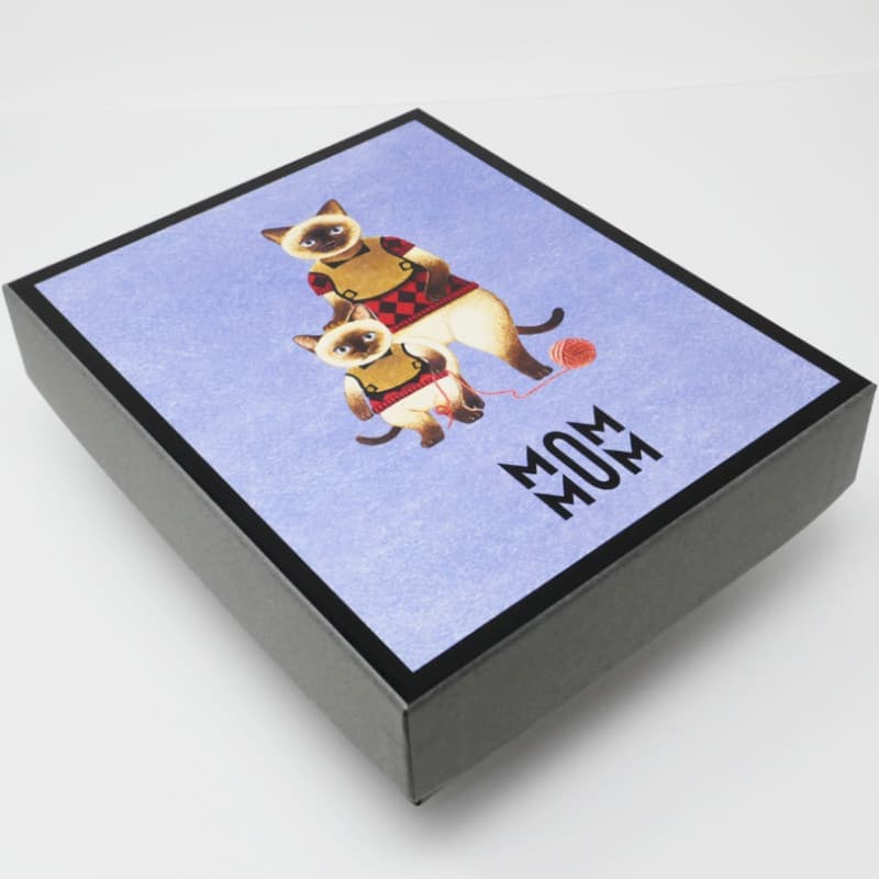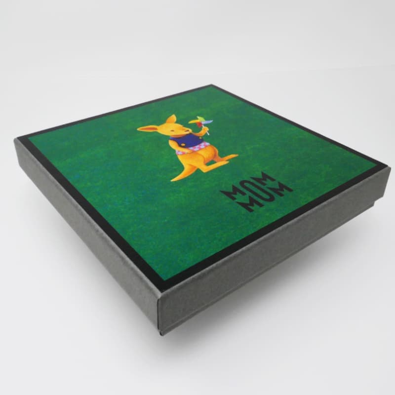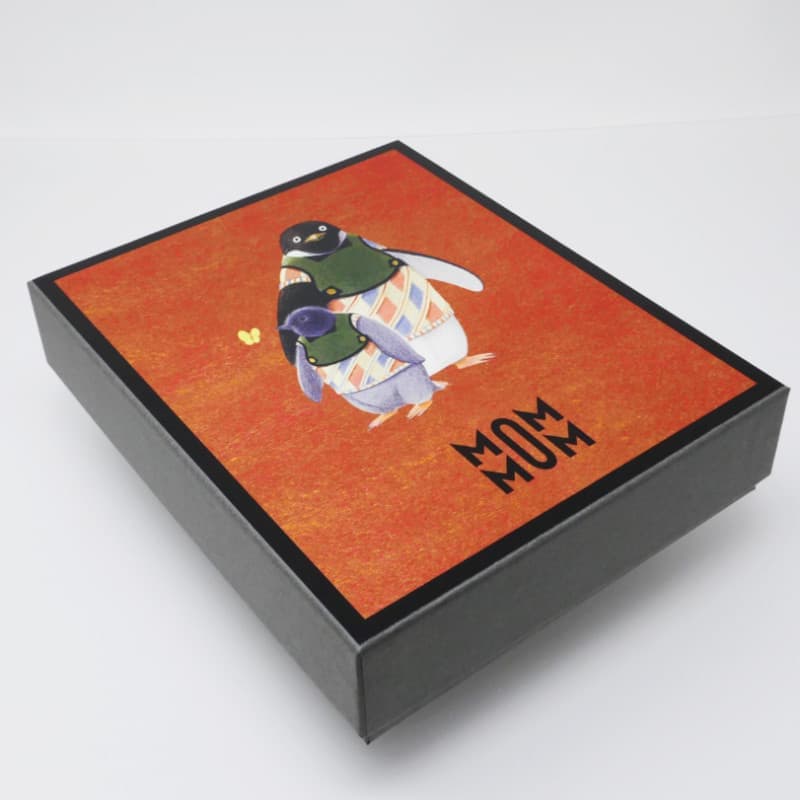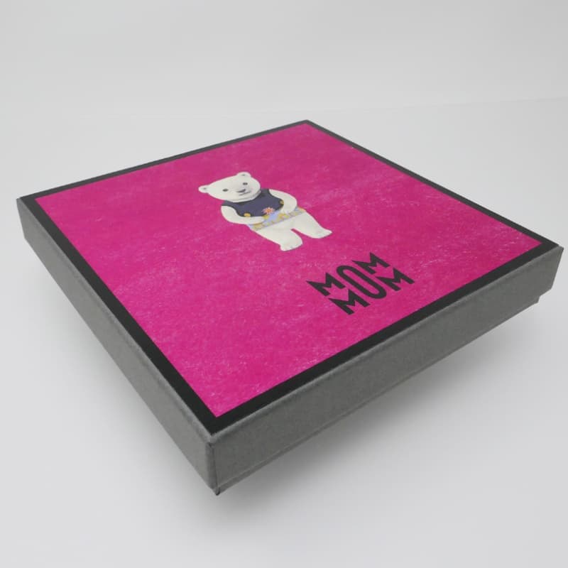 商品箱は、子供の思い出の品を入れてアフターユース。しっかりした化粧箱で、スタイを着けた仲睦まじい動物の親子が描かれています。自分用にはもちろん、出産祝いとしても喜ばれる一品です。