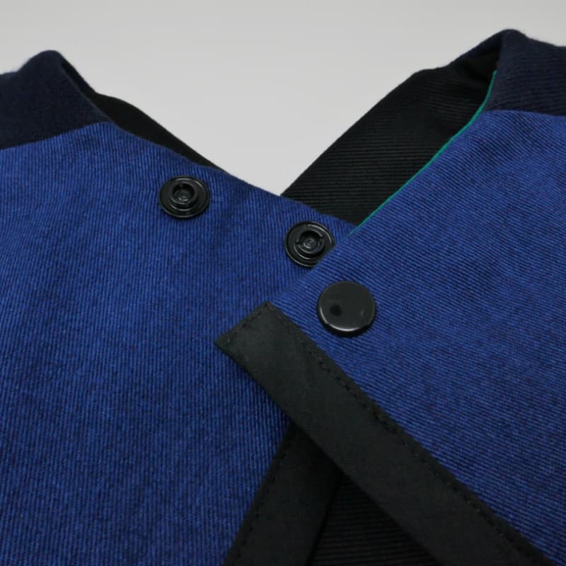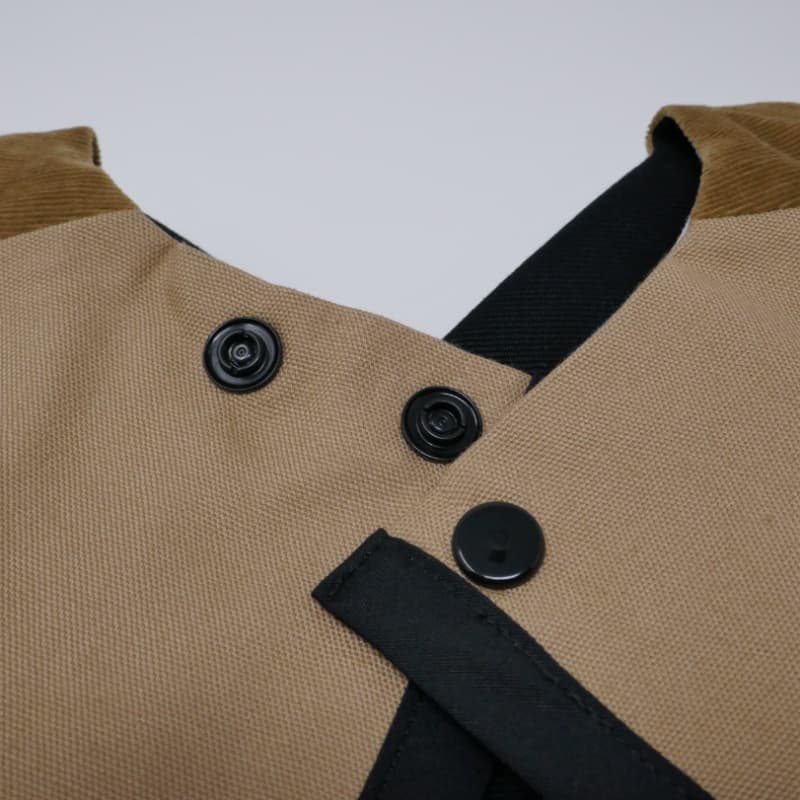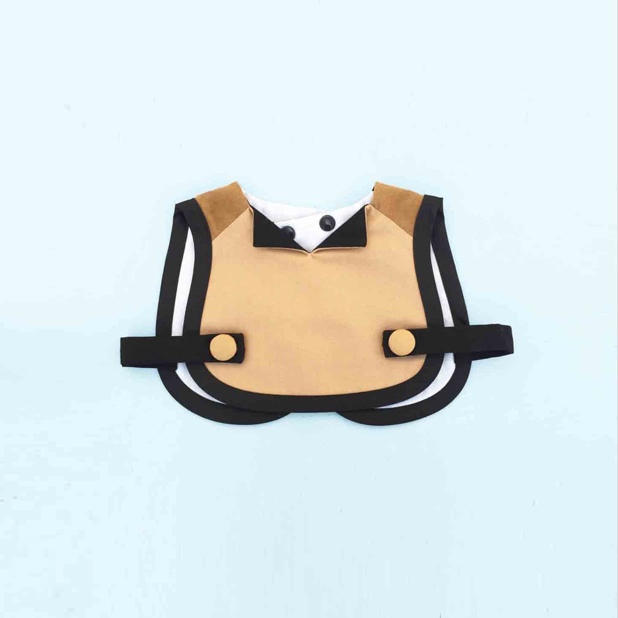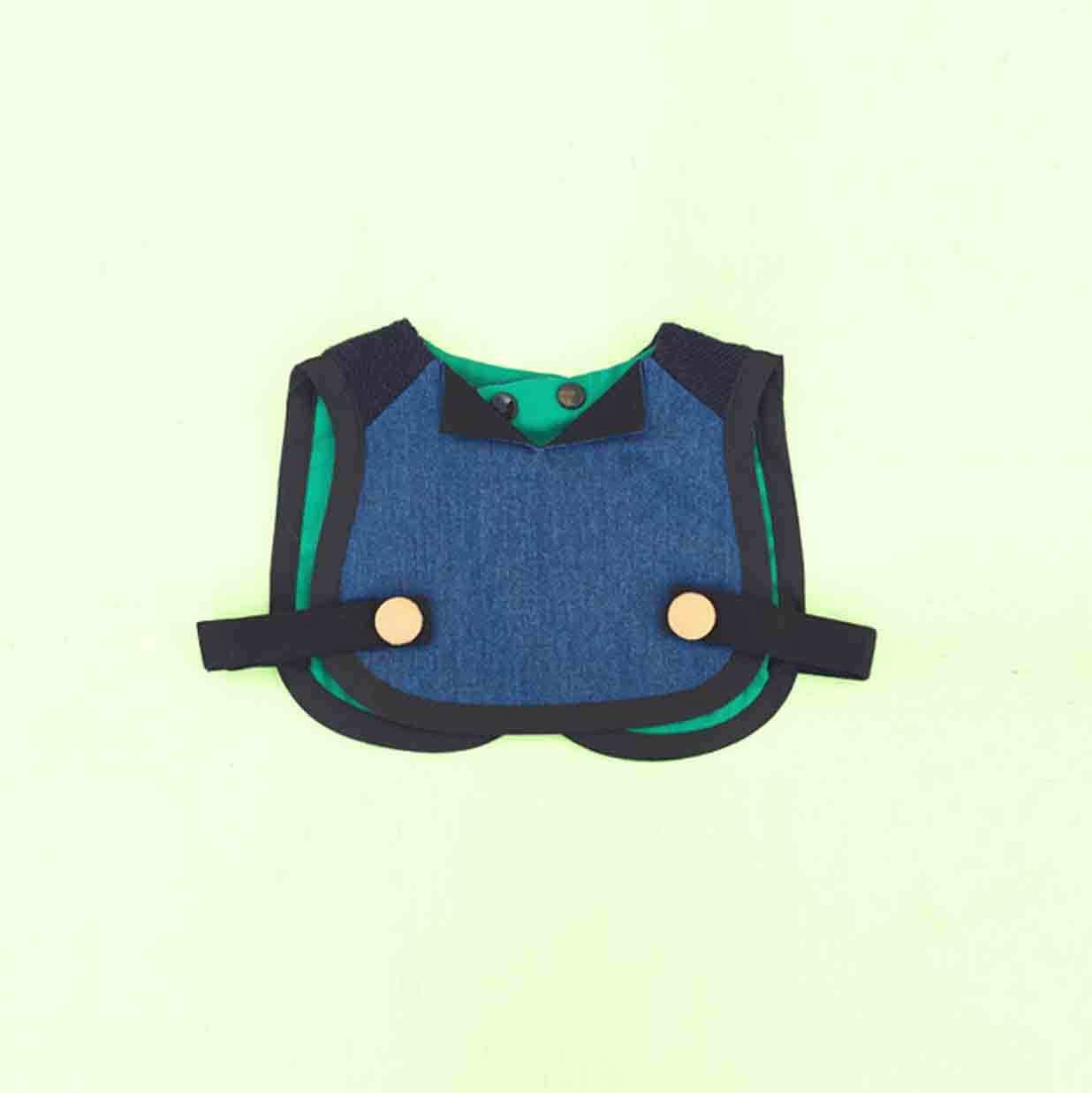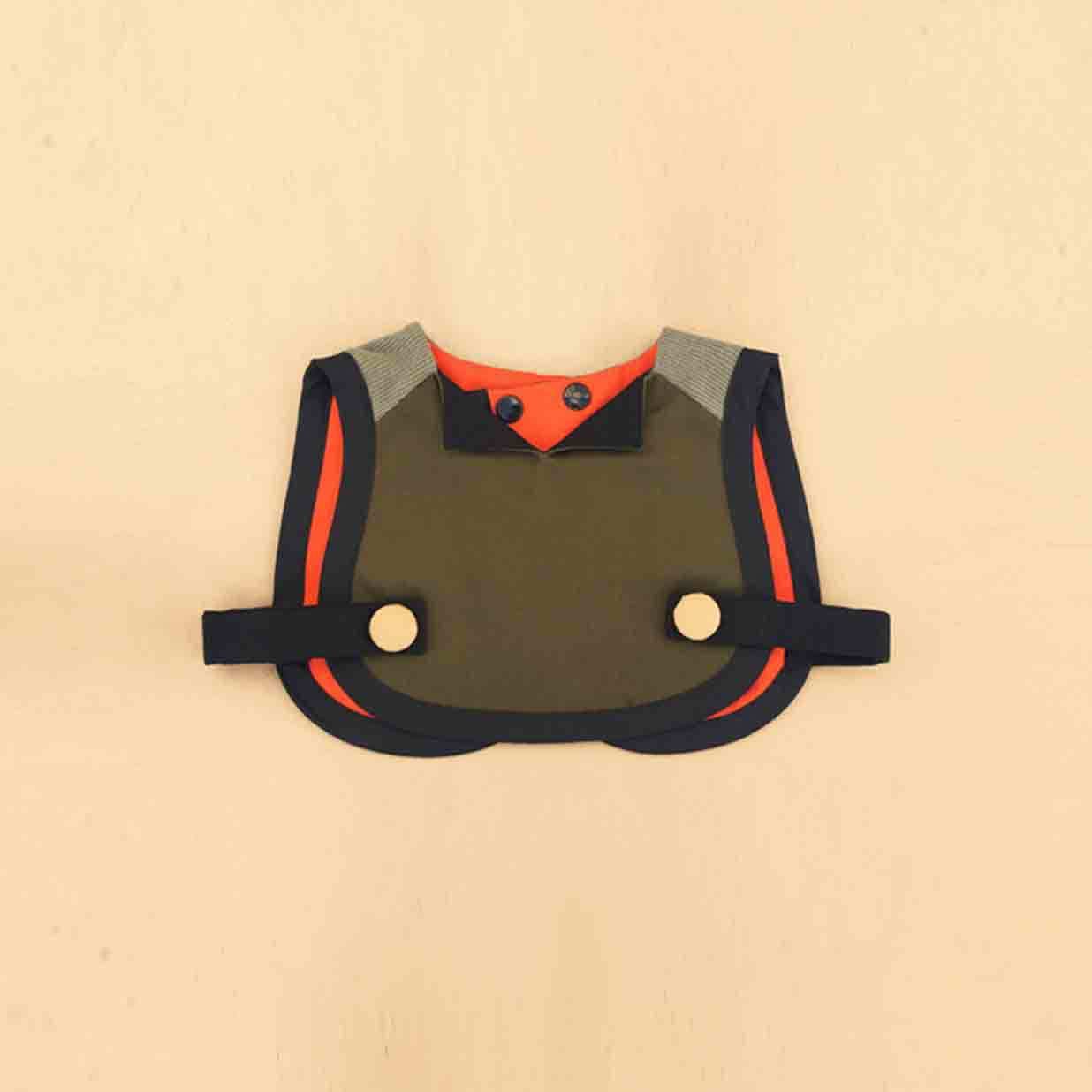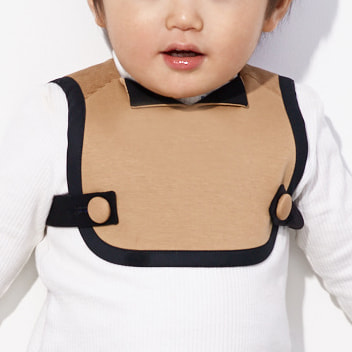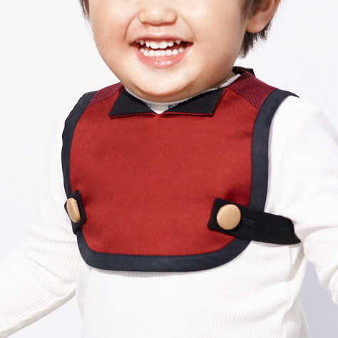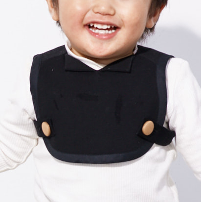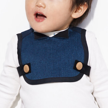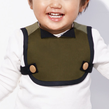 お洋服のようなシックな見た目の、ベスト型ヨダレかけ。生後3ヶ月から、2歳くらいでヨダレや鼻水の多い子でも、お洋服を着ているように見えるデザインなので、長くご活用いただけます。