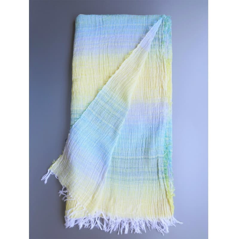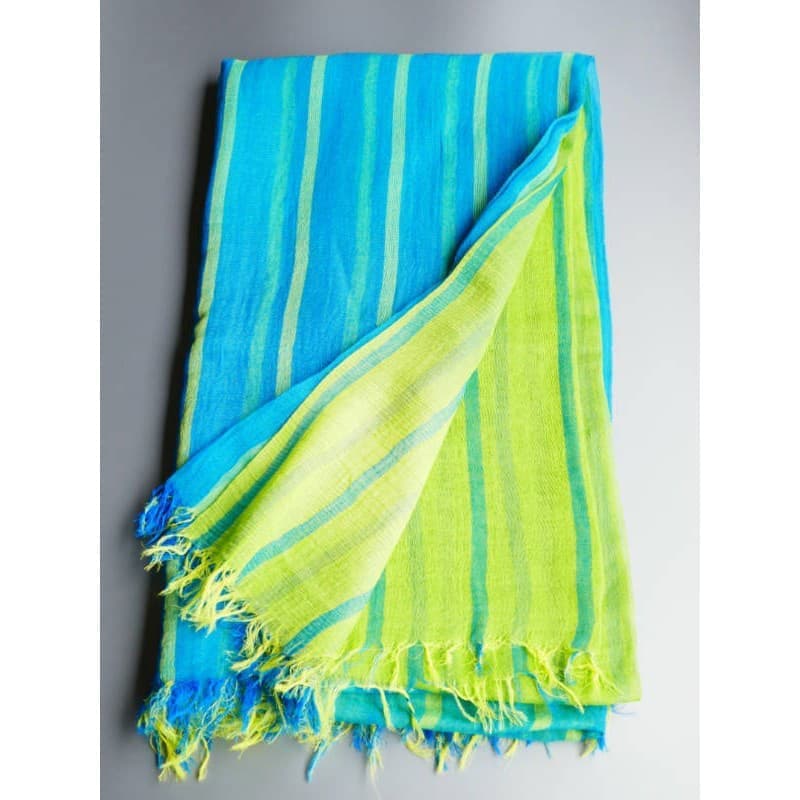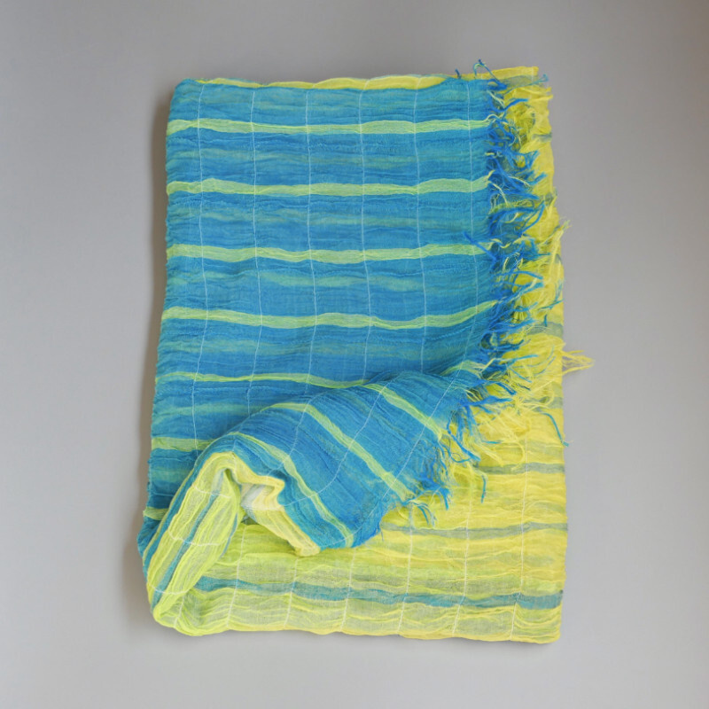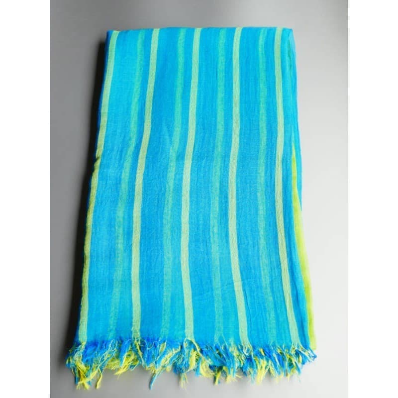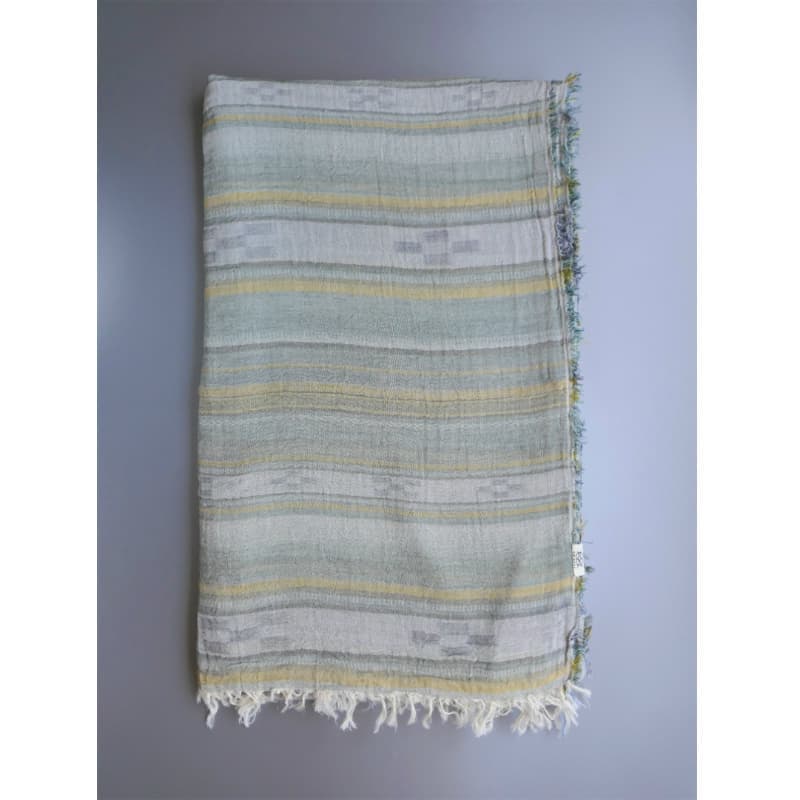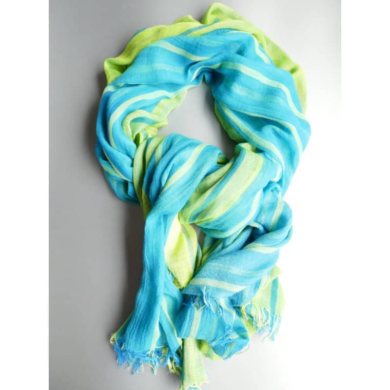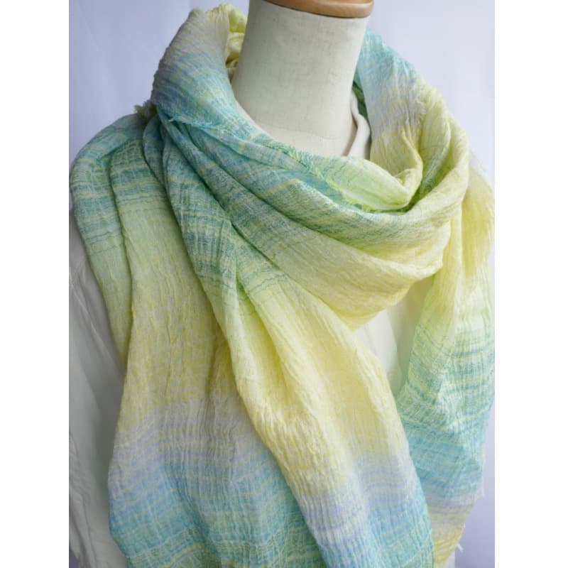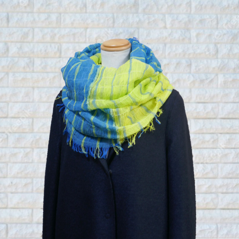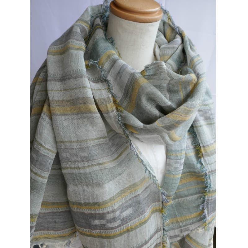 ブルーにイエローのストライプ、反対配色のイエローにブルーのストライプ。2枚仕立てのブルーとイエローが相まって全体の印象は熱帯魚の様なブルーグリーンに見える大判ストールです。