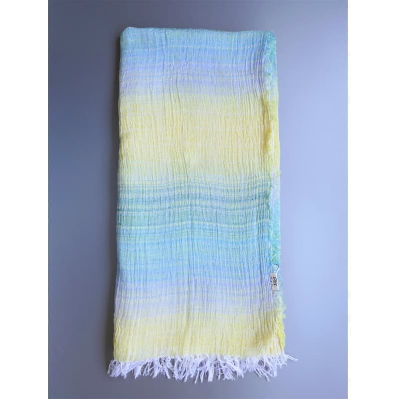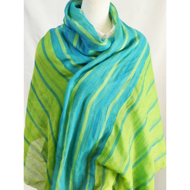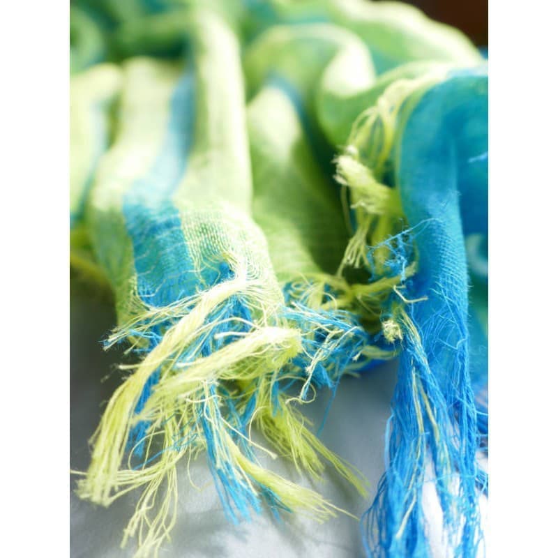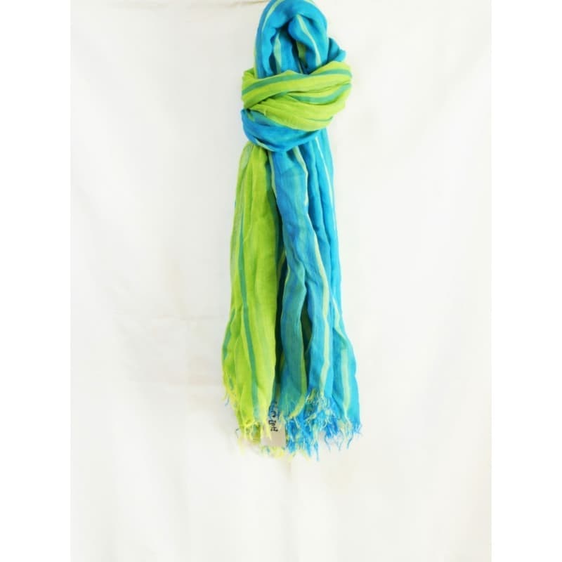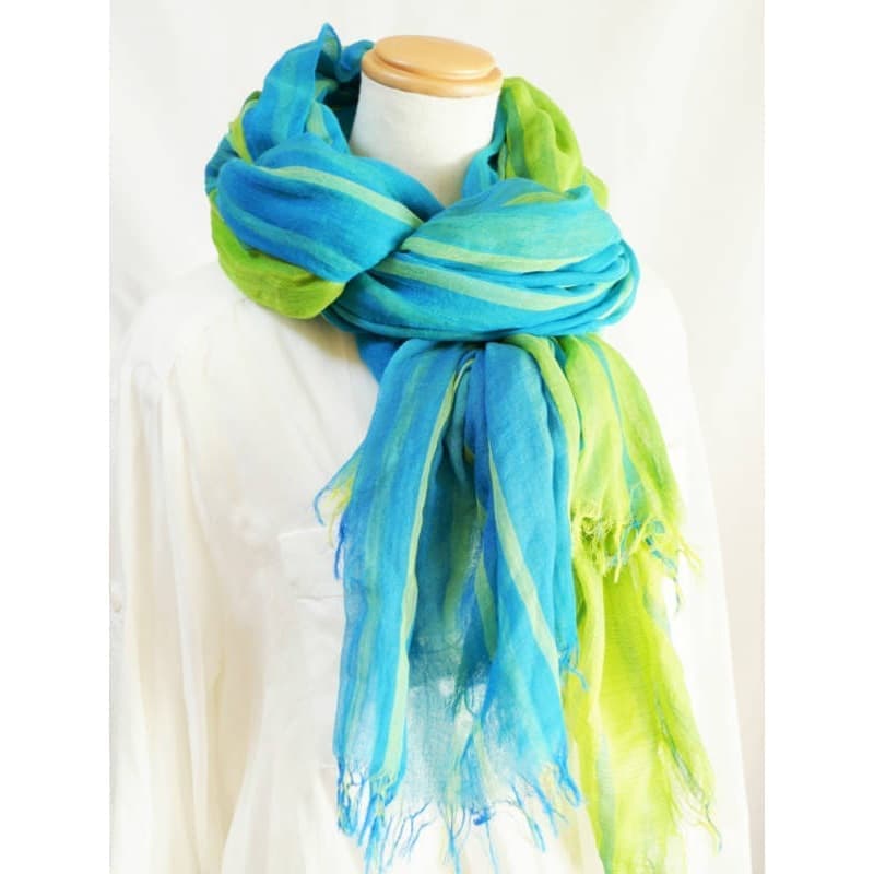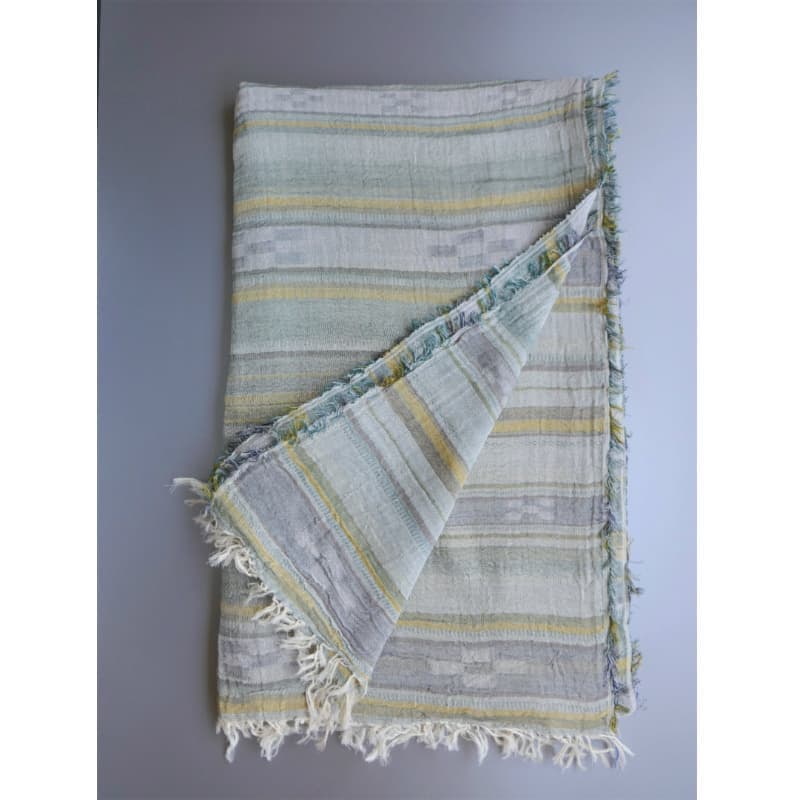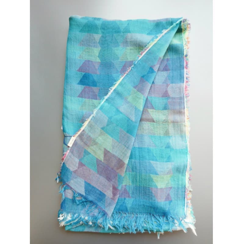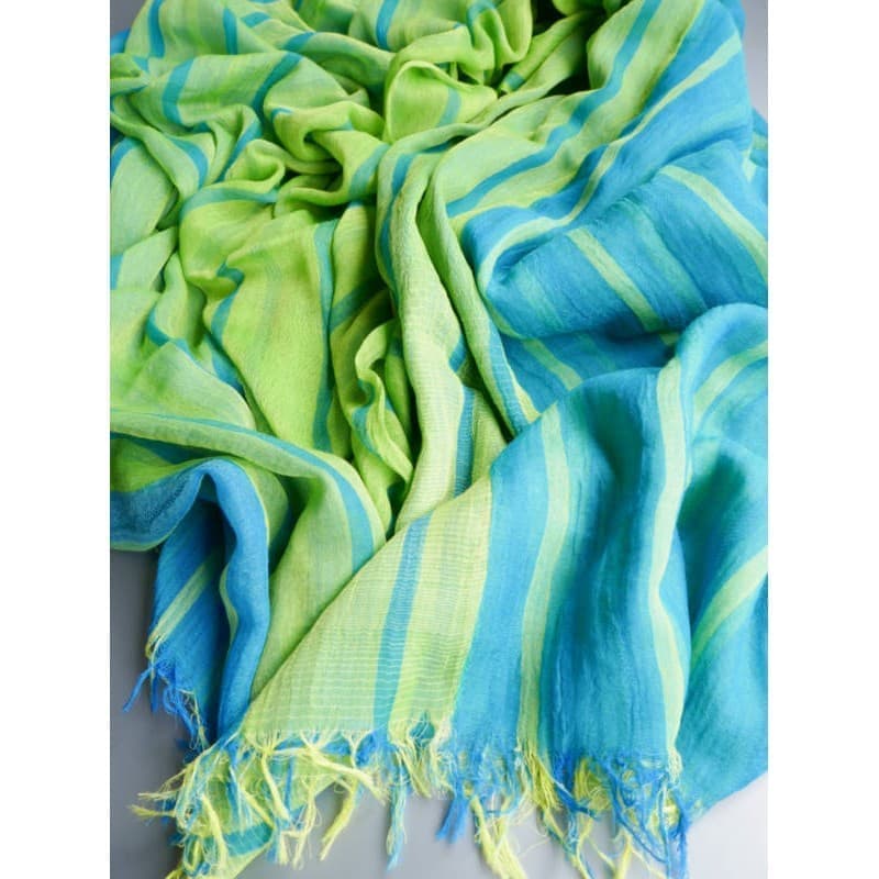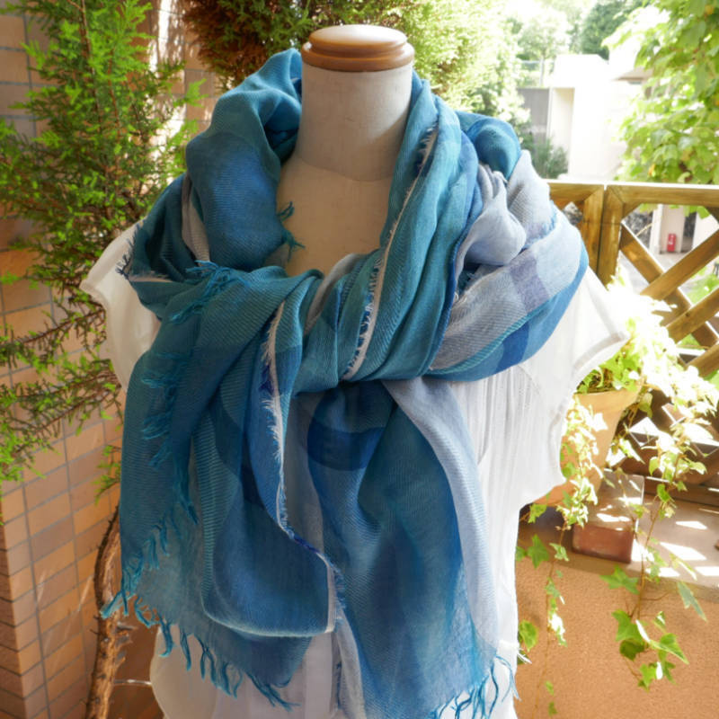 ブルーにイエローのストライプ、反対配色のイエローにブルーのストライプ。2枚仕立てのブルーとイエローが相まって全体の印象は熱帯魚の様なブルーグリーンに見える大判ストールです。