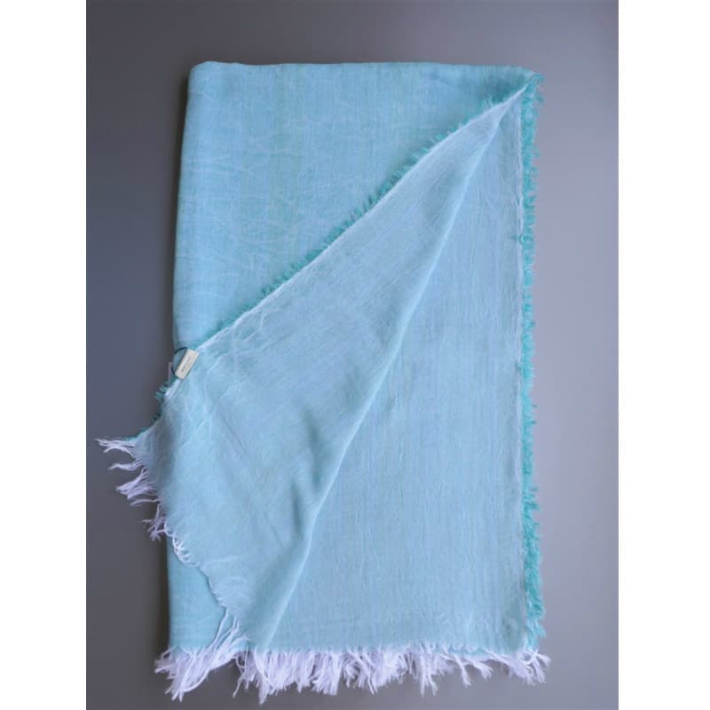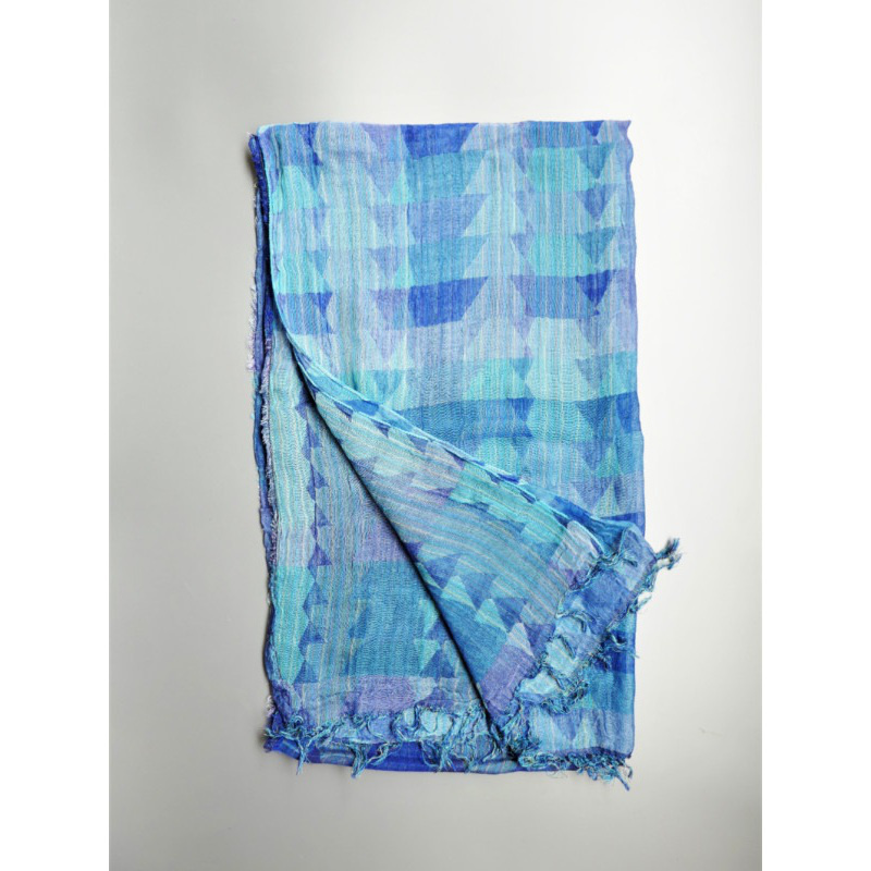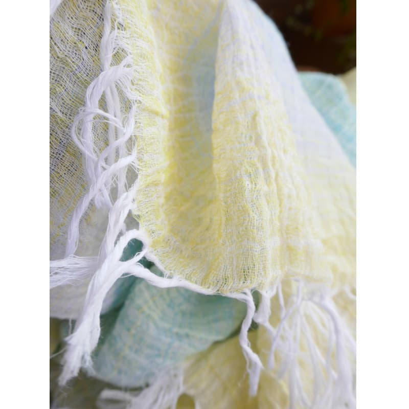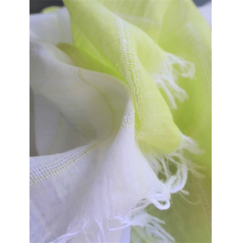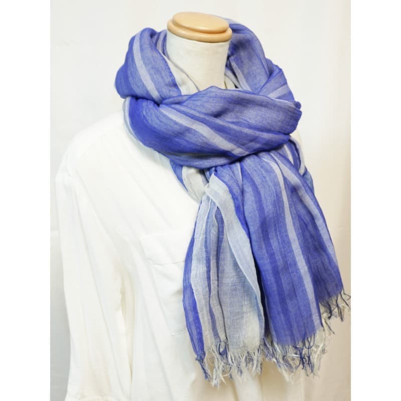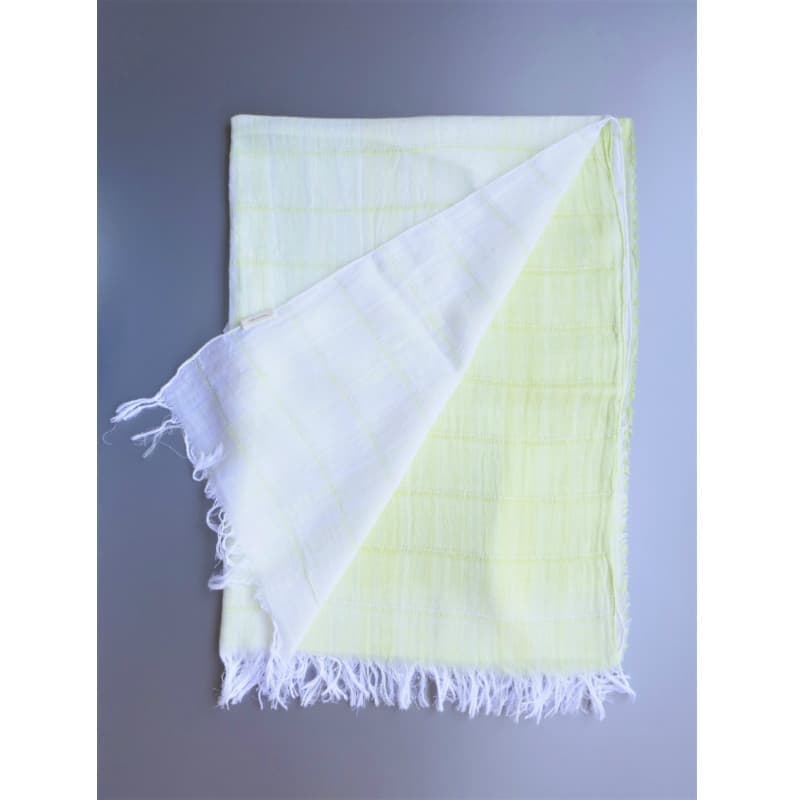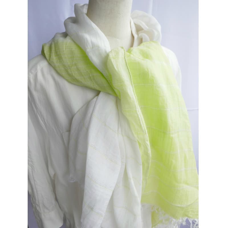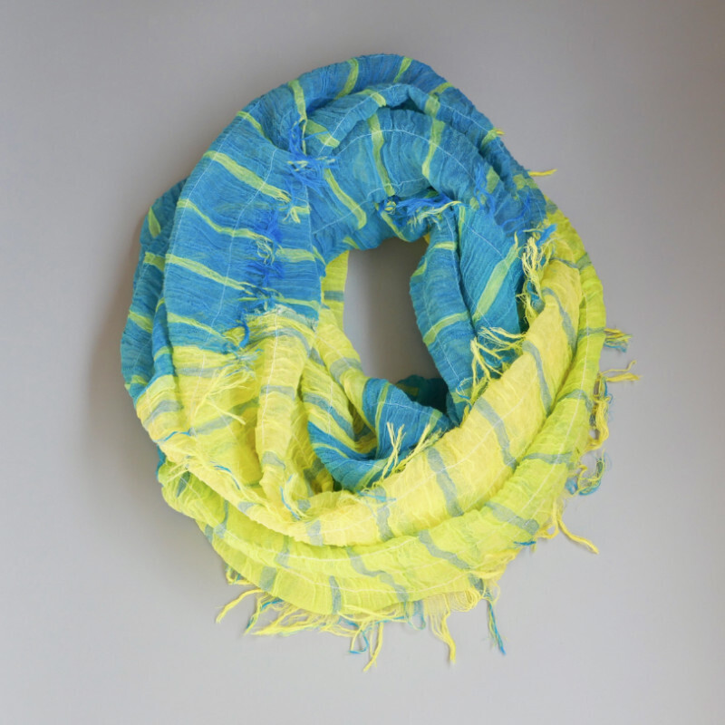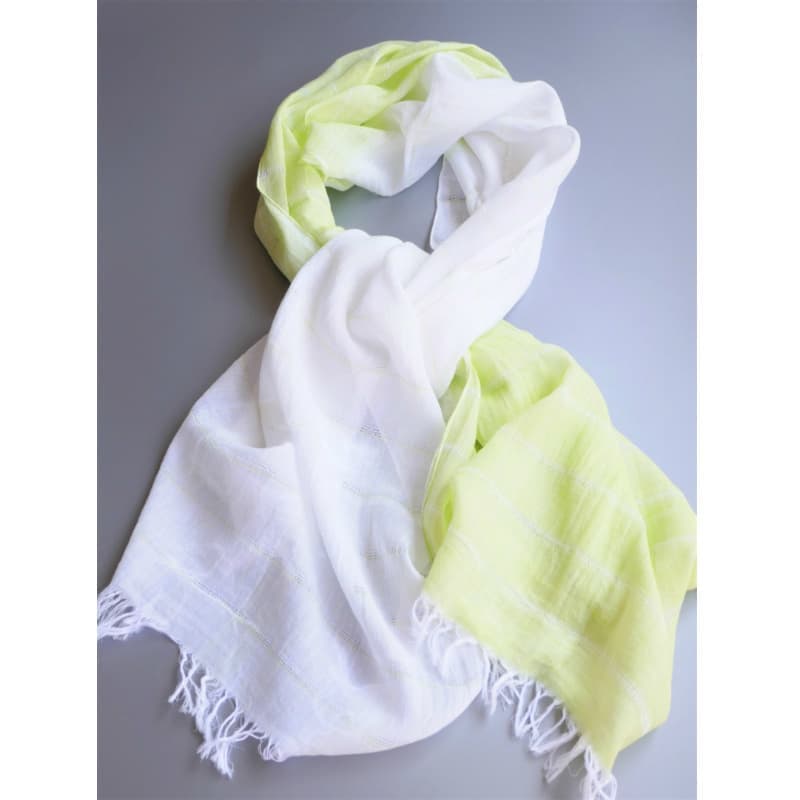 ブルーにイエローのストライプ、反対配色のイエローにブルーのストライプ。2枚仕立てのブルーとイエローが相まって全体の印象は熱帯魚の様なブルーグリーンに見える大判ストールです。