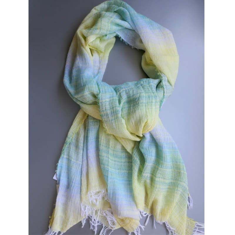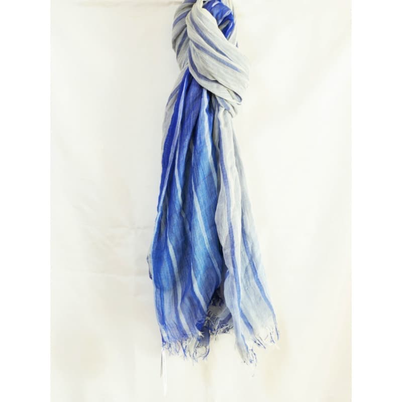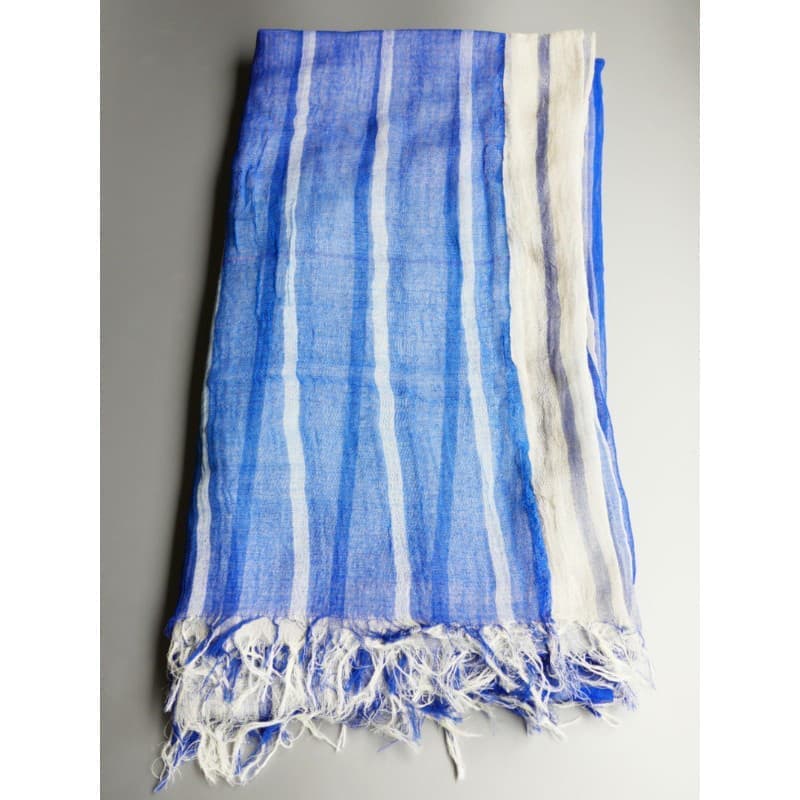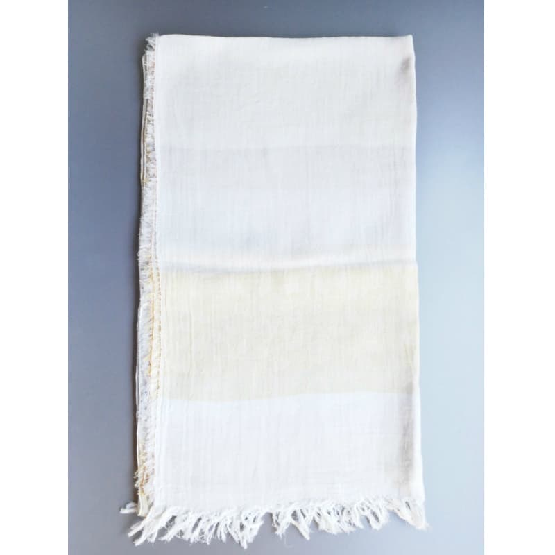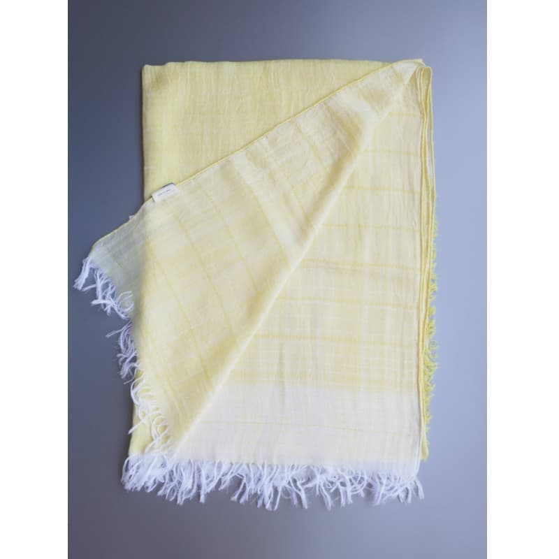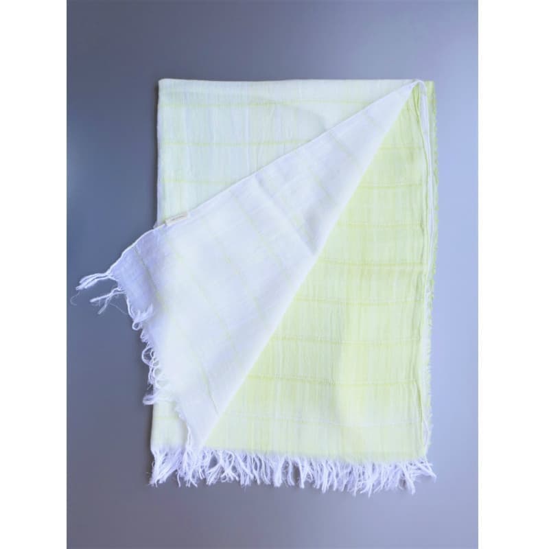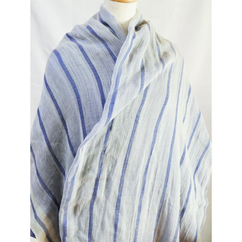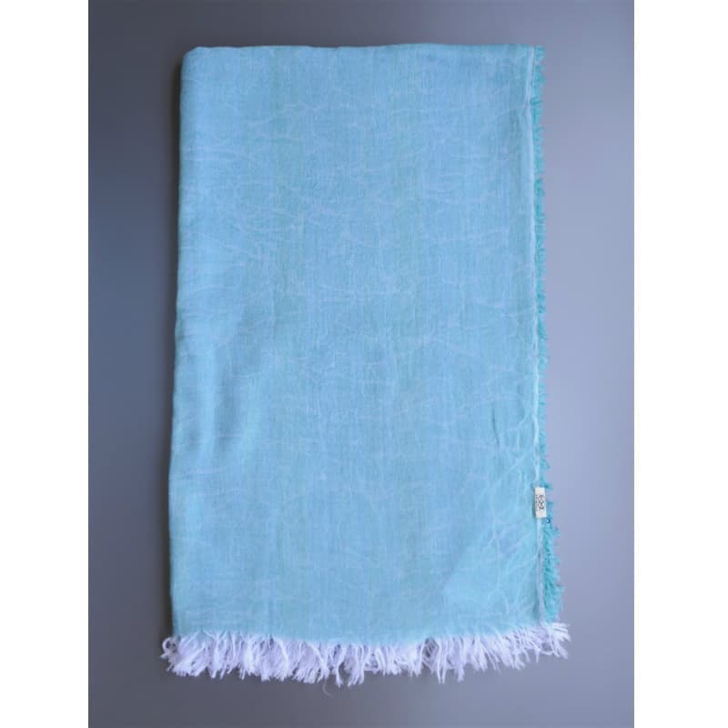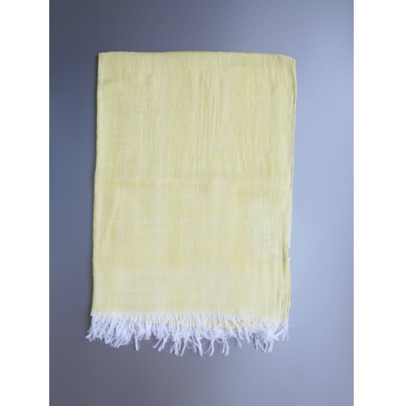 ブルーにイエローのストライプ、反対配色のイエローにブルーのストライプ。2枚仕立てのブルーとイエローが相まって全体の印象は熱帯魚の様なブルーグリーンに見える大判ストールです。