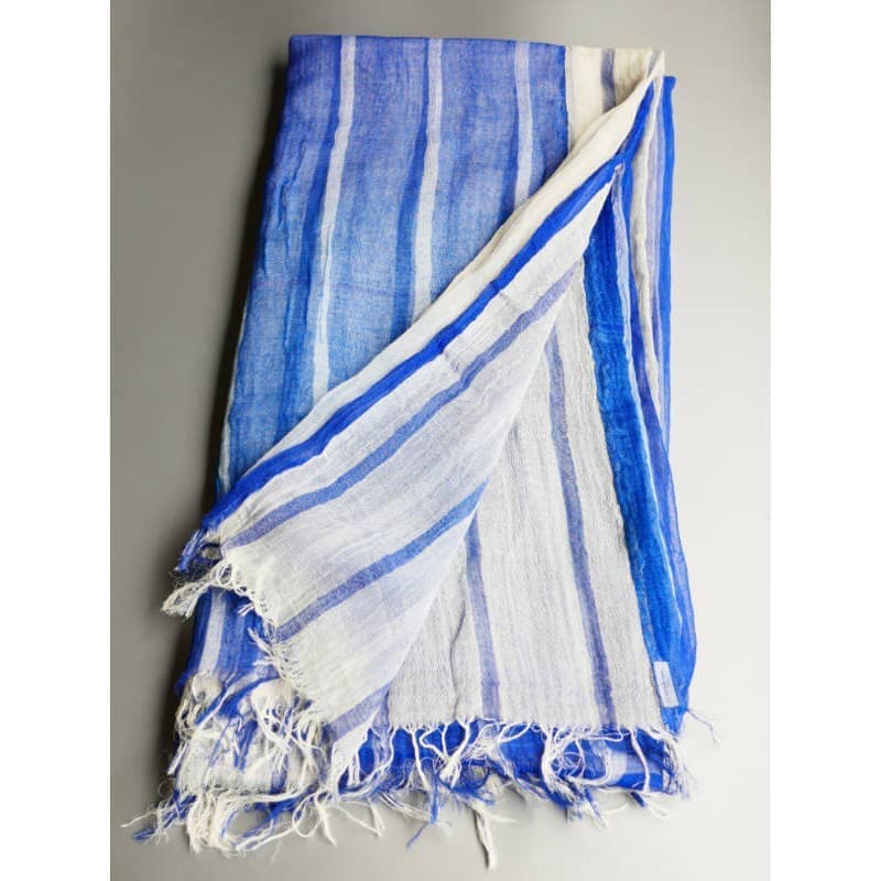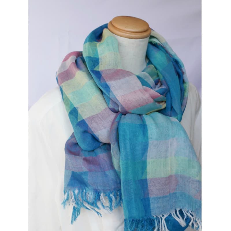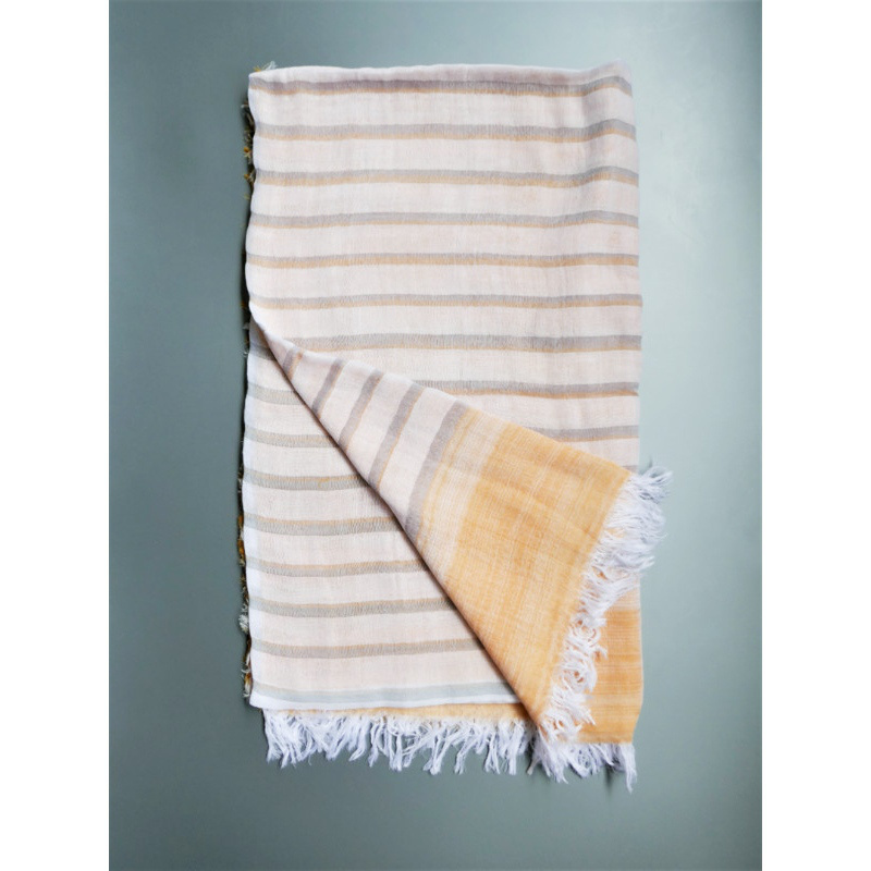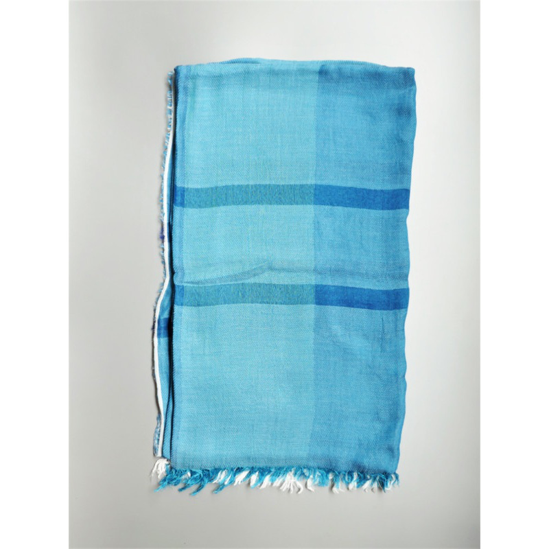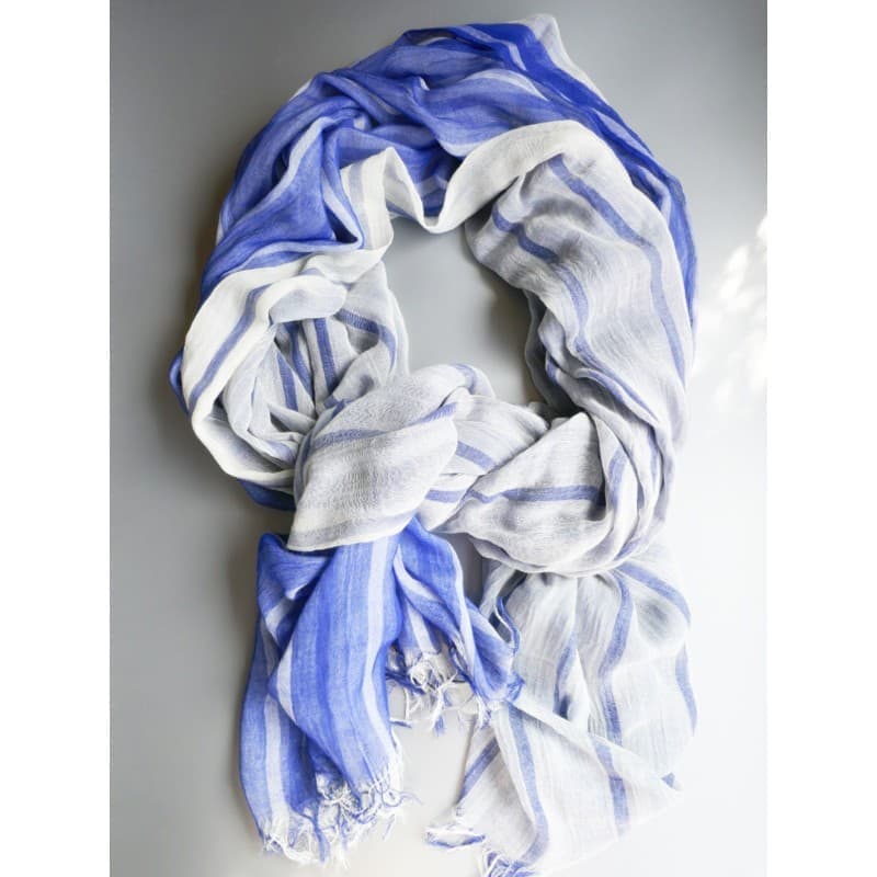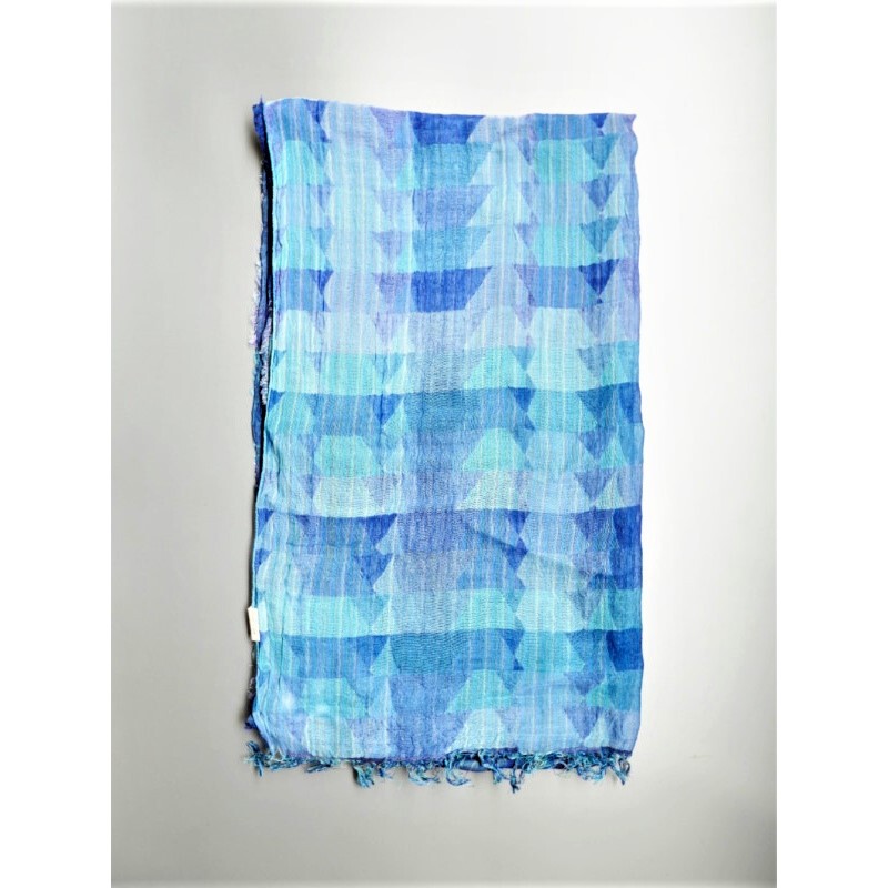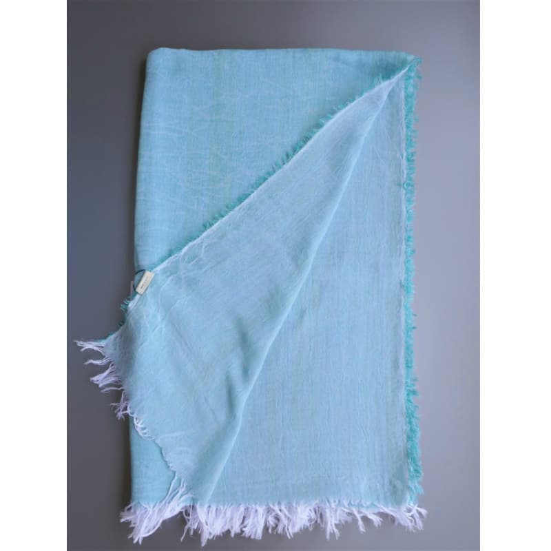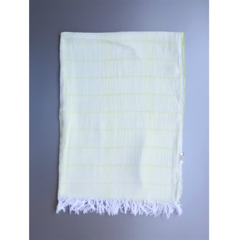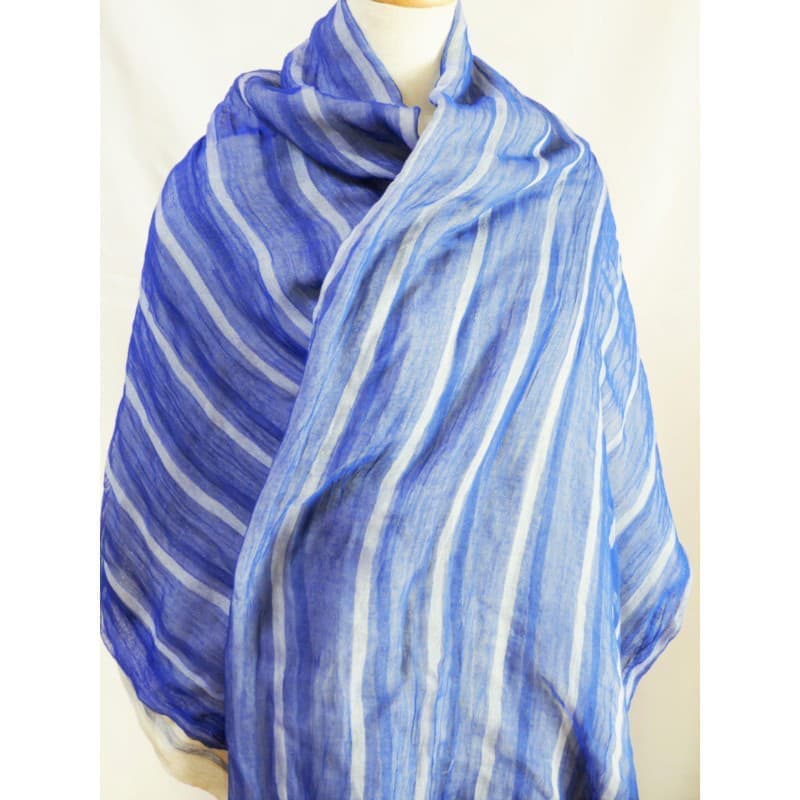 ブルーにイエローのストライプ、反対配色のイエローにブルーのストライプ。2枚仕立てのブルーとイエローが相まって全体の印象は熱帯魚の様なブルーグリーンに見える大判ストールです。