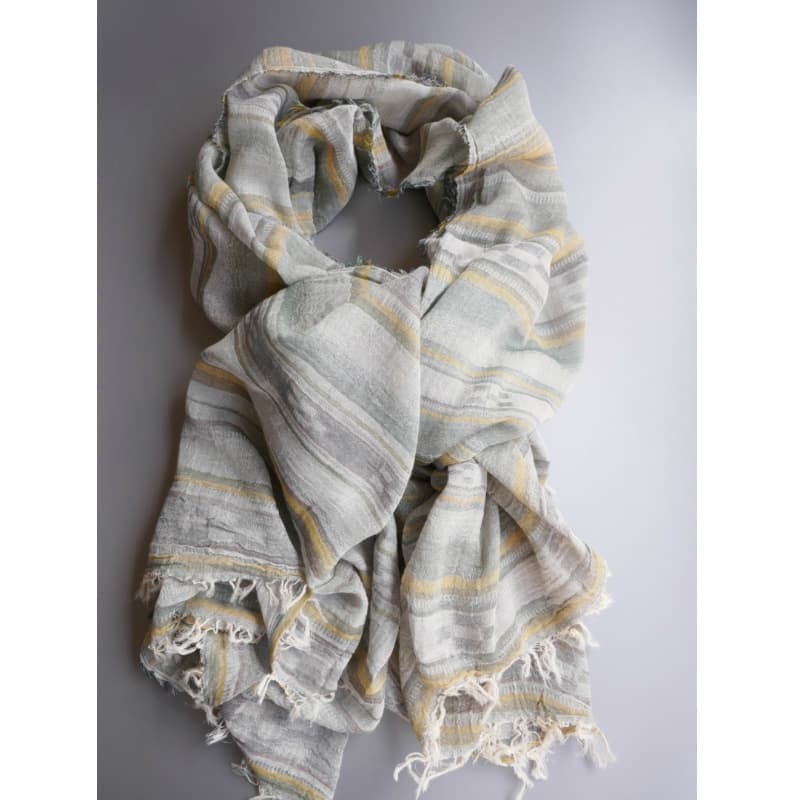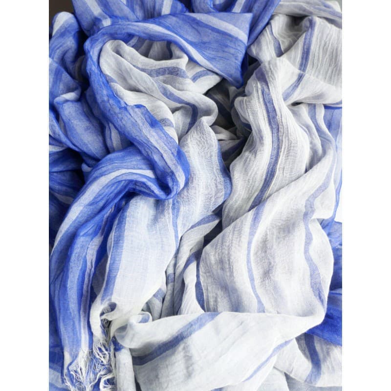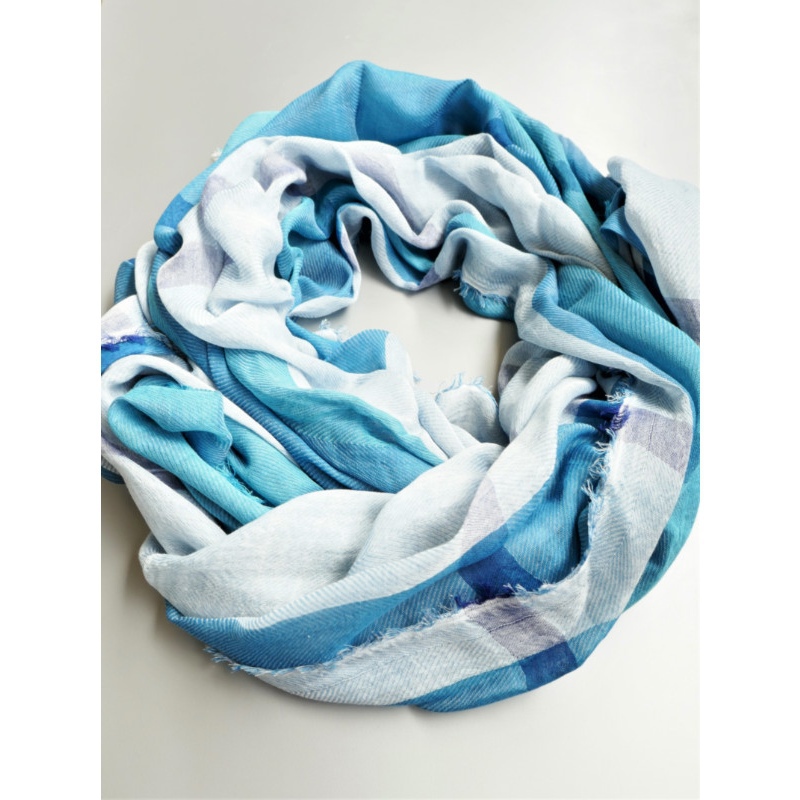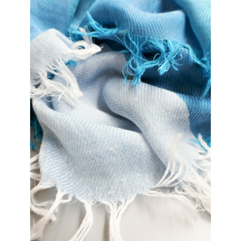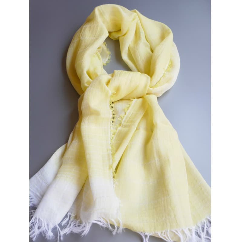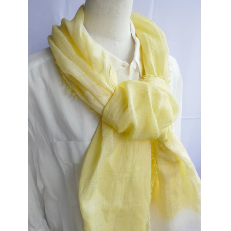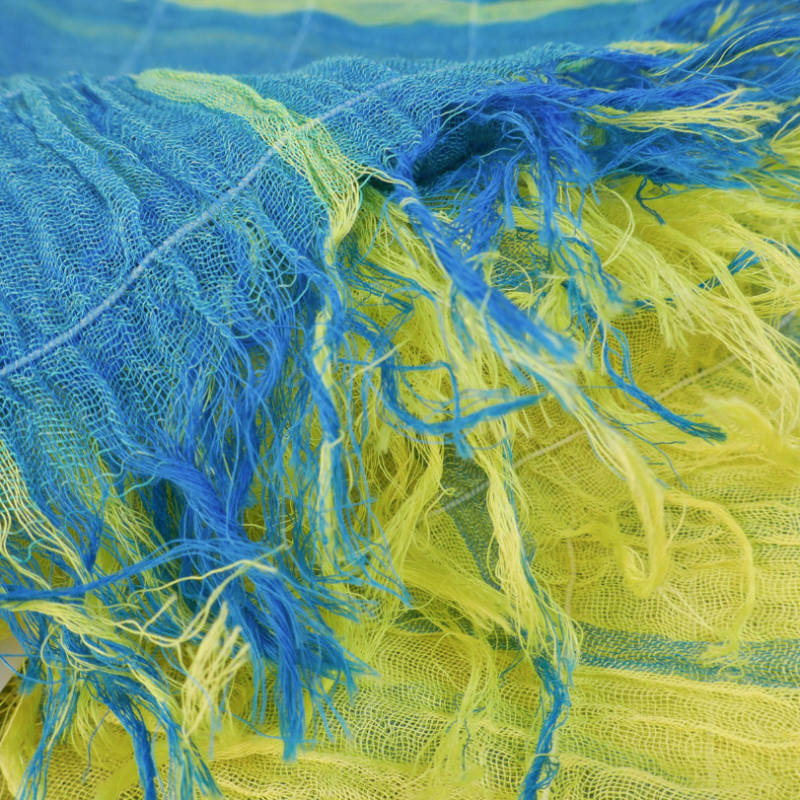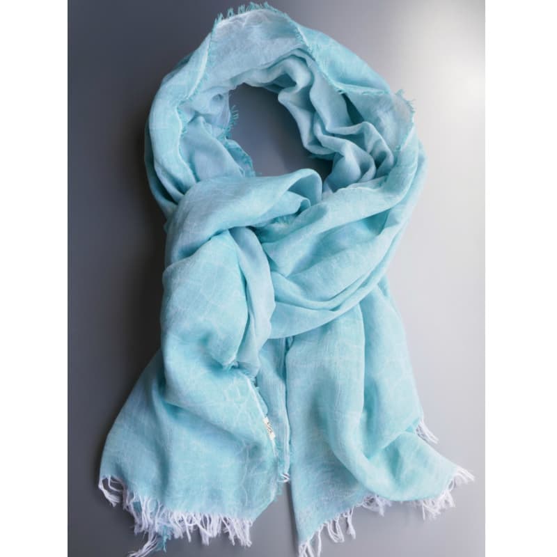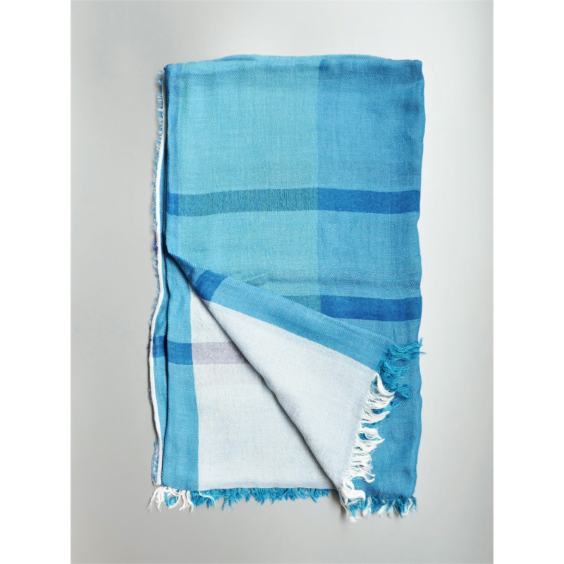ブルーにイエローのストライプ、反対配色のイエローにブルーのストライプ。2枚仕立てのブルーとイエローが相まって全体の印象は熱帯魚の様なブルーグリーンに見える大判ストールです。