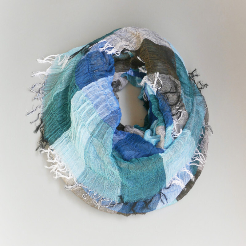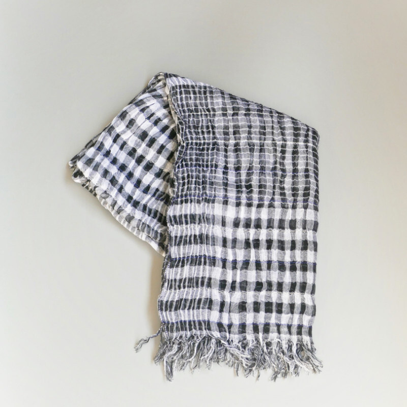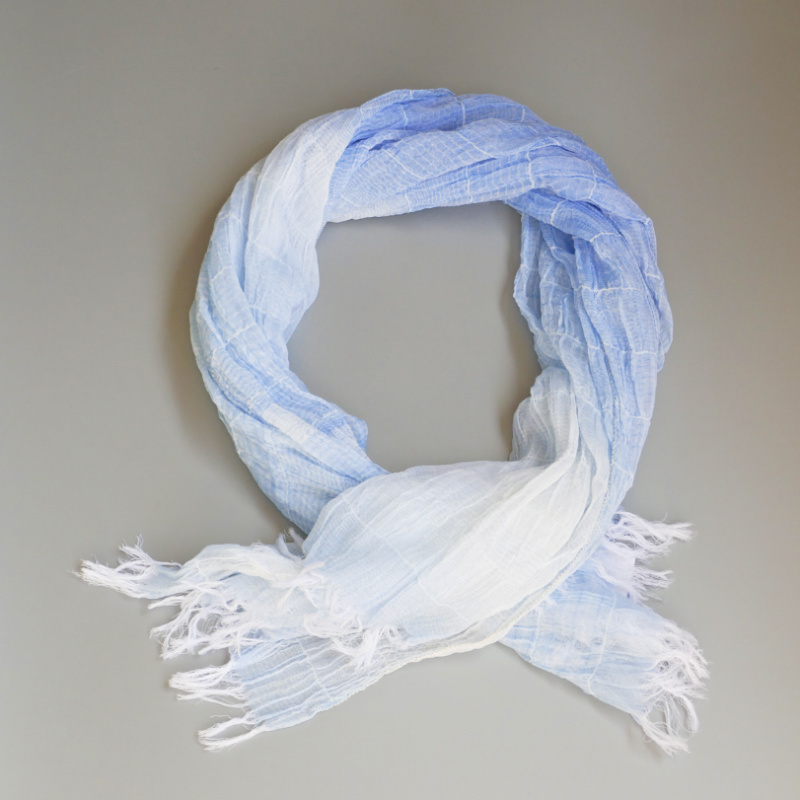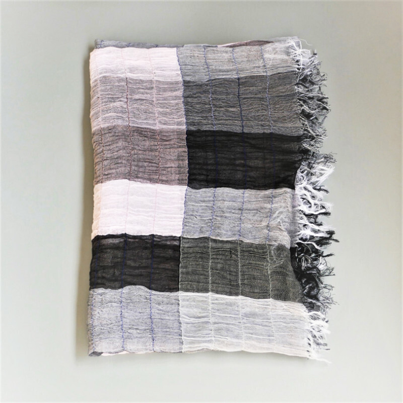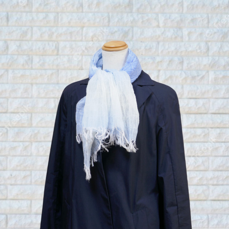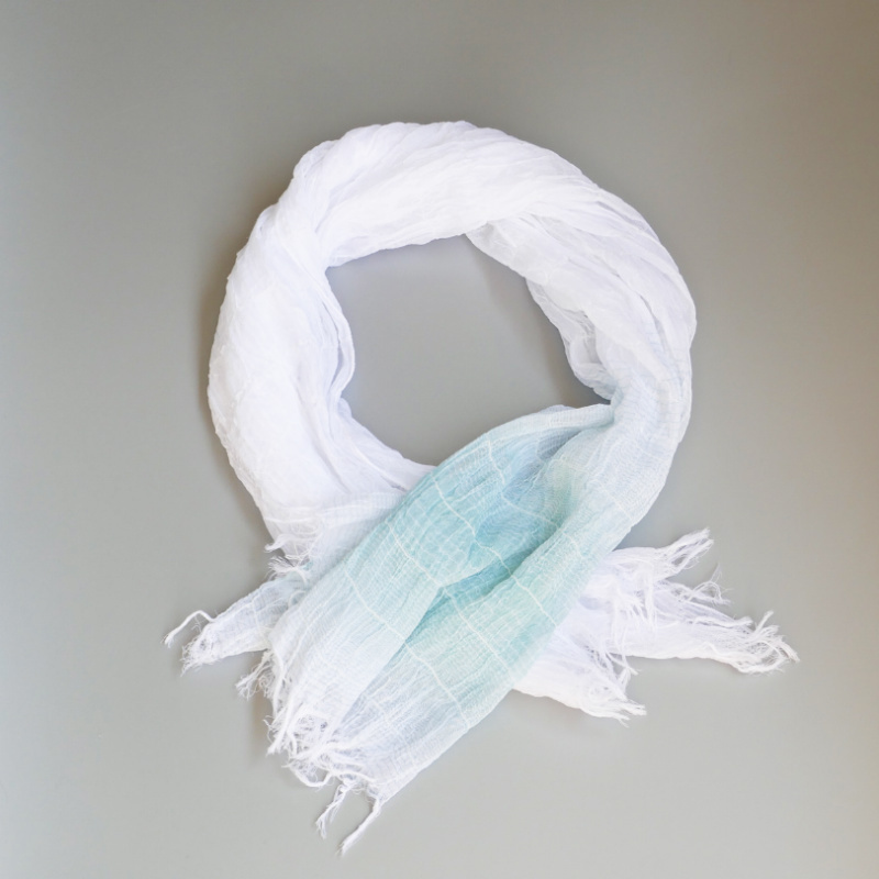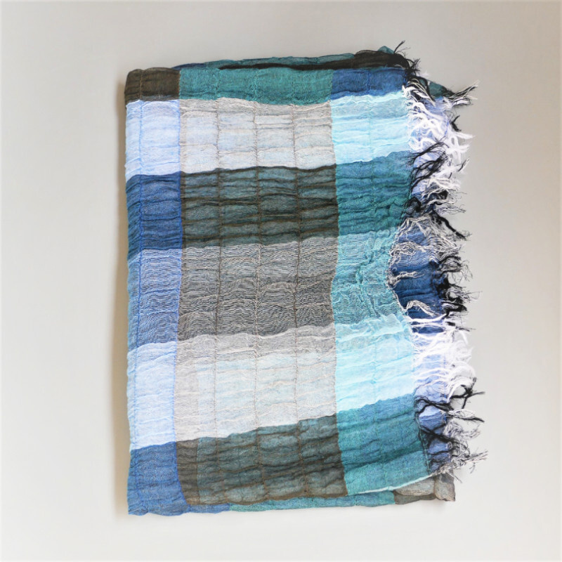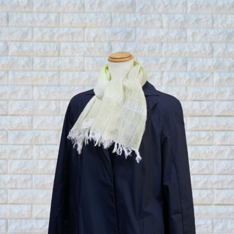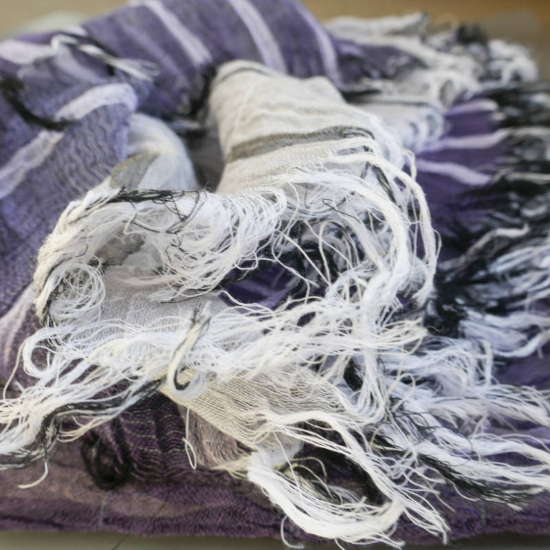 織馬鹿さんが作り出す播州織のマフラー・ストールには素晴らしい日本の伝統技術が生かされています。一枚一枚とても細い糸で織上げられて創り出されるその織地は、透け感があり緻密で肌触りが良く、軽く、そして何より美しいです。