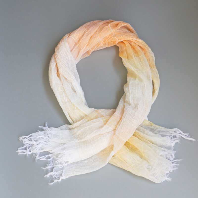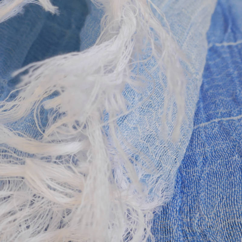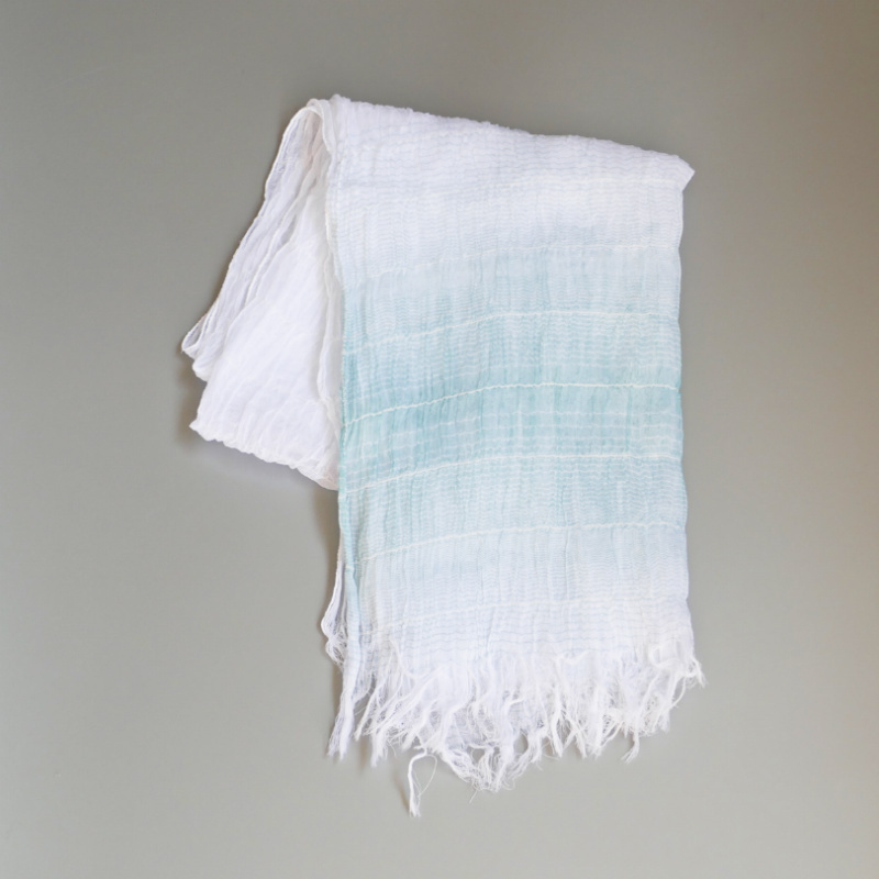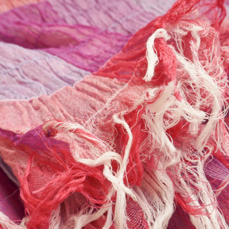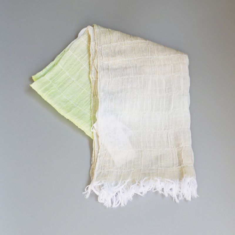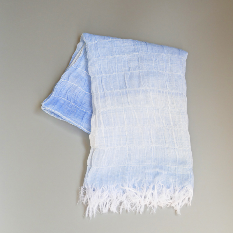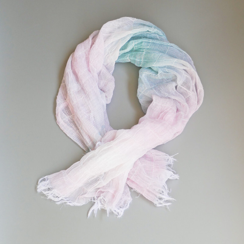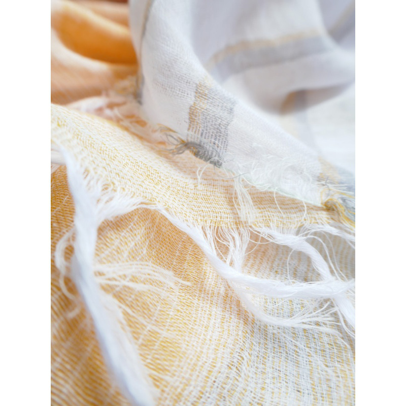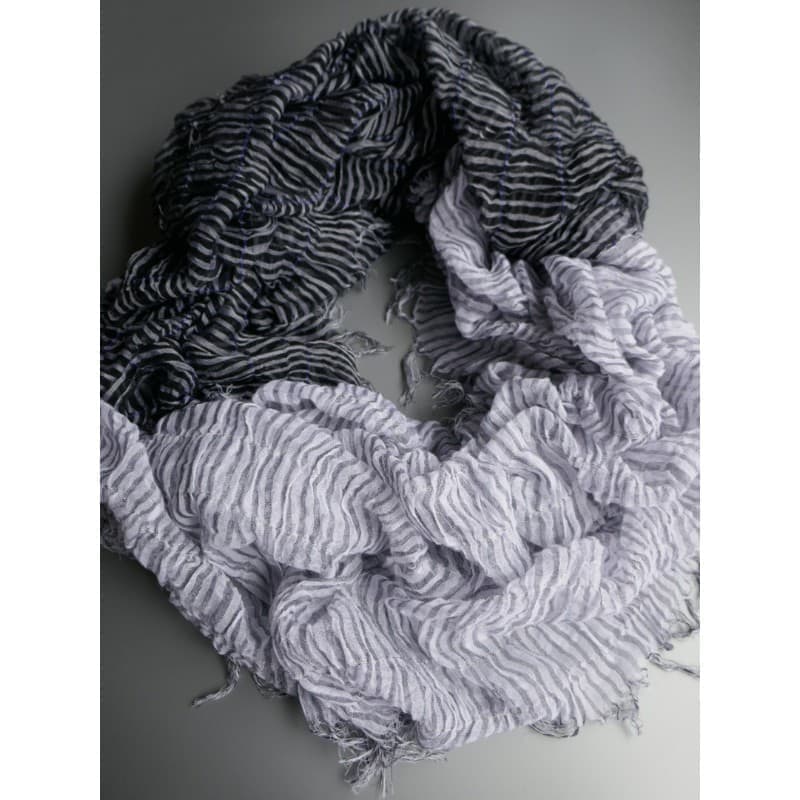 織馬鹿さんが作り出す播州織のマフラー・ストールには素晴らしい日本の伝統技術が生かされています。一枚一枚とても細い糸で織上げられて創り出されるその織地は、透け感があり緻密で肌触りが良く、軽く、そして何より美しいです。