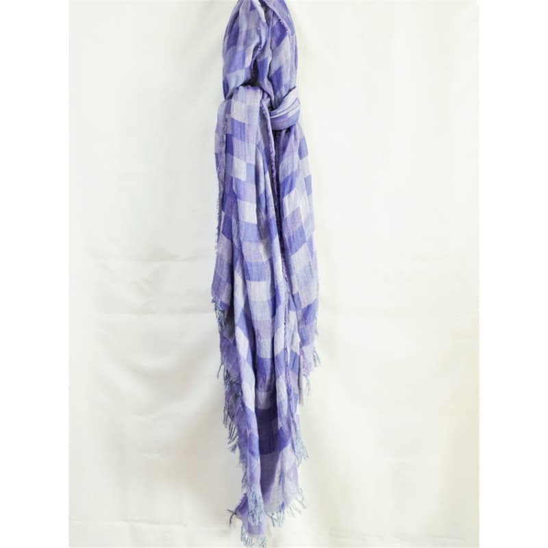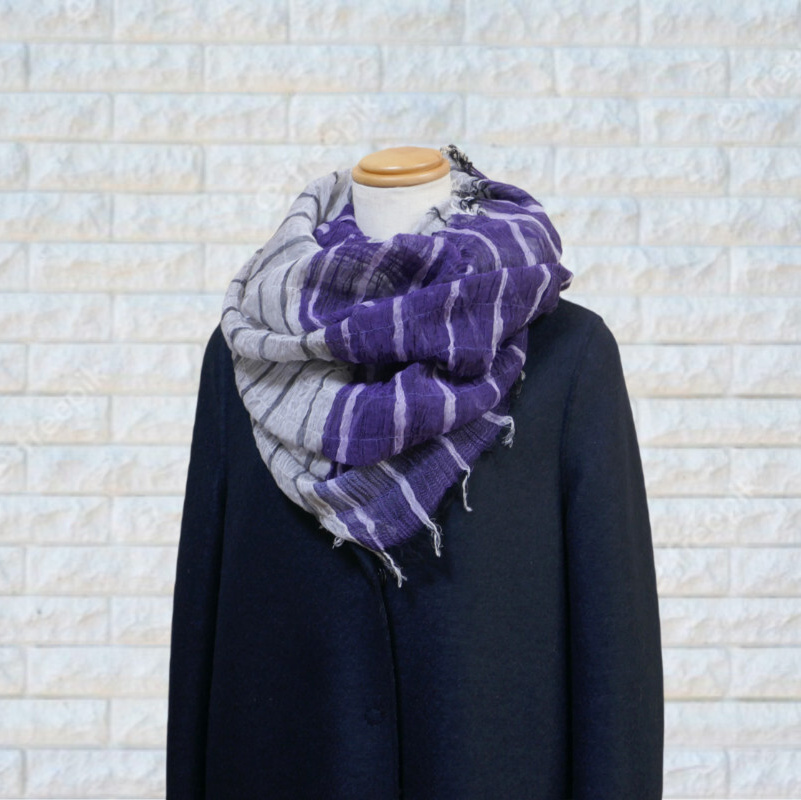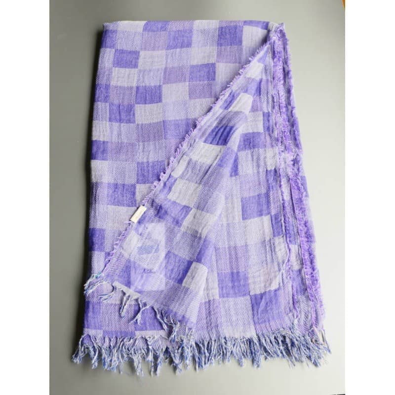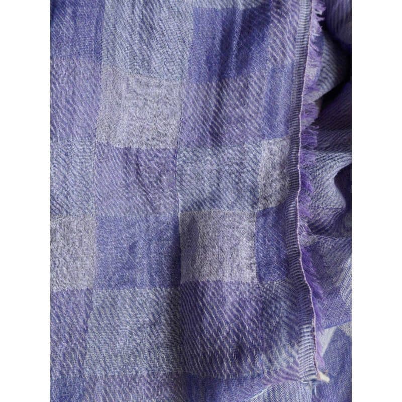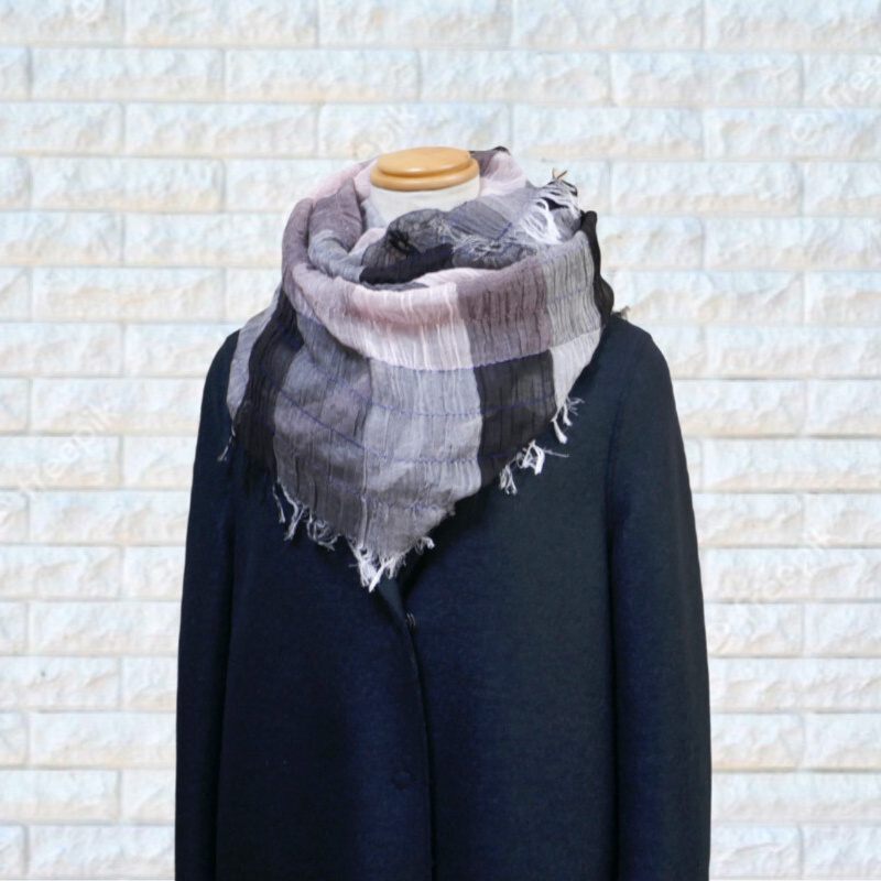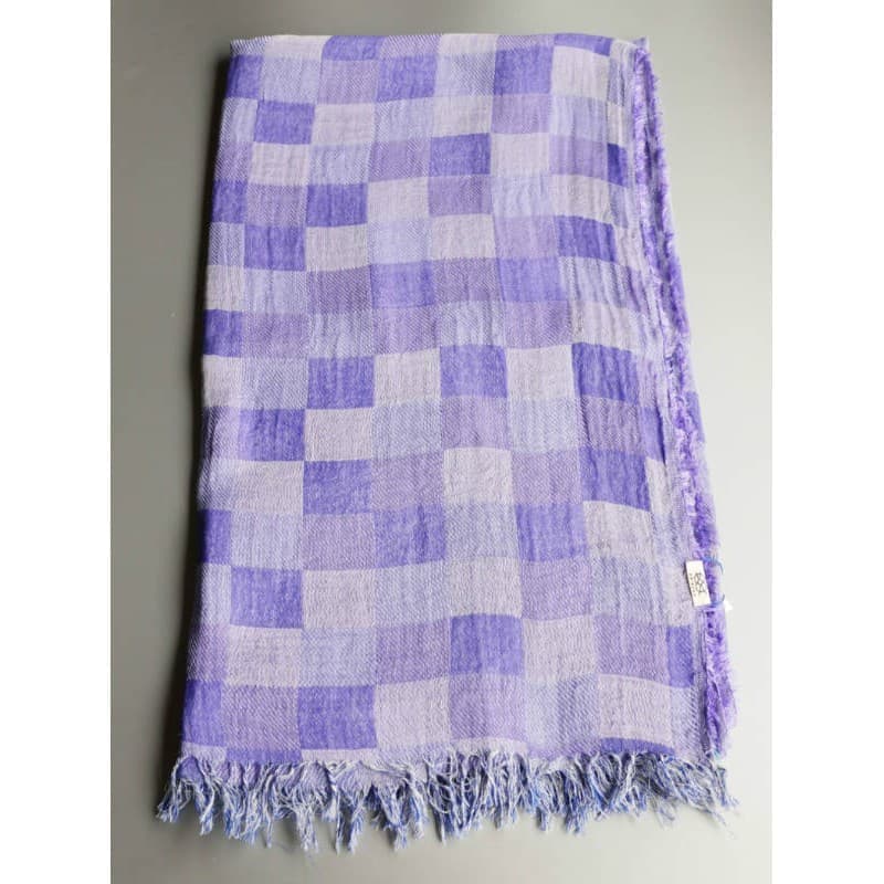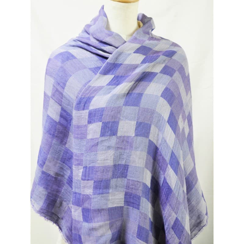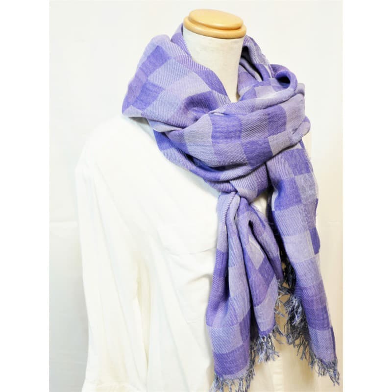 ネイビー・パープル・オフホワイトを織り込んだ変形市松模様の大判サイズのストールです。