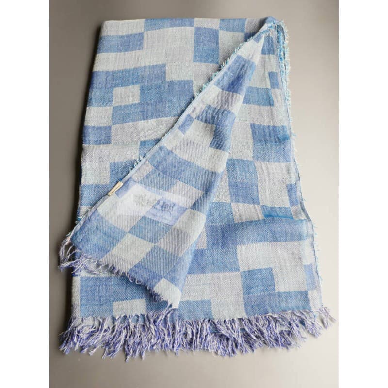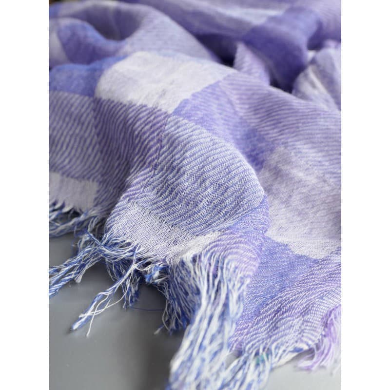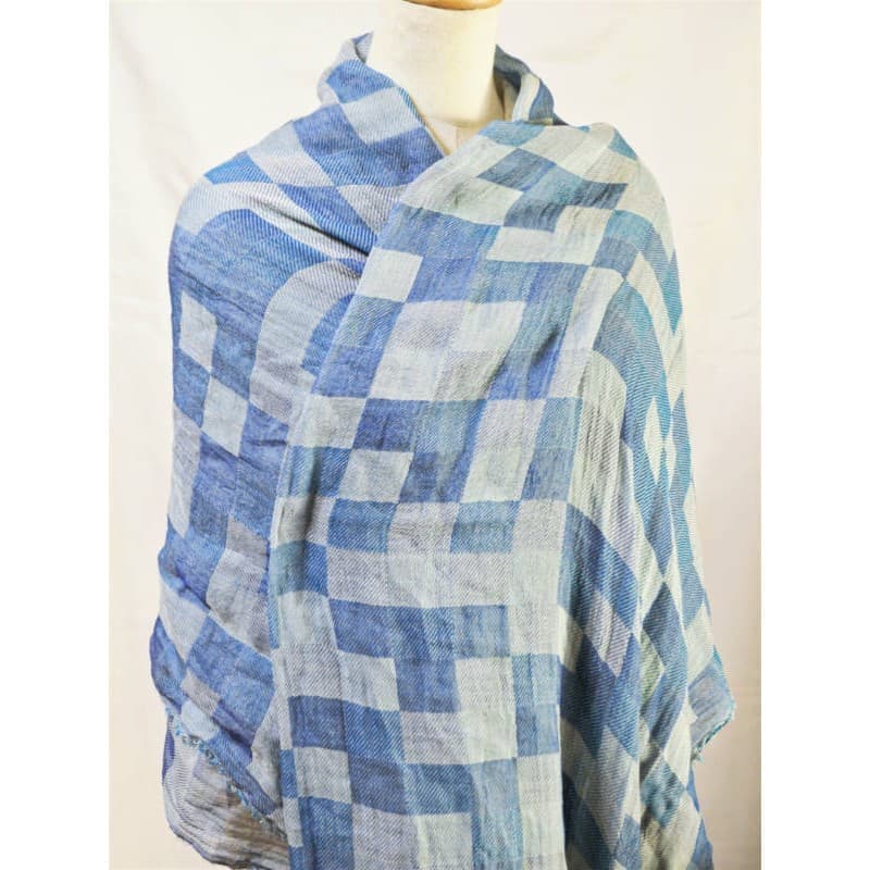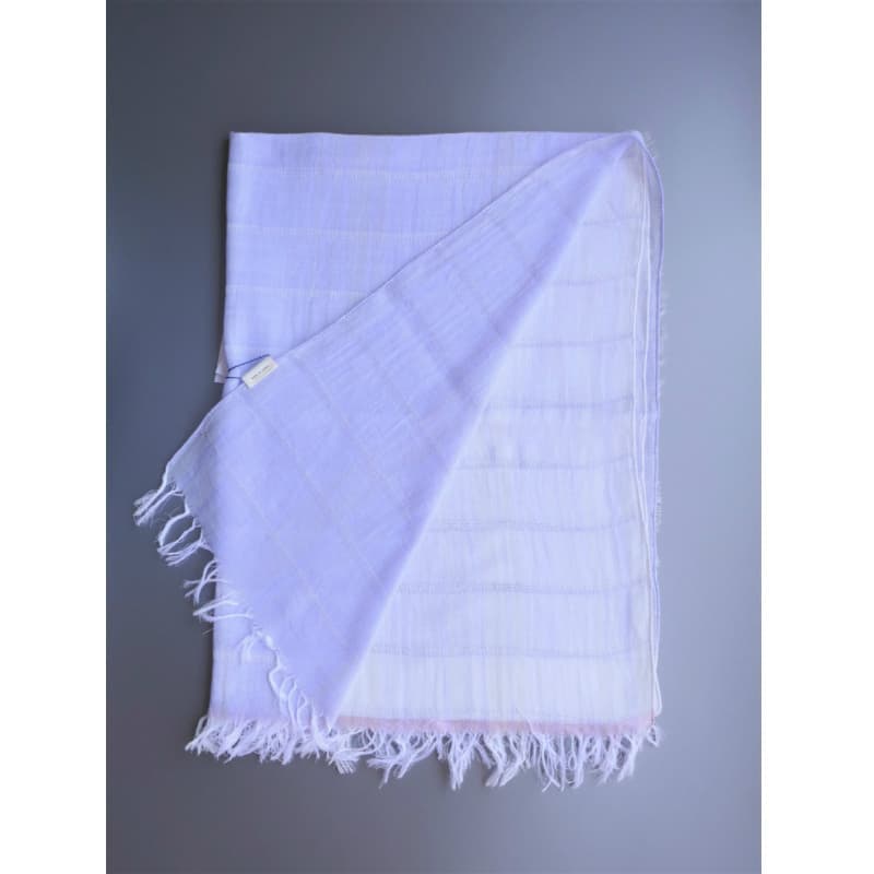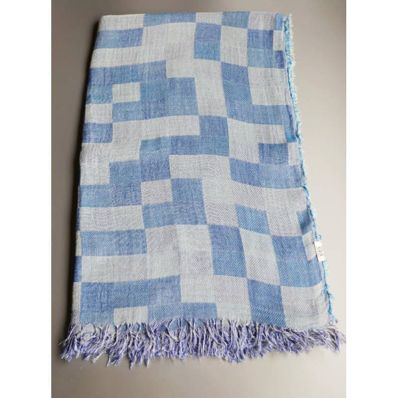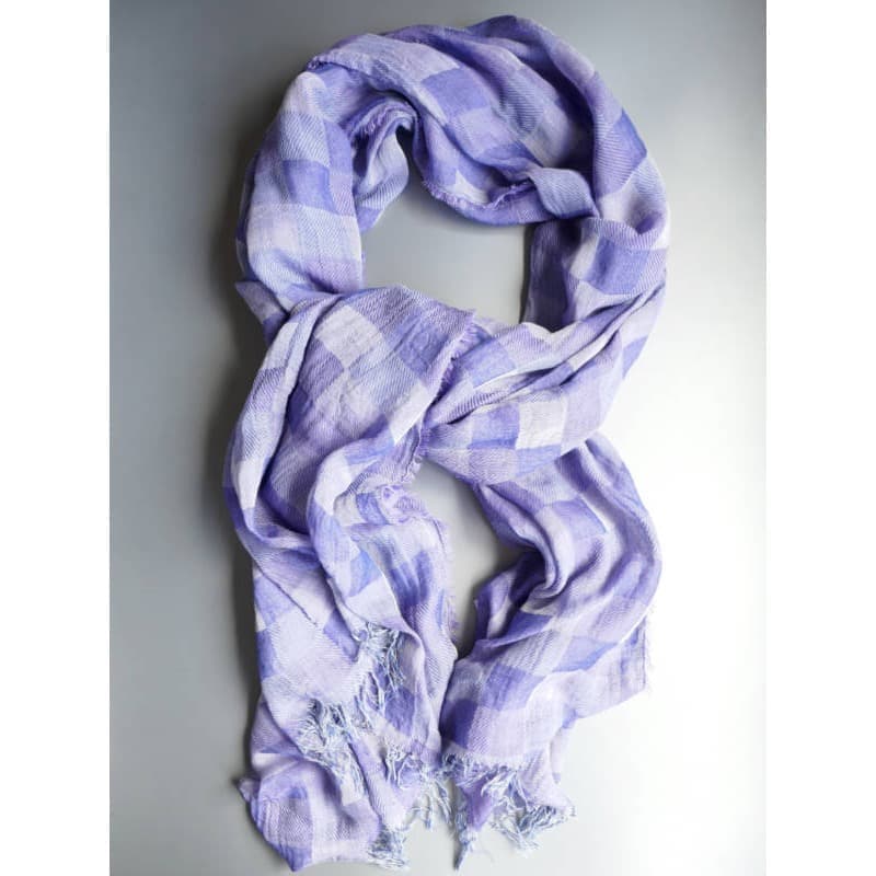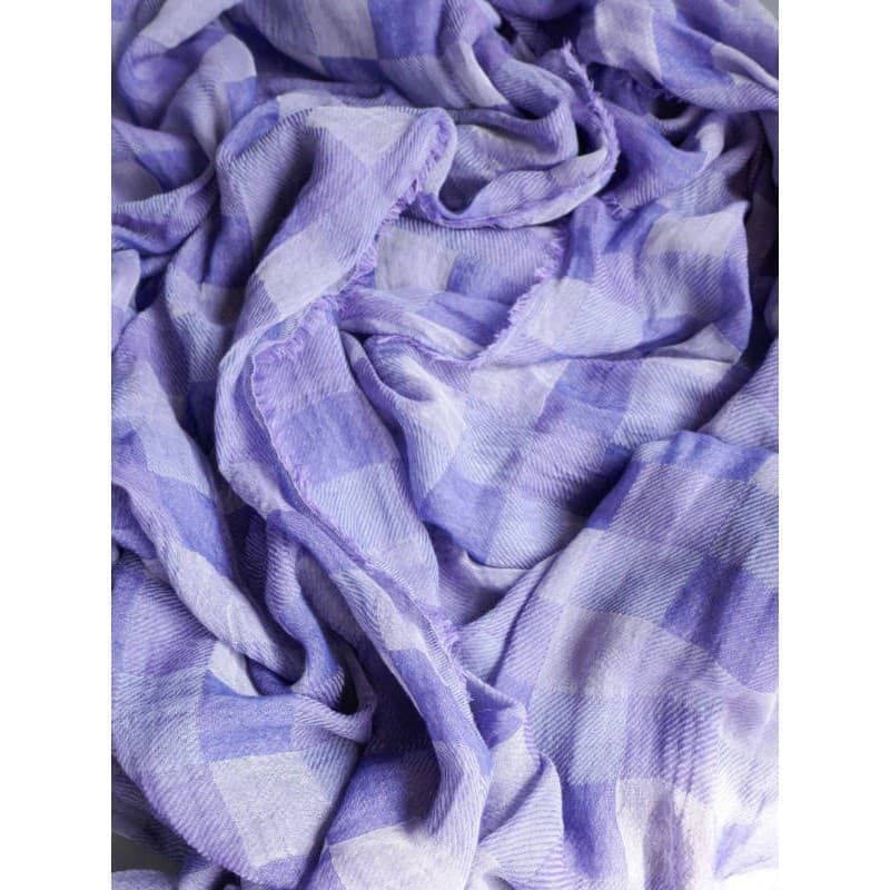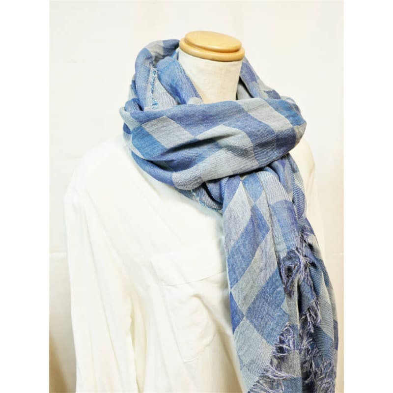 ネイビー・パープル・オフホワイトを織り込んだ変形市松模様の大判サイズのストールです。