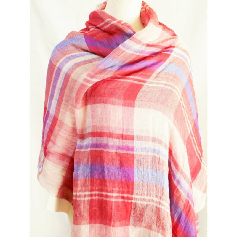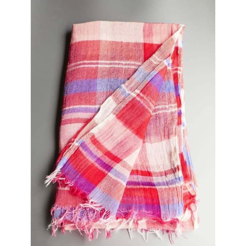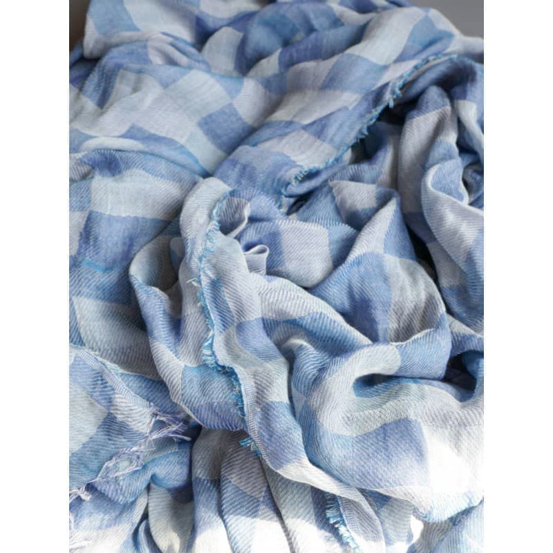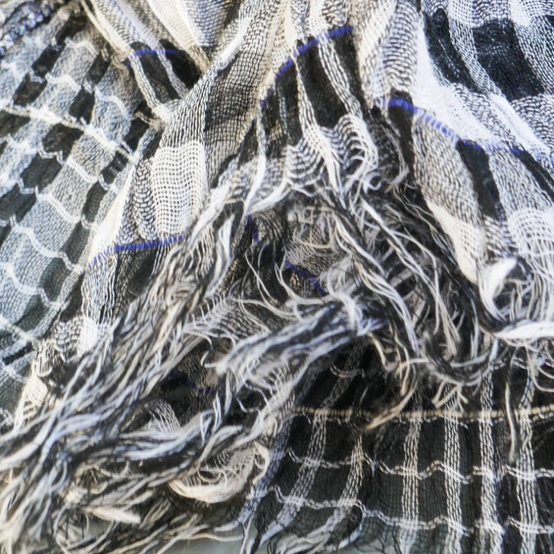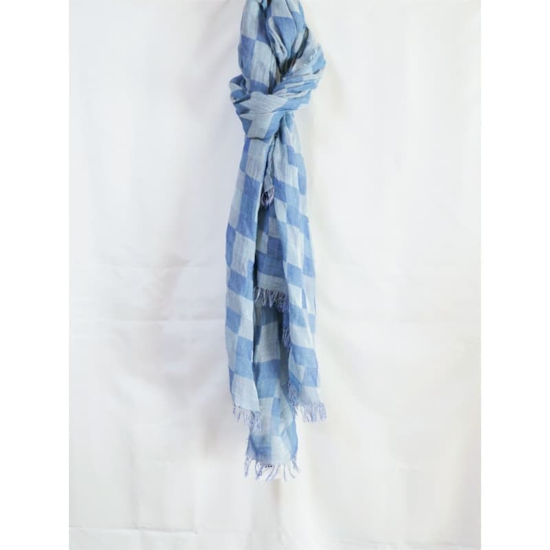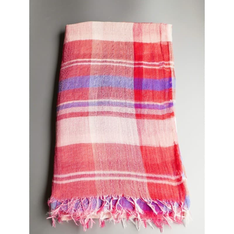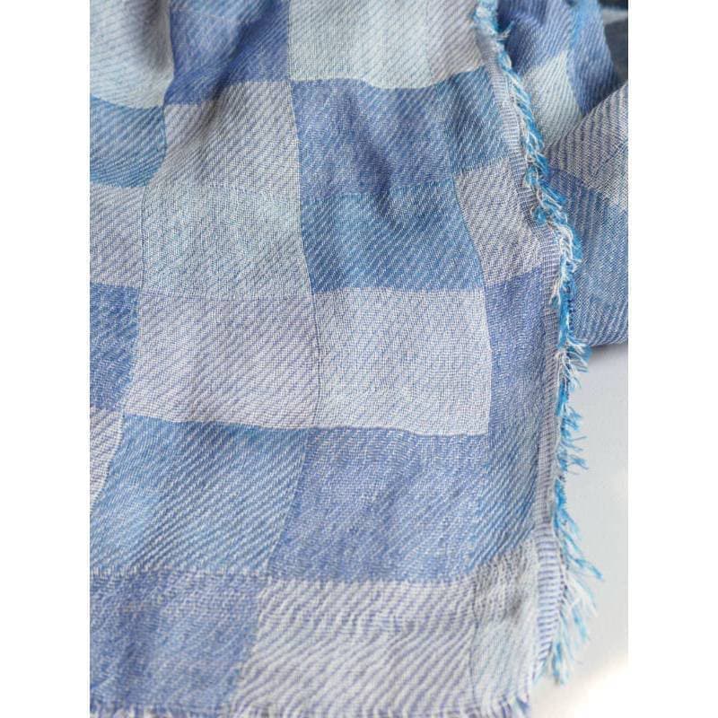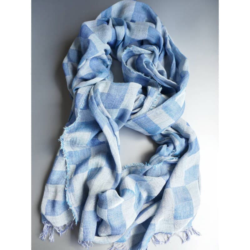ネイビー・パープル・オフホワイトを織り込んだ変形市松模様の大判サイズのストールです。