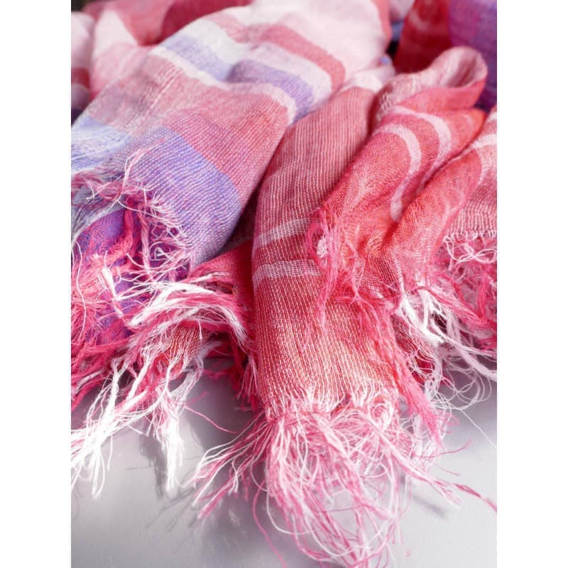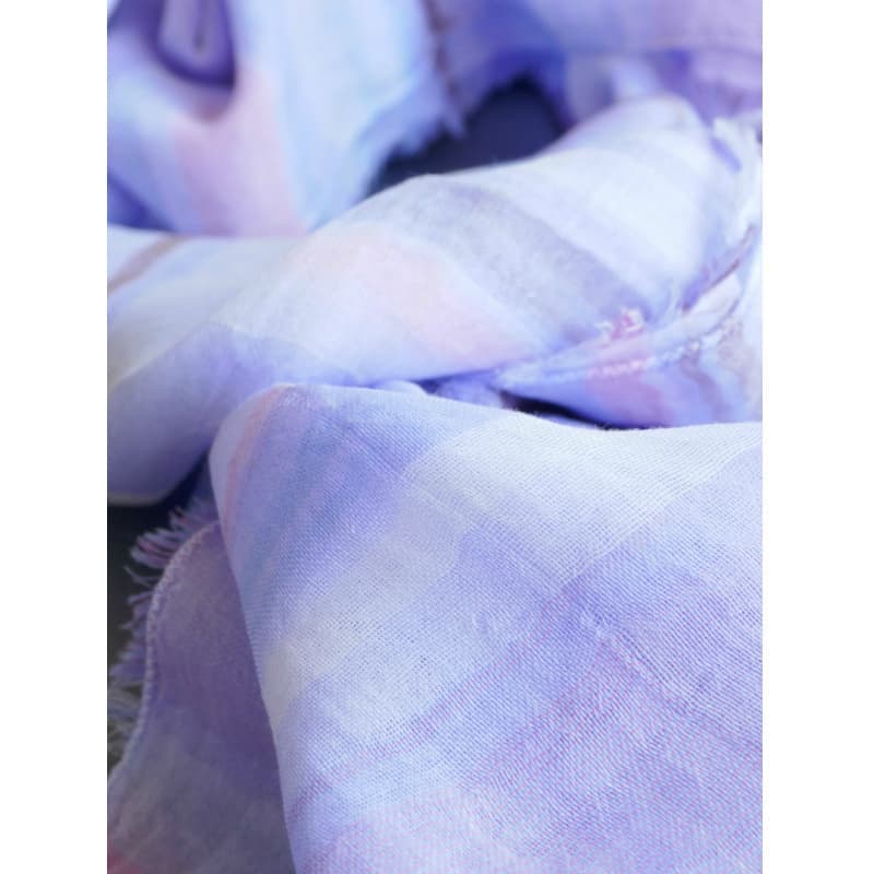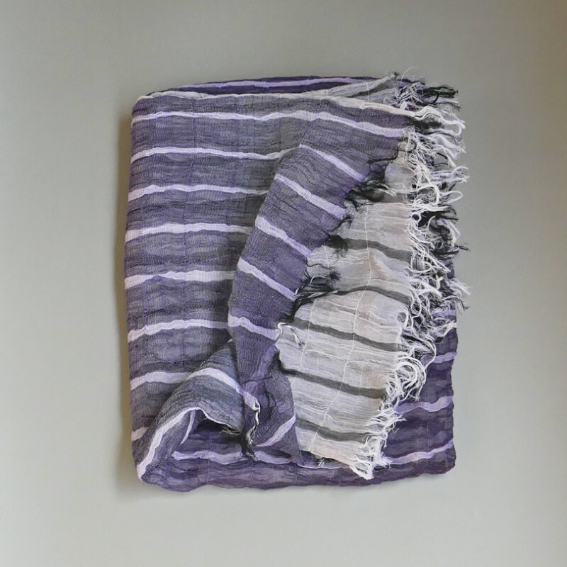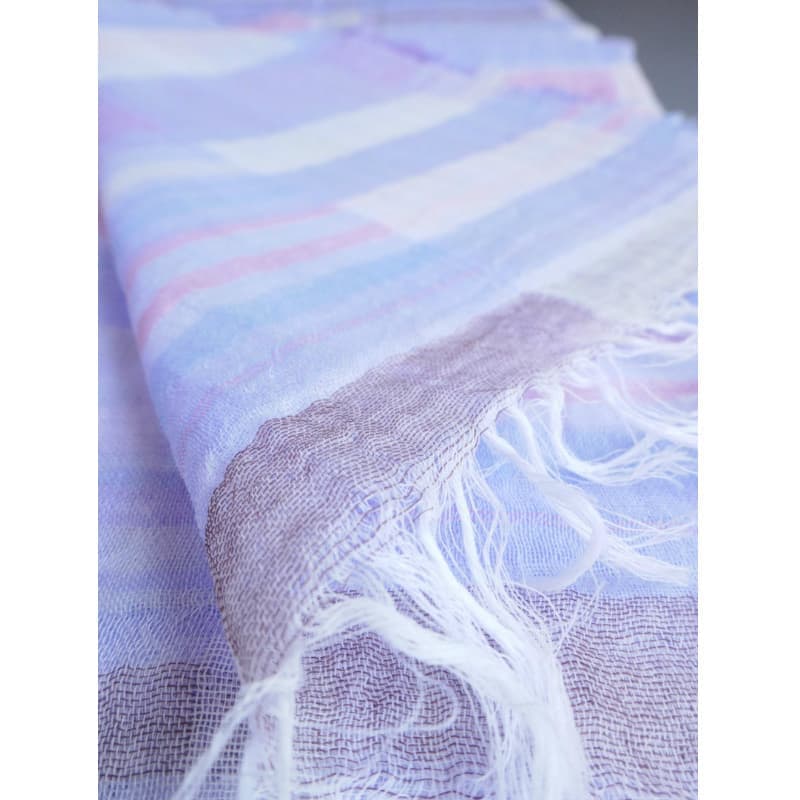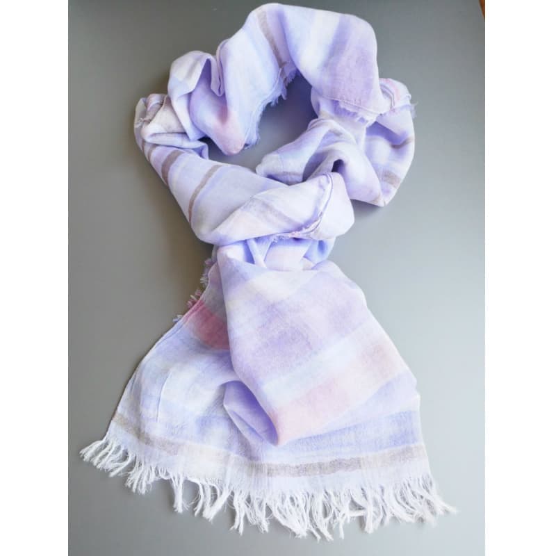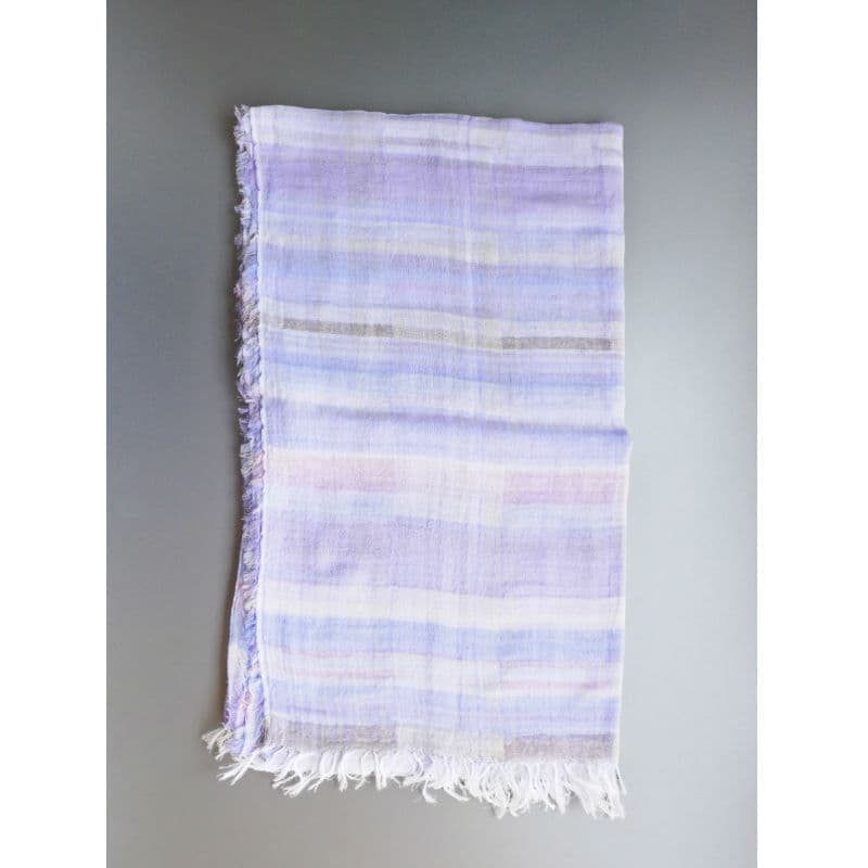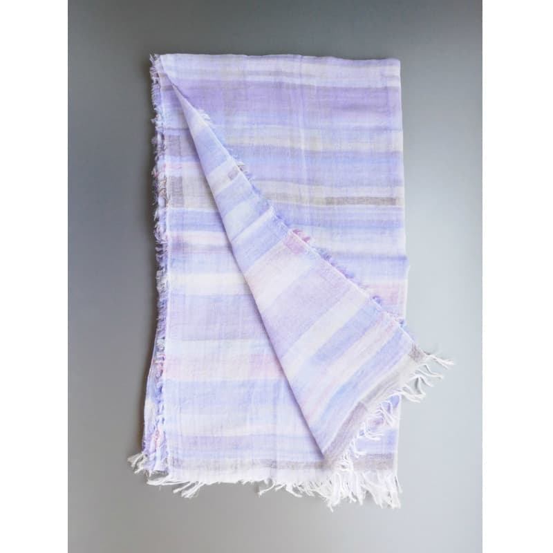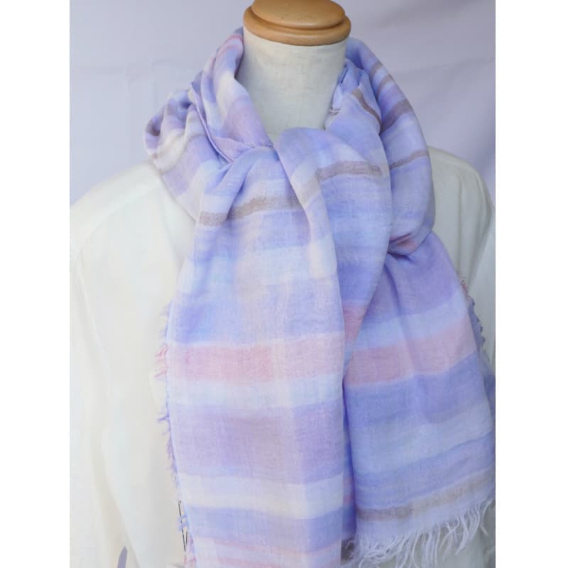 多色で複雑に織り成された不規則な優しい色のボーダー柄。基調となる薄めのパープルがとても上品です。