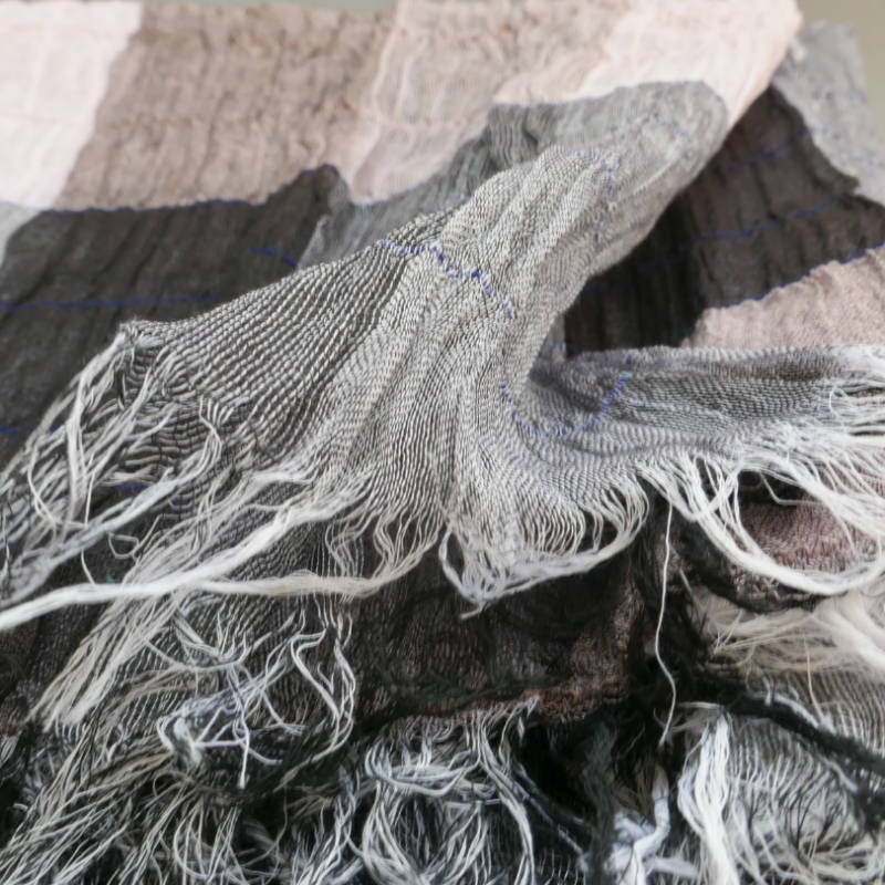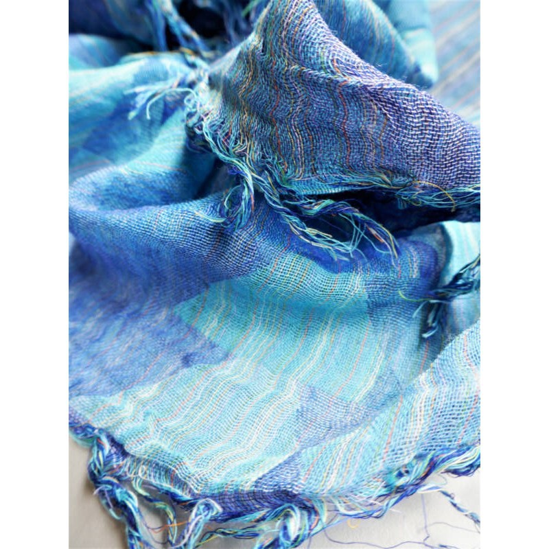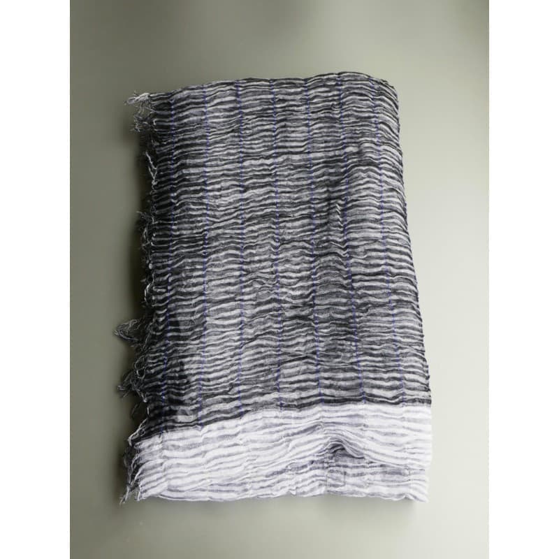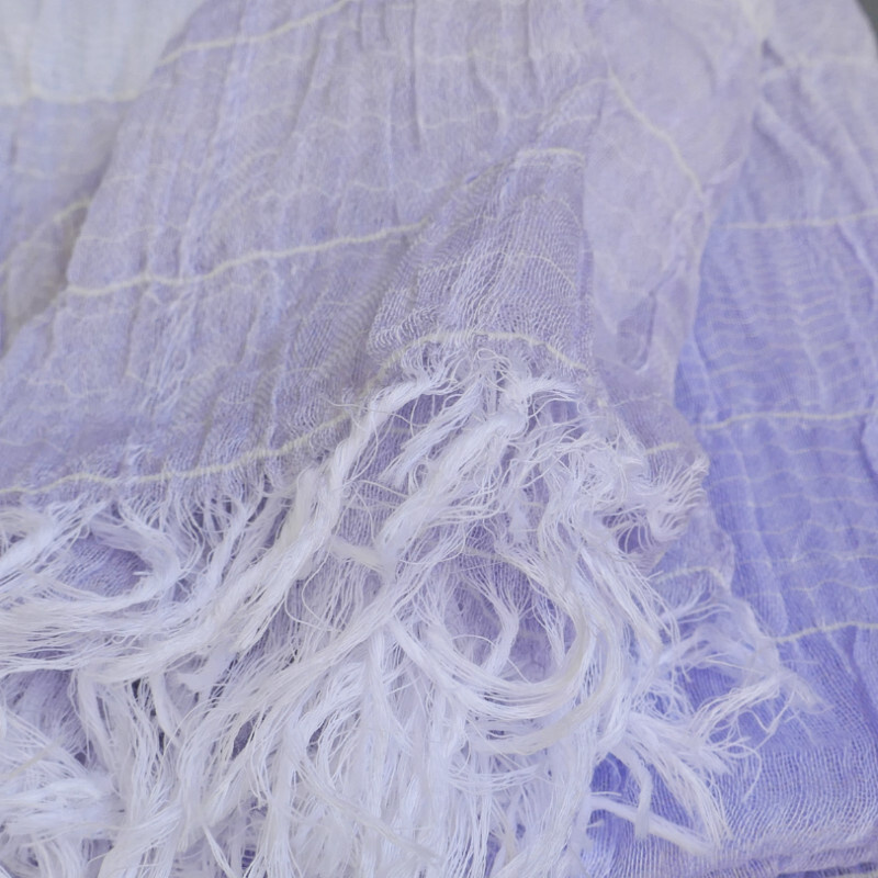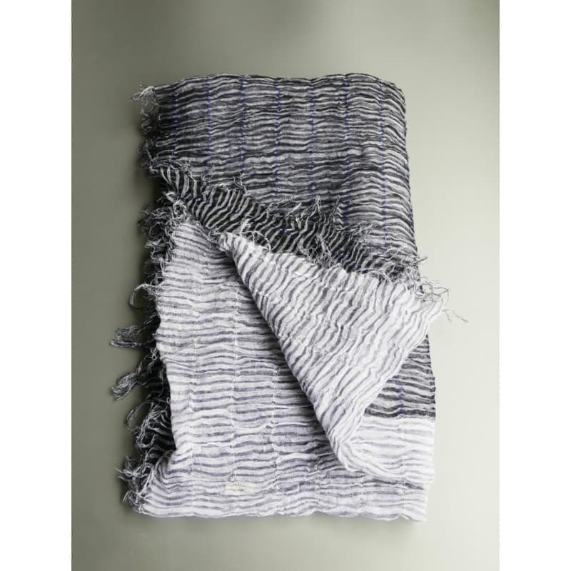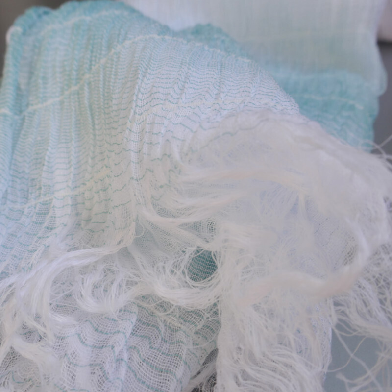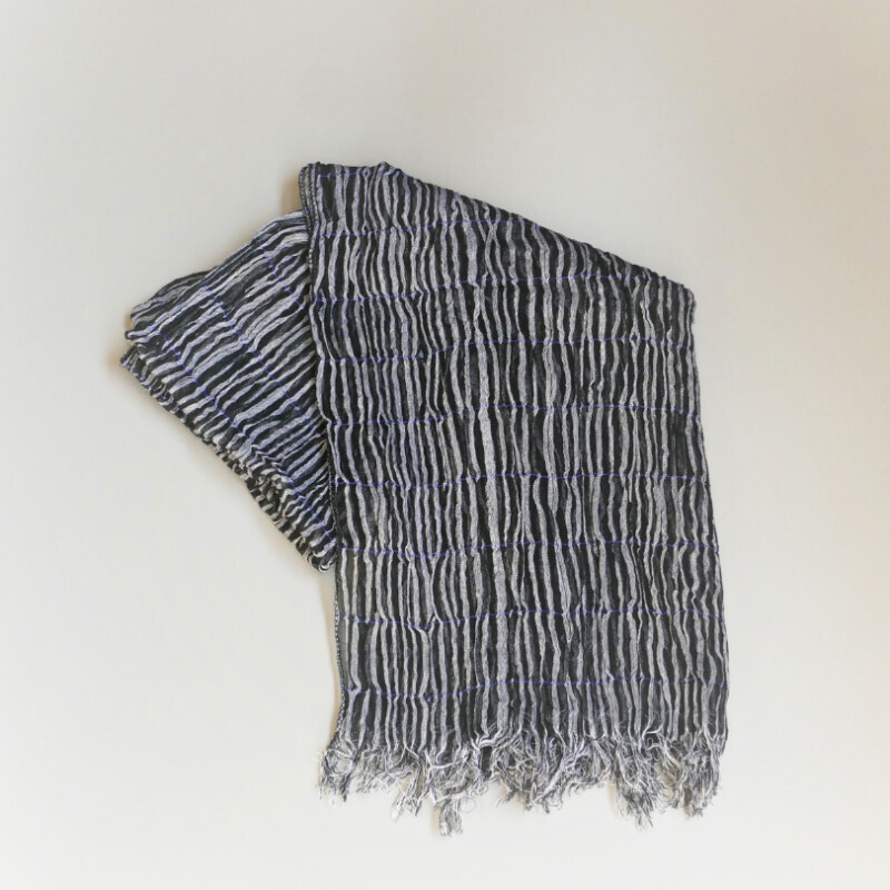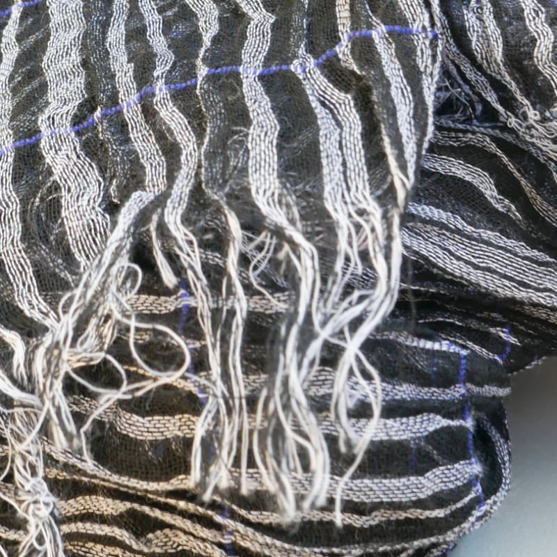 このストールは、経糸に普通糸、横糸に800~1000回捻った強燃糸を使って織られています。