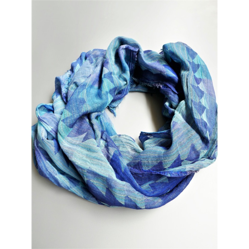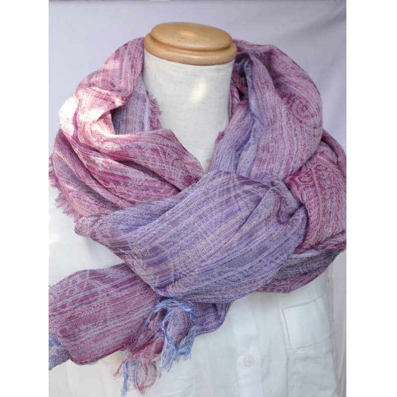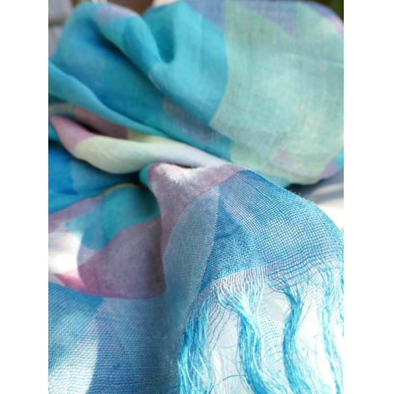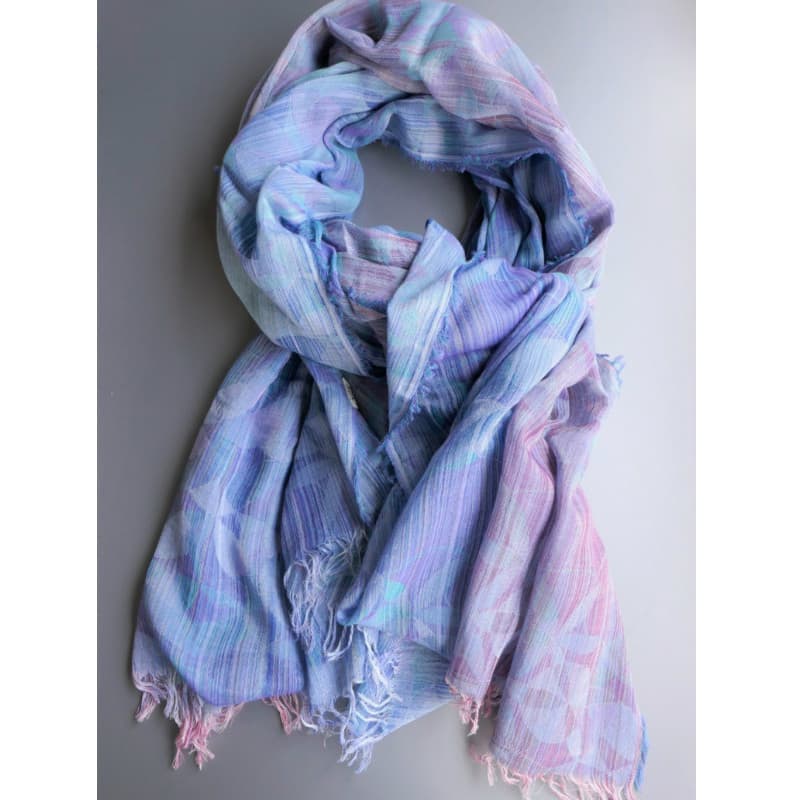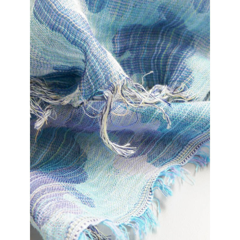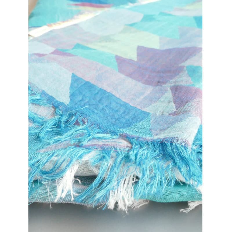 表面、裏面でブルーとパープルの色合いが楽しめる一枚です。何色もの色の糸により柄が浮かび上がります。