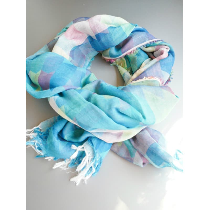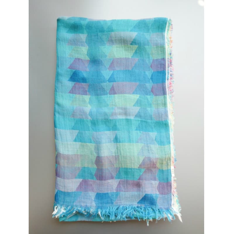 ブルー・グリーン・パープル・ブルーグリーン。これらの色の濃淡がモダンな幾何学模様を作り出しています。一瞬チェック柄に見えますが、もう少し複雑で楽しい柄です。