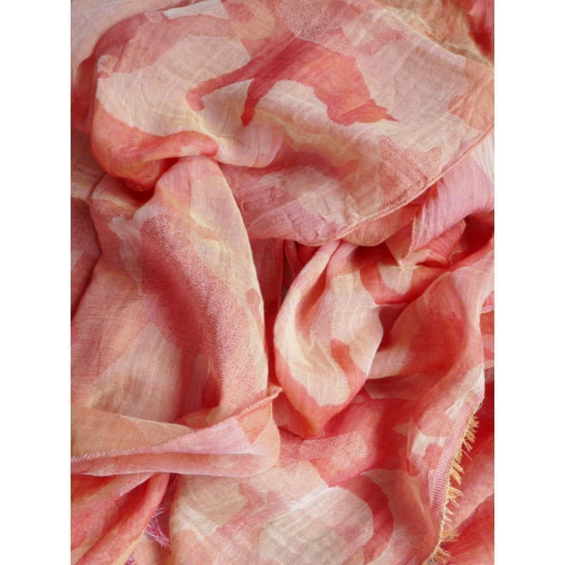 そのため、表面にシャーリング調の起伏が生まれ、肌に纏わりつかない様な素材感になっています。横糸の引きのお陰で柄を微妙に歪ませていて、全体の色合いがフンワリしているのも特徴です。